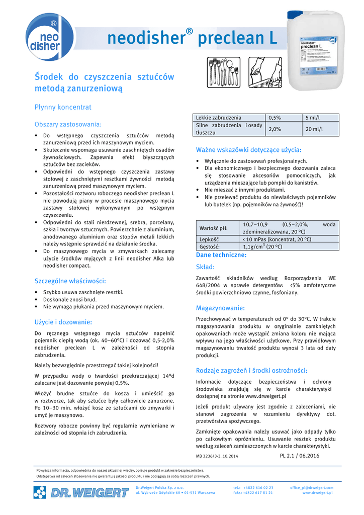 ® neodisher preclean L Środek do czyszczenia sztućców metodą zanurzeniową Płynny koncentrat Obszary zastosowania: • • • • • • Do wstępnego czyszczenia sztućców metodą zanurzeniową przed ich maszynowym myciem. Skutecznie wspomaga usuwanie zaschniętych osadów żywnościowych. Zapewnia efekt błyszczących sztućców bez zacieków. Odpowiedni do wstępnego czyszczenia zastawy stołowej z zaschniętymi resztkami żywności metodą zanurzeniową przed maszynowym myciem. Pozostałości roztworu roboczego neodisher preclean L nie powodują piany w procesie maszynowego mycia zastawy stołowej wykonywanym po wstępnym czyszczeniu. Odpowiedni do stali nierdzewnej, srebra, porcelany, szkła i tworzyw sztucznych. Powierzchnie z aluminium, anodowanego aluminium oraz stopów metali lekkich należy wstępnie sprawdzić na działanie środka. Do maszynowego mycia w zmywarkach zalecamy użycie środków myjących z linii neodisher Alka lub neodisher compact. Szczególne właściwości: • • • Szybko usuwa zaschnięte resztki. Doskonale znosi brud. Nie wymaga płukania przed maszynowym myciem. Użycie i dozowanie: Do ręcznego wstępnego mycia sztućców napełnić pojemnik ciepłą wodą (ok. 40–60°C) i dozować 0,5-2,0% neodisher preclean L w zależności od stopnia zabrudzenia. Należy bezwzględnie przestrzegać takiej kolejności! W przypadku wody o twardości przekraczającej 14°d zalecane jest dozowanie powyżej 0,5%. Włożyć brudne sztućce do kosza i umieścić go w roztworze, tak aby sztućce były całkowicie zanurzone. Po 10–30 min. włożyć kosz ze sztućcami do zmywarki i umyć je maszynowo. Roztwory robocze powinny być regularnie wymieniane w zależności od stopnia ich zabrudzenia. Lekkie zabrudzenia Silne zabrudzenia i osady tłuszczu 0,5% 5 ml/l 2,0% 20 ml/l Ważne wskazówki dotyczące użycia: • • Wyłącznie do zastosowań profesjonalnych. Dla ekonomicznego i bezpiecznego dozowania zaleca się stosowanie akcesoriów pomocniczych, jak urządzenia mieszające lub pompki do kanistrów. Nie mieszać z innymi produktami. Nie przelewać produktu do niewłaściwych pojemników lub butelek (np. pojemników na żywność)! • • 10,7–10,9 (0,5–2,0%, zdemineralizowana, 20 °C) < 10 mPas (koncentrat, 20 °C) 1,1g/cm3 (20 °C) Wartość pH: Lepkość Gęstość: woda Dane techniczne: Skład: Zawartość składników według Rozporządzenia WE 648/2004 w sprawie detergentów: <5% amfoteryczne środki powierzchniowo czynne, fosfoniany. Magazynowanie: Przechowywać w temperaturach od 0° do 30°C. W trakcie magazynowania produktu w oryginalnie zamkniętych opakowaniach może wystąpić zmiana koloru nie mająca wpływu na jego właściwości użytkowe. Przy prawidłowym magazynowaniu trwałość produktu wynosi 3 lata od daty produkcji. Rodzaje zagrożeń i środki ostrożności: Informacje dotyczące bezpieczeństwa i ochrony środowiska znajdują się w karcie charakterystyki dostępnej na stronie www.drweigert.pl Jeżeli produkt używany jest zgodnie z zaleceniami, nie stanowi zagrożenia w rozumieniu dyrektywy dot. przetwórstwa spożywczego. Zamknięte opakowania należy usuwać jako odpady tylko po całkowitym opróżnieniu. Usuwanie resztek produktu według zaleceń zamieszczonych w karcie charakterystyki. MB 3236/3-3_10.2014 PL 2.1 / 06.2016 Powyższa informacja, odpowiednia do naszej aktualnej wiedzy, opisuje produkt w zakresie bezpieczeństwa. Odstępstwa od zaleceń stosowania nie gwarantują jakości produktu i nie pociągają za sobą roszczeń prawnych. Dr.Weigert Polska Sp. z o.o. ul. Wybrzeże Gdyńskie 6A • 01-531 Warszawa tel.: +4822 616 02 23 faks: +4822 617 81 21 [email protected] www.drweigert.pl