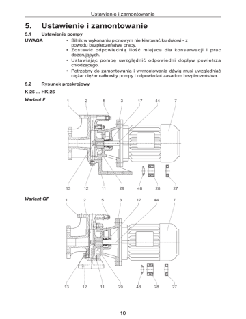 Ustawienie i zamontowanie 5. Ustawienie i zamontowanie 5.1 Ustawienie pompy UWAGA • Silnik w wykonaniu pionowym nie kierowa ku do!owi - z powodu bezpiecze"stwa pracy. • Zostawi odpowiedni# ilo$ miejsca dla konserwacji i prac dozoruj#cych. • Ustawiaj#c pomp% uwzgl%dni odpowiedni dop!yw powietrza ch!odz#cego. • Potrzebny do zamontowania i wymontowania d&wig musi uwzgl%dnia ci%'ar ci%'ar ca!kowity pompy i odpowiada zasadom bezpiecze"stwa. 5.2 Rysunek przekrojowy K 25 ... HK 25 Wariant F Wariant GF 1 2 5 3 17 44 7 13 12 11 29 48 28 27 1 2 5 3 17 44 7 13 12 11 29 48 28 27 10 Ustawienie i zamontowanie K 50 ... HK 50 1 2 5 18 3 17 7 12 11 13 44 48 28 27 K 80 ... HK 80 1 2 11 5 3 18 17 7 19 11 12 13 44 48 28 27 11 Ustawienie i zamontowanie QSH 101 68 74 71 75 69 67 63 17 64 66 70 72 1. 2. 3. 5. 7. 11. 12. 13. Szczegół “X” 17. 18. 19. 20. 27. 28. 29. 44. Szczegół “Y” 48. 63. 64. 66. 67. 68. 69. 70. 71. 72. 73. 74. 75. 73 81. 12 Korpus Wirnik (ciana tylna korek odpowietrzaj#cy Silnik Uszczelnienie korpusu korek gwintowany spustowy Nakr%tka Uszczelnienie mechaniczne Tuleja Pokrywa z urz#dzeniem rozdrabniaj#cym Ko!pak )o'ysko kulkowe )o'ysko kulkowe Tarcza Wa! z rotorem Tarcza labiryntowa Pier$cie" dystansowy Pokrywa uszczelniaj#ca O-ring Uszczelnienie mechaniczne O-ring Korek wlewu Elektroda szczelno$ci Korek odpowietrzaj#cy korek spustowy Olej O-ring Pier$cie" uszczelniaj#cy Pier$cie" uszczelniaj#cy