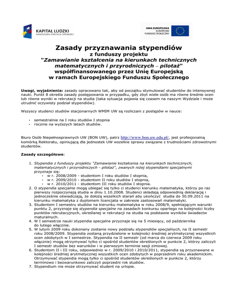 Zasady przyznawania stypendiów z funduszy projektu "Zamawianie kształcenia na kierunkach technicznych matematycznych i przyrodniczych – pilotaŜ" współfinansowanego przez Unię Europejską w ramach Europejskiego Funduszu Społecznego Uwagi, wyjaśnienia: zasady opracowano tak, aby od początku stymulować studentów do intensywnej nauki. Punkt 8 określa zasady postępowania w przypadku, gdy zbyt wiele osób ma równe średnie ocen lub równe wyniki w rekrutacji na studia (taka sytuacja pojawia się czasem na naszym Wydziale i moŜe utrudnić oczywisty podział stypendiów). Wszyscy studenci studiów stacjonarnych WMIM UW są rozliczani z postępów w nauce: • • semestralnie na I roku studiów I stopnia rocznie na wyŜszych latach studiów. Biuro Osób Niepełnosprawnych UW (BON UW), patrz http://www.bon.uw.edu.pl/, jest profesjonalną komórką Rektoratu, opiniującą dla jednostek UW wszelkie sprawy związane z trudnościami zdrowotnymi studentów. Zasady szczegółowe: 1. Stypendia z funduszy projektu "Zamawianie kształcenia na kierunkach technicznych, matematycznych i przyrodniczych - pilotaŜ", zwanych niŜej stypendiami specjalnymi przyznaje się: • w r. 2008/2009 - studentom I roku studiów I stopnia, • w r. 2009/2010 - studentom II roku studiów I stopnia, • w r. 2010/2011 - studentom III roku studiów I stopnia. 2. O stypendia specjalne mogą ubiegać się tylko ci studenci kierunku matematyka, którzy po raz pierwszy rozpoczynają studia w dniu 1.10.2008. Studenci składają odpowiednią deklarację i jednocześnie oświadczają, Ŝe dołoŜą wszelkich starań aby ukończyć studia do 30.09.2011 na kierunku matematyka z dyplomem licencjata w zakresie zastosowań matematyki. 3. Studentom I semestru studiów na kierunku matematyka w roku 2008/9, spełniającym warunki punktu 2, przyznaje się stypendia specjalne na zasadach konkursu opartego na kolejności liczby punktów rekrutacyjnych, określanej w rekrutacji na studia na podstawie wyników świadectw maturalnych. 4. W I semestrze nauki stypendia specjalne przyznaje się na 5 miesięcy, od października do lutego włącznie. 5. W lutym 2009 roku dokonany zostanie nowy podziału stypendiów specjalnych, na II semestr roku 2008/2009. Stypendia zostaną przydzielone w kolejności średniej arytmetycznej wszystkich ocen zdobytych w I semestrze. Stypendia na II semestr (od marca do czerwca 2009 roku włącznie) mogą otrzymywać tylko ci spośród studentów określonych w punkcie 2, którzy zaliczyli I semestr studiów bez warunków i w pierwszym terminie sesji zimowej. 6. Studentom II i III roku, odpowiednio w r. 2009/2010 i 2010/2011, stypendia są przyznawane w kolejności średniej arytmetycznej wszystkich ocen zdobytych w poprzednim roku akademickim. Otrzymywać stypendia mogą tylko ci spośród studentów określonych w punkcie 2, którzy terminowo i bezwarunkowo zaliczyli poprzedni rok studiów. 7. Stypendium nie moŜe otrzymywać student na urlopie. 8. Jeśli nie moŜna jednoznacznie przydzielić właściwej liczby stypendiów specjalnych, bo zbyt wiele osób uzyskało równe średnie ocen lub równą liczbę punktów rekrutacyjnych, to wówczas ustala się ranking osób z równą średnią ocen lub równą liczbą punktów rekrutacyjnych. Wykorzystuje się w tym celu wyłącznie dodatkowe udokumentowane informacje o osiągnięciach w olimpiadach przedmiotowych, ze świadectwa maturalnego i w nauce na WMIM, jednak nie starszych, niŜ 20 miesięcy poprzedzających decyzję. Wydziałowa Komisja Stypendialna podaje ranking i zasadę jego tworzenia do publicznej wiadomości. O przyznaniu stypendium specjalnego rozstrzyga pozycja w rankingu. 9. Decyzję w sprawie przyznania stypendium podejmuje Dziekan WMIM w porozumieniu z Wydziałową Komisją Stypendialną. 10. Wszelkie odstępstwa od punktów 1-8 mogą obejmować wyłącznie przyznanie po zakończonym urlopie zdrowotnym stypendium specjalnego osobie, która rozpoczęła studia stacjonarne I stopnia w dniu 1.10.2008. Odstępstwa takie są moŜliwe jedynie w wyjątkowych, szczególnie uzasadnionych przypadkach, i kaŜdorazowo wymagają pozytywnej opinii BON UW, stwierdzającej przyczyny opóźnienia toku studiów.
