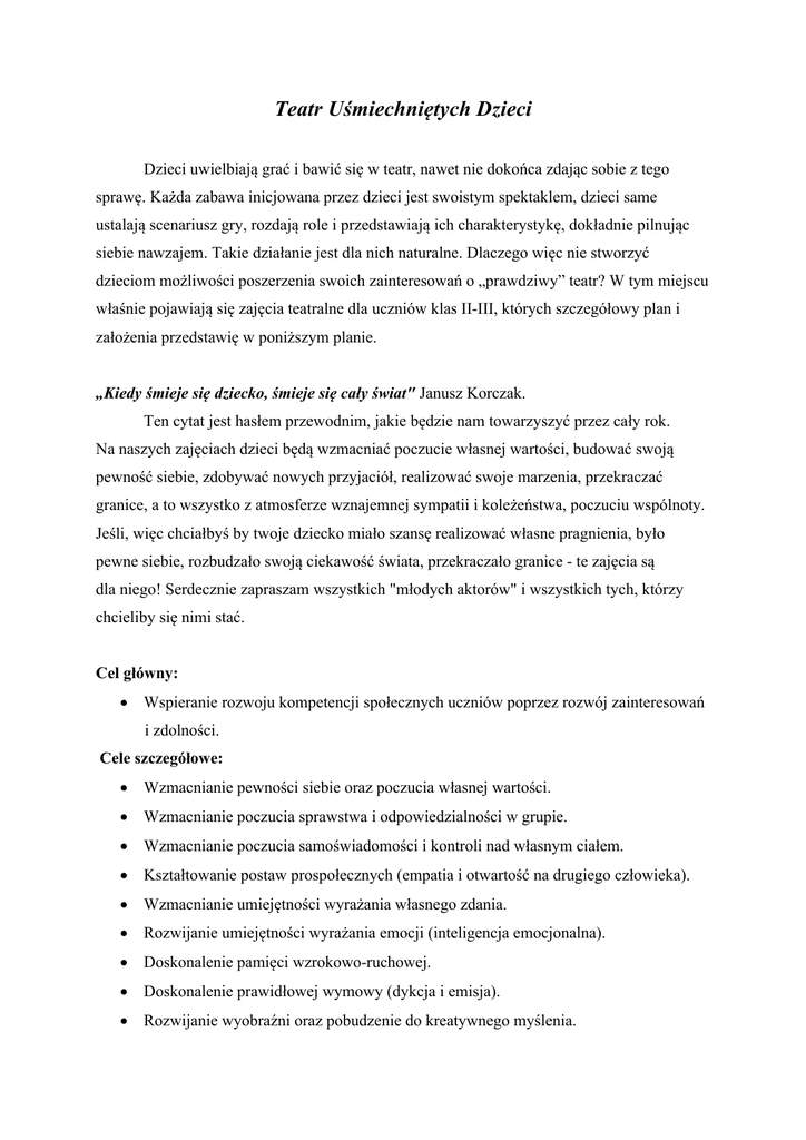 Teatr Uśmiechniętych Dzieci Dzieci uwielbiają grać i bawić się w teatr, nawet nie dokońca zdając sobie z tego sprawę. Każda zabawa inicjowana przez dzieci jest swoistym spektaklem, dzieci same ustalają scenariusz gry, rozdają role i przedstawiają ich charakterystykę, dokładnie pilnując siebie nawzajem. Takie działanie jest dla nich naturalne. Dlaczego więc nie stworzyć dzieciom możliwości poszerzenia swoich zainteresowań o „prawdziwy” teatr? W tym miejscu właśnie pojawiają się zajęcia teatralne dla uczniów klas II-III, których szczegółowy plan i założenia przedstawię w poniższym planie. „Kiedy śmieje się dziecko, śmieje się cały świat" Janusz Korczak. Ten cytat jest hasłem przewodnim, jakie będzie nam towarzyszyć przez cały rok. Na naszych zajęciach dzieci będą wzmacniać poczucie własnej wartości, budować swoją pewność siebie, zdobywać nowych przyjaciół, realizować swoje marzenia, przekraczać granice, a to wszystko z atmosferze wznajemnej sympatii i koleżeństwa, poczuciu wspólnoty. Jeśli, więc chciałbyś by twoje dziecko miało szansę realizować własne pragnienia, było pewne siebie, rozbudzało swoją ciekawość świata, przekraczało granice - te zajęcia są dla niego! Serdecznie zapraszam wszystkich "młodych aktorów" i wszystkich tych, którzy chcieliby się nimi stać. Cel główny: • Wspieranie rozwoju kompetencji społecznych uczniów poprzez rozwój zainteresowań i zdolności. Cele szczegółowe: • Wzmacnianie pewności siebie oraz poczucia własnej wartości. • Wzmacnianie poczucia sprawstwa i odpowiedzialności w grupie. • Wzmacnianie poczucia samoświadomości i kontroli nad własnym ciałem. • Kształtowanie postaw prospołecznych (empatia i otwartość na drugiego człowieka). • Wzmacnianie umiejętności wyrażania własnego zdania. • Rozwijanie umiejętności wyrażania emocji (inteligencja emocjonalna). • Doskonalenie pamięci wzrokowo-ruchowej. • Doskonalenie prawidłowej wymowy (dykcja i emisja). • Rozwijanie wyobraźni oraz pobudzenie do kreatywnego myślenia. Metody pracy: § warsztatowa (ćwiczenia ruchowe, dykcyjne, społeczne), § etiudy aktorskie, § praca z tekstem, § spektakl teatralny, Zaplanowane działania: W ramach zajęć uczestnicy będą mieli możliwość doskonalenia swojego warsztatu małego aktora, poprzez zajęcia i ćwiczenia z ruchu scenicznego, świadomości własnego ciała i miejsca na scenie, poprawnej wymowy (dykcja, emisja). Na takie ćwiczenia przeznaczam pierwsze 2 miesiące (wrzesień-październik), w zależności od postępów pracy w grupie. Następnie, po wyćwiczeniu podstawowych umiejętności, rozpoczniemy pracę nad tekstem jasełek, skupiając się nie tylko na prawidłowej wymowie i intonacji, ale przede wszystkim na interpretacji i wydobyciu z tekstu emocji. Przygotowania zostaną uwieńczone występem dla rodziców i uczniów klas 0-III (listopad-grudzień). W kolejnych miesiącach rozpoczniemy pracę nad tekstem "Kopciuszek" autorstwa Teresy Węgrzyn (scenariusz pochodzi ze strony fabryka-bajek.pl) Powyższe działanie zaplanowałam na kolejne 3 miesiące (styczeń-marzec). W kolejnych miesiącach (kwiecień - czerwiec) oraz rozpoczniemy pracę nad tekstem "Królewna śnieżka i siedmiu krasnoludków" na podstawie, którego uczniowie wystawią spektakl. Dynamika i realizacja założeń planu jest zależna od postępów pracy grupy, oraz czynników losowych, takich jak nieobecność dziecka na zajęciach, choroba prowadzącego, święta i dni wolne od nauki. Ewaluacja: Czynnikami pomagającymi ocenić zakres realizacji założeń będą wpisy w dzienniku zajęć (tematy zajęć, lista obecności), występy artystyczne dzieci, zaplanowane 3 razy w ciągu roku. opiekun: Anita Macyszyn-Zielińska