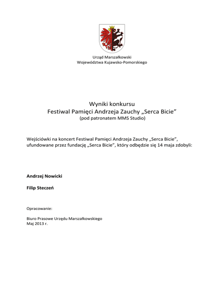 Urząd Marszałkowski Województwa Kujawsko-Pomorskiego Wyniki konkursu Festiwal Pamięci Andrzeja Zauchy „Serca Bicie” (pod patronatem MMS Studio) Wejściówki na koncert Festiwal Pamięci Andrzeja Zauchy „Serca Bicie”, ufundowane przez fundację „Serca Bicie”, który odbędzie się 14 maja zdobyli: Andrzej Nowicki Filip Steczeń Opracowanie: Biuro Prasowe Urzędu Marszałkowskiego Maj 2013 r.