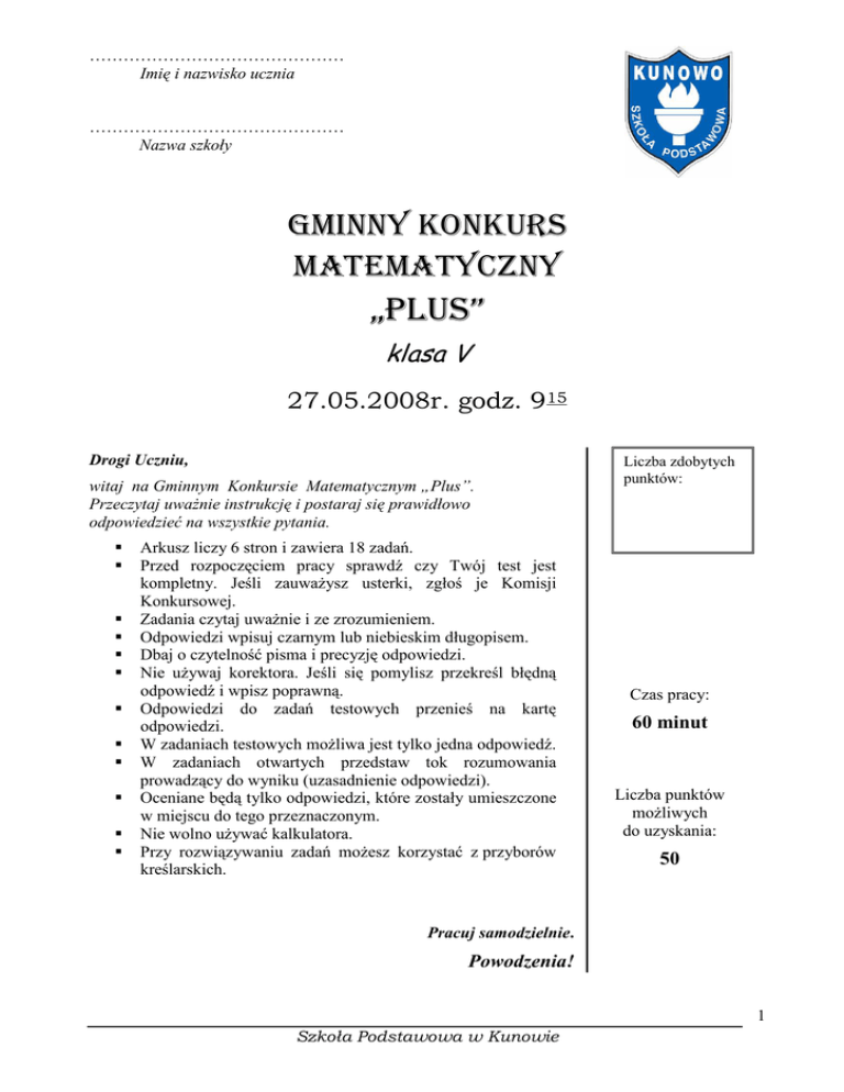 ……………………………………… Imię i nazwisko ucznia ……………………………………… Nazwa szkoły GMINNY KONKURS MATEMATYCZNY „PLUS” klasa V 27.05.2008r. godz. 915 Drogi Uczniu, witaj na Gminnym Konkursie Matematycznym „Plus”. Przeczytaj uwaŜnie instrukcję i postaraj się prawidłowo odpowiedzieć na wszystkie pytania. Arkusz liczy 6 stron i zawiera 18 zadań. Przed rozpoczęciem pracy sprawdź czy Twój test jest kompletny. Jeśli zauwaŜysz usterki, zgłoś je Komisji Konkursowej. Zadania czytaj uwaŜnie i ze zrozumieniem. Odpowiedzi wpisuj czarnym lub niebieskim długopisem. Dbaj o czytelność pisma i precyzję odpowiedzi. Nie uŜywaj korektora. Jeśli się pomylisz przekreśl błędną odpowiedź i wpisz poprawną. Odpowiedzi do zadań testowych przenieś na kartę odpowiedzi. W zadaniach testowych moŜliwa jest tylko jedna odpowiedź. W zadaniach otwartych przedstaw tok rozumowania prowadzący do wyniku (uzasadnienie odpowiedzi). Oceniane będą tylko odpowiedzi, które zostały umieszczone w miejscu do tego przeznaczonym. Nie wolno uŜywać kalkulatora. Przy rozwiązywaniu zadań moŜesz korzystać z przyborów kreślarskich. Liczba zdobytych punktów: Czas pracy: 60 minut Liczba punktów moŜliwych do uzyskania: 50 Pracuj samodzielnie. Powodzenia! 1 Szkoła Podstawowa w Kunowie Zadanie 1. Jedna tona zebranej makulatury pozwala ocalić 17 drzew, których wycięcie byłoby niezbędne do wytworzenia nowego papieru. Ile kilogramów makulatury ocali jedno drzewo? A. 17 kg B. ok. 6 kg C. ok.59 kg D. 100 kg Zadanie 2. Ile wynosi suma miar kątów α i β? A. 220°C B. 180°C C. 160°C D. 320°C Zadanie 3. Przypuśćmy, Ŝe mamy po tyle samo monet. Ile muszę ci ich dać, abyś miał ich o dziesięć więcej ode mnie? A. 6 B. 5 C. 10 D. 4 Zadanie 4. Ola kupiła 5,6kg cukierków po 12,45zł za kilogram. Ile otrzymała reszty, jeśli płaciła banknotem o nominale 100 zł? A. 69,72 zł B. 30,28 zł C. 48,62 zł D. 87,55 zł Zadanie 5. Trójkąt ABC jest trójkątem równoramiennym. Miara kąta ACB wynosi 18°. Jaką miarę moŜe mieć kąt ABC? A. 81° B. 83° C. 162° D. 56° Zadanie 6. Opakowanie kredy szkolnej zawiera 45 kawałków kredy. W szkole jest 15 sal lekcyjnych, w kaŜdej zuŜywa się dziennie około 6 kawałków kredy. Ile opakowań kredy zuŜyje szkoła w ciągu 20 dni? A. 10 B. 90 C. 675 D. 1800 Zadanie 7. Jak zmieni się pole prostokąta o wymiarach 8cm i 3cm, jeŜeli dłuŜszy bok zmniejszymy o 2cm, a krótszy zwiększymy 2 razy? A. zmniejszy się o 36cm2 B. zmniejszy się o 12cm2 C. zwiększy się o 12cm2 D. zwiększy się o 24cm2 2 Szkoła Podstawowa w Kunowie Zadanie 8. Ile jest dwucyfrowych liczb, które po pomnoŜeniu przez 7 dają wynik dwucyfrowy? A. 3 B. 5 C. 6 D. więcej niŜ 8 Zadanie 9. Pięć kur zniosło w ciągu pięciu dni 5 jajek. Dziesięć kur w ciągu 10 dni zniesie jajek: A. 10 B. 25 C. 20 D. 100 Zadanie 10. Połowa pewnego odcinka, jego trzecia część i szósta część dają w sumie 10cm. Jaką długość ma ten odcinek? A. 10 cm B. 20 cm C. 30 cm D. 1 cm Zadanie 11. Jaka jest miara kata x? A. 50° B. 60° C. 70° D. 130° Zadanie 12. Oblicz jaka jest odległość rzeczywista pomiędzy miastami A i B, wiedząc, Ŝe w skali 1:7000000 wynosi ona 5 cm. A. 35 km B. 35000 m C. 350 m D. 350 km Zadanie 13. 3 2 Z beli sukna odcięto 5 m, pozostało jeszcze 1 m. Ile sukna było w tej beli? 4 5 A. 7,15 m B. 7,3 m C. 6,5 m D. 7,25 m Zadanie 14. W regale jest 9 półek. Na najniŜszej stoi 29 ksiąŜek, a na kaŜdej następnej stoi o jedną więcej niŜ na poprzedniej. Ile jest wszystkich ksiąŜek w regale? A. 37 B. 261 C. 297 D. 262 Zadanie 15. Trasa turystyczna ma długość 14km. W jakim czasie pokonają tę odległość uczniowie m klasy V, jeśli będą szli z prędkością 70 ? min A. 2 godz. B. 3 godz. 20 min C. 20 min D. 3 godz. 10 min 3 Szkoła Podstawowa w Kunowie Zadanie 16. Państwo Kowalscy postanowili wyłoŜyć kamiennymi płytami o wymiarach 30 cm × 30 cm prostokątny korytarz o szerokości 2m i długości 6m. Płytki kupuje się na sztuki. Resztki pozostałe po przycinaniu płytek nie nadają się do uŜycia. Ile co najmniej płytek państwo Kowalscy muszą kupić? Zadanie 17. Łukasz przeszedł w ciągu 15 minut 600 metrów, a Bartek przeszedł 0,8 kilometra w ciągu 1 godziny. Kasia uwaŜa, Ŝe gdyby obaj chłopcy szli w swoim tempie przez godzinę, to Bartek 3 pokonałby dłuŜszy odcinek drogi. Czy Kasia ma rację? Odpowiedź uzasadnij. Zadanie 18. Malwina kupiła pod koniec maja pierwsze czereśnie. Za 20dag zapłaciła 1,60zł. W czerwcu czereśnie były juŜ dwa razy tańsze. Ile kosztował 1kg czereśni w czerwcu? 4 Szkoła Podstawowa w Kunowie BRUDNOPIS 5 Szkoła Podstawowa w Kunowie KARTA ODPOWIEDZI Nr Odpowiedzi zadania Punkty 1 A B C D 2 A B C D 3 A B C D 4 A B C D 5 A B C D 6 A B C D 7 A B C D 8 A B C D 9 A B C D 10 A B C D 11 A B C D 12 A B C D 13 A B C D 14 A B C D 15 A B C D 16 17 18 Razem: 6 Szkoła Podstawowa w Kunowie