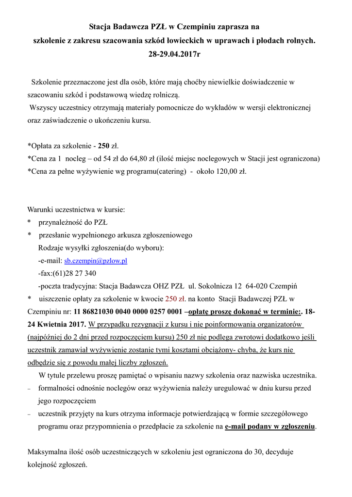 Stacja Badawcza PZŁ w Czempiniu zaprasza na szkolenie z zakresu szacowania szkód łowieckich w uprawach i płodach rolnych. 28-29.04.2017r Szkolenie przeznaczone jest dla osób, które mają choćby niewielkie doświadczenie w szacowaniu szkód i podstawową wiedzę rolniczą. Wszyscy uczestnicy otrzymają materiały pomocnicze do wykładów w wersji elektronicznej oraz zaświadczenie o ukończeniu kursu. *Opłata za szkolenie - 250 zł. *Cena za 1 nocleg – od 54 zł do 64,80 zł (ilość miejsc noclegowych w Stacji jest ograniczona) *Cena za pełne wyżywienie wg programu(catering) - około 120,00 zł. Warunki uczestnictwa w kursie: * przynależność do PZŁ * przesłanie wypełnionego arkusza zgłoszeniowego Rodzaje wysyłki zgłoszenia(do wyboru): -e-mail: [email protected] -fax:(61)28 27 340 -poczta tradycyjna: Stacja Badawcza OHZ PZŁ ul. Sokolnicza 12 64-020 Czempiń * uiszczenie opłaty za szkolenie w kwocie 250 zł. na konto Stacji Badawczej PZŁ w Czempiniu nr: 11 86821030 0040 0000 0257 0001 –opłatę proszę dokonać w terminie:. 1824 Kwietnia 2017. W przypadku rezygnacji z kursu i nie poinformowania organizatorów (najpóźniej do 2 dni przed rozpoczęciem kursu) 250 zł nie podlega zwrotowi dodatkowo jeśli uczestnik zamawiał wyżywienie zostanie tymi kosztami obciążony- chyba, że kurs nie odbędzie się z powodu małej liczby zgłoszeń. W tytule przelewu proszę pamiętać o wpisaniu nazwy szkolenia oraz nazwiska uczestnika. formalności odnośnie noclegów oraz wyżywienia należy uregulować w dniu kursu przed jego rozpoczęciem uczestnik przyjęty na kurs otrzyma informacje potwierdzającą w formie szczegółowego programu oraz przypomnienia o przedpłacie za szkolenie na e-mail podany w zgłoszeniu. Maksymalna ilość osób uczestniczących w szkoleniu jest ograniczona do 30, decyduje kolejność zgłoszeń. Program 28.04.2017 - Piątek godz. 09.00-10.00- przyjazd uczestników i zakwaterowanie 10.00-14.00 dr hab. Marian Flis Obowiązujące akty prawne w zakresie odpowiedzialności oraz szacowania szkód w uprawach i płodach rolnych: Omówienie Rozporządzenia Ministra Środowiska z dnia 8.03.2010 r. w sprawie sposobu postępowania przy szacowaniu szkód oraz wypłat odszkodowań za szkody w uprawach i płodach rolnych, Omówienie dokumentacji związanej z prawidłowym przebiegiem szacowania szkód, przepływu informacji oraz ewentualnego przygotowania dokumentacji pod kątem procesów sądowych, Omówienie zasadniczych zmian w procedowanej ustawie prawo łowieckie (zmiana podmiotu szacującego szkody, Fundusz Odszkodowawczy, opinia rzeczoznawcy itp.). 14.00-15.00 - Obiad 15.00-18.30 - ciąg dalszy wykładów – dr hab. Marian Flis Szkody Łowieckie w uprawach roślin zbożowych, Szkody Łowieckie w uprawach kukurydzy, zbiór na kiszonkę (zielonkę), zbiór na ziarno, inne kierunki użytkowania. 18.30-20.00 - Ochrona pól przed zwierzyną – dr hab. Marian Flis Możliwości ograniczenia szkód w uprawach rolnych, wyrządzonych przez dziki i zwierzynę płową, Ograniczenia penetracji pół przez zwierzynę, ochrona upraw rolnych, Środki wykorzystywane do prewencji przed szkodami. 20.00-Kolacja 29.04.2017 – Sobota godz. 7.00-7.30 –Śniadanie godz. 7.30-13.00- dr hab. Marian Flis Szkody Łowieckie w uprawach: ziemniaków i buraków cukrowych, Szkody Łowieckie na użytkach zielonych, Szkody Łowieckie w poplonach ścierniskowych i ozimych, Szkody Łowieckie w uprawach roślin nietypowych – specjalnych, 13.00-14.00- Obiad 14.00-16.00 dr hab. Marian Flis Praktyczne aspekty związane z szacowaniem szkód łowieckich FORMULARZ ZGŁOSZENIOWY POLSKI ZWIĄZEK ŁOWIECKI STACJA BADAWCZA OŚRODEK HODOWLI ZWIERZYNY ZG PZŁ 64-020 CZEMPIŃ, tel. +48 61 2826563-4, ul. Sokolnicza 12 fax: +48 61 2827340, ZGŁOSZENIE UDZIAŁU W KURSIE e-mail: [email protected] www.czempin.pzlow.pl Z ZAKRESU SZACOWANIA SZKÓD ŁOWIECKICH W UPRAWACH I PŁODACH ROLNYCH 28-29.04.2017r 1. DANE UCZESTNIKA SZKOLENIA (PROSIMY O WYPEŁNIENIE BIAŁYCH RUBRYK DUŻYMI DRUKOWANYMI LITERAMI) * NAZWISKO I IMIĘ : * NR LEGITYMACJI PZŁ : ADRES : * TEL KONTAKTOWY : ADRES E-MAIL *: NR i NAZWA KOŁA ŁOWIECKIEGO : *wymagane 2. ZAKWATEROWANIE, WYŻYWIENIE (PROSIMY O ZAZNACZENIE WŁAŚCIWEGO POLA POPRZEZ WSTAWIENIE ZNAKU „X”) ZAMAWIAM: PEŁNE WYŻYWIENIE TAK [ ] NIE Rezerwacja noclegu w SB Czempiń- (ilość miejsc noclegowych w Stacji Badawczej jest ograniczonakwaterowanie w pokojach 2 i 3 osobowych z innymi uczestnikami kursu) TAK [ ] NIE [ ] 3. FORMA ROZLICZENIA (PROSIMY O ZAZNACZENIE WŁAŚCIWEGO POLA POPRZEZ WSTAWIENIE ZNAKU „X”) FAKTURA VAT PARAGON 4. DANE PŁATNIKA - DO WYSTAWIENIA FAKTURY (PROSIMY O WYPEŁNIENIE BIAŁYCH RUBRYK DUŻYMI DRUKOWANYMI LITERAMI ) NAZWA KOŁA/FIRMY: ADRES: NIP: TELEFON: ADRES E-MAIL: FAKS: (MIEJSCE I DATA) PIECZĘĆ FIRMY I PODPISY