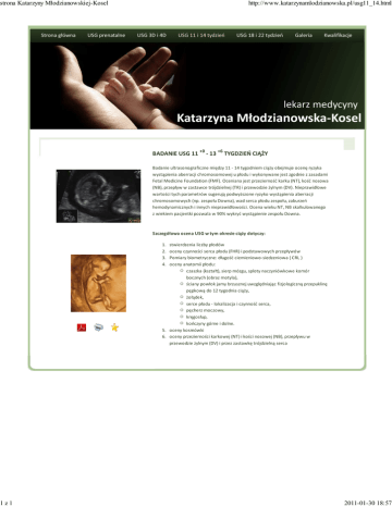 strona Katarzyny Młodzianowskiej-Kosel 1z1 http://www.katarzynamlodzianowska.pl/usg11_14.html BADANIE USG 11 +0 - 13 +6 TYGDZIEŃ CIĄŻY Badanie ultrasonograficzne między 11 - 14 tygodniem ciąży obejmuje ocenę ryzyka wystąpienia aberracji chromosomowej u płodu i wykonywane jest zgodnie z zasadami Fetal Medicine Foundation (FMF). Oceniana jest przezierność karku (NT), kość nosowa (NB), przepływ w zastawce trójdzielnej (TR) i przewodzie żylnym (DV). Nieprawidłowe wartości tych parametrów sugerują podwyższone ryzyko wystąpienia aberracji chromosomowych (np. zespołu Downa), wad serca płodu zespołu, zaburzeń hemodynamicznych i innych nieprawidłowości. Ocena wieku NT, NB skalkulowanego z wiekiem pacjentki pozwala w 90% wykryć wystąpienie zespołu Downa. Szczegółowa ocena USG w tym okresie ciąży dotyczy: 1. 2. 3. 4. stwierdzenia liczby płodów oceny czynności serca płodu (FHR) i podstawowych przepływów Pomiary biometryczne: długość ciemieniowo-siedzeniowa ( CRL ) oceny anatomii płodu: czaszka (kształt), sierp mózgu, sploty naczyniówkowe komór bocznych (obraz motyla), ściany powłok jamy brzusznej uwzględniając fizjologiczną przepuklinę pępkową do 12 tygodnia ciąży, żołądek, serce płodu - lokalizacja i czynność serca, pęcherz moczowy, kręgosłup, kończyny górne i dolne. 5. oceny kosmówki 6. oceny przezierności karkowej (NT) i kości nosowej (NB), przepływu w przewodzie żylnym (DV) i przez zastawkę trójdzielną serca 2011-01-30 18:57