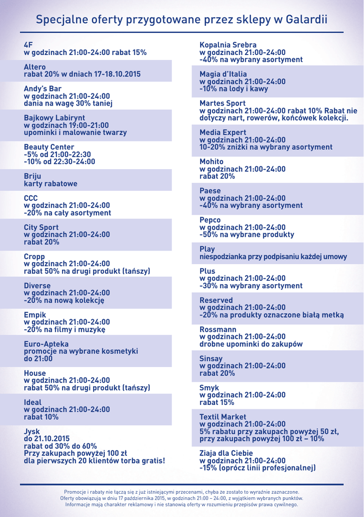 Specjalne oferty przygotowane przez sklepy w Galardii 4F w godzinach 21:00-24:00 rabat 15% Altero rabat 20% w dniach 17-18.10.2015 Andy’s Bar w godzinach 21:00-24:00 dania na wagę 30% taniej Bajkowy Labirynt w godzinach 19:00-21:00 upominki i malowanie twarzy Beauty Center -5% od 21:00-22:30 -10% od 22:30-24:00 Briju karty rabatowe CCC w godzinach 21:00-24:00 -20% na cały asortyment City Sport w godzinach 21:00-24:00 rabat 20% Cropp w godzinach 21:00-24:00 rabat 50% na drugi produkt (tańszy) Diverse w godzinach 21:00-24:00 -20% na nową kolekcję Empik w godzinach 21:00-24:00 -20% na filmy i muzykę Euro-Apteka promocje na wybrane kosmetyki do 21:00 House w godzinach 21:00-24:00 rabat 50% na drugi produkt (tańszy) Ideal w godzinach 21:00-24:00 rabat 10% Jysk do 21.10.2015 rabat od 30% do 60% Przy zakupach powyżej 100 zł dla pierwszych 20 klientów torba gratis! Kopalnia Srebra w godzinach 21:00-24:00 -40% na wybrany asortyment Magia d’Italia w godzinach 21:00-24:00 -10% na lody i kawy Martes Sport w godzinach 21:00-24:00 rabat 10% Rabat nie dotyczy nart, rowerów, końcówek kolekcji. Media Expert w godzinach 21:00-24:00 10-20% zniżki na wybrany asortyment Mohito w godzinach 21:00-24:00 rabat 20% Paese w godzinach 21:00-24:00 -40% na wybrany asortyment Pepco w godzinach 21:00-24:00 -50% na wybrane produkty Play niespodzianka przy podpisaniu każdej umowy Plus w godzinach 21:00-24:00 -30% na wybrany asortyment Reserved w godzinach 21:00-24:00 -20% na produkty oznaczone białą metką Rossmann w godzinach 21:00-24:00 drobne upominki do zakupów Sinsay w godzinach 21:00-24:00 rabat 20% Smyk w godzinach 21:00-24:00 rabat 15% Textil Market w godzinach 21:00-24:00 5% rabatu przy zakupach powyżej 50 zł, przy zakupach powyżej 100 zł – 10% Ziaja dla Ciebie w godzinach 21:00-24:00 -15% (oprócz linii profesjonalnej) Promocje i rabaty nie łączą się z już istniejącymi przecenami, chyba że zostało to wyraźnie zaznaczone. Oferty obowiązują w dniu 17 października 2015, w godzinach 21:00 – 24:00, z wyjątkiem wybranych punktów. Informacje mają charakter reklamowy i nie stanowią oferty w rozumieniu przepisów prawa cywilnego.