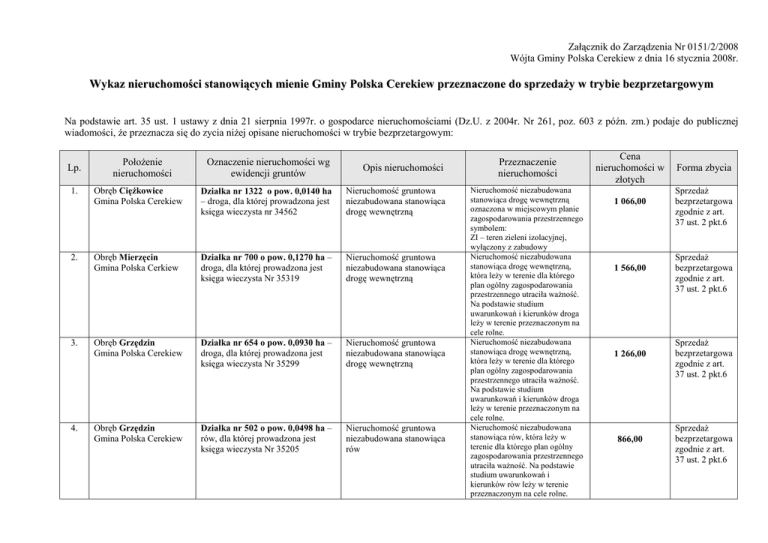 Załącznik do Zarządzenia Nr 0151/2/2008 Wójta Gminy Polska Cerekiew z dnia 16 stycznia 2008r. Wykaz nieruchomości stanowiących mienie Gminy Polska Cerekiew przeznaczone do sprzedaŜy w trybie bezprzetargowym Na podstawie art. 35 ust. 1 ustawy z dnia 21 sierpnia 1997r. o gospodarce nieruchomościami (Dz.U. z 2004r. Nr 261, poz. 603 z późn. zm.) podaje do publicznej wiadomości, Ŝe przeznacza się do zycia niŜej opisane nieruchomości w trybie bezprzetargowym: Lp. 1. 2. 3. 4. PołoŜenie nieruchomości Oznaczenie nieruchomości wg ewidencji gruntów Opis nieruchomości Obręb CięŜkowice Gmina Polska Cerekiew Działka nr 1322 o pow. 0,0140 ha – droga, dla której prowadzona jest księga wieczysta nr 34562 Nieruchomość gruntowa niezabudowana stanowiąca drogę wewnętrzną Obręb Mierzęcin Gmina Polska Cerkiew Działka nr 700 o pow. 0,1270 ha – droga, dla której prowadzona jest księga wieczysta Nr 35319 Nieruchomość gruntowa niezabudowana stanowiąca drogę wewnętrzną Obręb Grzędzin Gmina Polska Cerekiew Działka nr 654 o pow. 0,0930 ha – droga, dla której prowadzona jest księga wieczysta Nr 35299 Nieruchomość gruntowa niezabudowana stanowiąca drogę wewnętrzną Obręb Grzędzin Gmina Polska Cerekiew Działka nr 502 o pow. 0,0498 ha – rów, dla której prowadzona jest księga wieczysta Nr 35205 Nieruchomość gruntowa niezabudowana stanowiąca rów Przeznaczenie nieruchomości Nieruchomość niezabudowana stanowiąca drogę wewnętrzną oznaczona w miejscowym planie zagospodarowania przestrzennego symbolem: ZI – teren zieleni izolacyjnej, wyłączony z zabudowy Nieruchomość niezabudowana stanowiąca drogę wewnętrzną, która leŜy w terenie dla którego plan ogólny zagospodarowania przestrzennego utraciła waŜność. Na podstawie studium uwarunkowań i kierunków droga leŜy w terenie przeznaczonym na cele rolne. Nieruchomość niezabudowana stanowiąca drogę wewnętrzną, która leŜy w terenie dla którego plan ogólny zagospodarowania przestrzennego utraciła waŜność. Na podstawie studium uwarunkowań i kierunków droga leŜy w terenie przeznaczonym na cele rolne. Nieruchomość niezabudowana stanowiąca rów, która leŜy w terenie dla którego plan ogólny zagospodarowania przestrzennego utraciła waŜność. Na podstawie studium uwarunkowań i kierunków rów leŜy w terenie przeznaczonym na cele rolne. Cena nieruchomości w złotych 1 066,00 1 566,00 1 266,00 866,00 Forma zbycia SprzedaŜ bezprzetargowa zgodnie z art. 37 ust. 2 pkt.6 SprzedaŜ bezprzetargowa zgodnie z art. 37 ust. 2 pkt.6 SprzedaŜ bezprzetargowa zgodnie z art. 37 ust. 2 pkt.6 SprzedaŜ bezprzetargowa zgodnie z art. 37 ust. 2 pkt.6 5. Obręb Wronin Gmina Polska Cerekiew Działka nr 174 o pow. 0,2100 ha – droga, dla której prowadzona jest księga wieczysta Nr 35342 Nieruchomość gruntowa niezabudowana stanowiąca drogę wewnętrzną Nieruchomość niezabudowana stanowiąca drogę wewnętrzną, która leŜy w terenie dla którego plan ogólny zagospodarowania przestrzennego utraciła waŜność. Na podstawie studium uwarunkowań i kierunków droga leŜy w terenie przeznaczonym na cele rolne. 2 366,00 SprzedaŜ bezprzetargowa zgodnie z art. 37 ust. 2 pkt.6 Wykaz wywieszono na tablicy ogłoszeń siedziby Urzędu Gminy w Polskiej Cerekwi przy ul. Raciborskiej 4 na okres 21 dni tj. od dnia 17.01.2008r. do dnia 06.02.2008r. Osoby, którym przysługuje pierwszeństwo w nabyciu nieruchomości na podstawie art. 34 ust. 1 pkt.1 i pkt.2 ustawy o gospodarce nieruchomościami winny złoŜyć stosowny wniosek w terminie 6 tygodni, licząc od dnia wywieszenia niniejszego wykazu.