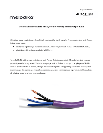 Białystok 25.11.2014 Melodika: nowe kable zasilające i bi-wiring z serii Purple Rain Melodika, jeden z największych polskich producentów kabli klasy hi-fi poszerza ofertę serii Purple Rain o nowe kable: • zasilające o przekroju 3x1.5mm oraz 3x2.5mm o symbolach MDC3150 oraz MDC3250, • głośnikowe bi-wiring o symbolu MDC2415. Nowe kable bi-wiring oraz zasilające z serii Purple Rain to odpowiedź Melodiki na stale rosnącą sprzedaż produktów tej marki. Posiadacze sprzętu hi-fi w Polsce oczekują i chcą kupować kable, które są produkowane w Polsce, dlatego Melodika uzupełnia swoją ofertę zarówno o rozwiązania skierowanego do szerokiego rynku konsumenckiego, jak i o rozwiązania typowo audiofilskie, takie jak właśnie kable bi-wiring oraz zasilające. Najważniejsze cechy nowego kabla zasilającego Melodika z serii Purple Rain: • przewodnik: polska miedź beztlenowa OFC 99.99% (klasa 4N) • oplot z czystej miedzi na poziomie minimum 80% • konstrukcja: 3x2.5mm - 50 x 0.24mm dla MDC3250 lub 3x1.5mm – 30 x 0.24mm dla MDC3150 • geometria: przewodniki wzajemnie ze sobą skręcone, ekranowane • dielektryk: 3 warstwy izolacji • produkcja Made in Poland • cena: od 22zł / metr bieżący Najważniejsze cechy nowego kabla głośnikowego bi-wiring Melodika z serii Purple Rain: • przewodnik: polska miedź beztlenowa OFC 99.99% (klasa 4N) • konstrukcja bi-wiring zróżnicowana dla sekcji wysokotonowej: 2x1.5mm oraz średnioniskotonowej: 2x4mm z technologią BassCore • izolacja: podwójna wykonana z PVC • produkcja Made in Poland • cena: od 45zł / metr bieżacy Więcej informacji: www.melodika.pl www.rafko.com Dodatkowych informacji udziela: Andrzej Lemański e-mail: [email protected] tel. (85) 747 97 58 W kwestiach technicznych produktów Melodika: Rafał Koc e-mail: [email protected]