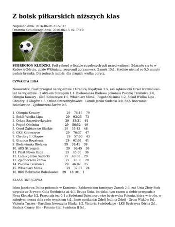 Z boisk piłkarskich niższych klas Napisano dnia: 2016-06-05 21:57:45 Ostatnia aktualizacja dnia: 2016-06-13 15:17:10 SUBREGION KŁODZKI. Padł rekord w liczbie strzelonych goli przeciwnikowi. Zdarzyło się to w Kudowie-Zdroju, gdzie Włókniarz rozgromił gorzanowski Zamek 15:1. Średnio niemal co 5,5 minuty padała bramka. Dla jednych radość, dla drugich wielka gorycz. CZWARTA LIGA Noworudzki Piast przegrał na wyjeździe z Granicą Bogatynia 3:5, zaś ząbkowicki Orzeł zremisował też na wyjeździe - z AKS-em Strzegom 1:1. Bielawianka Bielawa pokonała Polonię Trzebnica 2:0, Olimpia Kowary - GKS Kobierzyce 1:0, Włókniarz Mirsk - Pogoń Oleśnica 1:2, Sokół Wielka Lipa Chrobry II Głogów 4:3, Orkan Szczedrzykowice - Lotnik Jeżów Sudecki 3:0, BKS Bobrzanie Bolesławiec - Zjednoczeni Żarów 0:3. 1. Olimpia Kowary 2. Sokół Wielka Lipa 3. Orkan Szczedrzykowice 4. Pogoń Oleśnica 5. Orzeł Ząbkowice Śląskie 6. GKS Kobierzyce 7. Chrobry II Głogów 8. Granica Bogatynia 9. Bielawianka Bielawa 10. AKS Strzegom 11. Piast Nowa Ruda 12. Lotnik Jeżów Sudecki 13. Zjednoczeni Żarów 14. Polonia Trzebnica 15. Włókniarz Mirsk 16. BKS Bobrzanie Bolesławiec 29 76:15 79 29 93:25 73 29 83:31 61 29 56:52 49 29 55:43 48 29 76:37 47 29 57:50 43 29 62:64 41 29 38:41 39 29 36:45 36 29 45:60 36 29 49:68 29 29 39:80 28 29 46:82 25 29 37:67 24 29 13:101 1 KLASA OKRĘGOWA Iskra Jaszkowa Dolna pokonała w Kamieńcu Ząbkowickim tamtejszy Zamek 2:3, zaś Unia Złoty Stok wygrała ze Zrywem Gola Świdnicka aż 4:1. Druga Unia, bardzka, tym razem u siebie przegrała z Nysą Kłodzko 1:2. Przegrała też 0:1 z Sudetami Dziećmorowice bystrzycka Polonia, która w środę, w zaległym meczu dała radę wynikiem 4:2 . Inne spotkania: Zdrój Jedlina-Zdrój - Grom Witków 5:1, Victoria Tuszyn - Karolina Jaworzyna Śląska 1:2, Victoria Świebodzice - LKS Bystrzyca Górna 2:1, Skalnik Czarny Bór - Polonia-Stal Świdnica II 5:1. 1. Unia Bardo 29 2. Victoria Świebodzice 29 3. Karolina Jaworzyna Śl. 29 4. LKS Bystrzyca Górna 29 5. Zdrój Jedlina-Zdrój 29 6. Nysa Kłodzko 29 7. Unia Złoty Stok 29 8. Zryw Gola Świdnicka 29 9. Victoria Tuszyn 29 10. Zamek Kamieniec Z. 29 11. Grom Witków 29 12. Iskra Jaszkowa Dolna 29 13. Polonia-Stal II Świdnica 29 14. Skalnik Czarny Bór 29 15. Polonia Bystrzyca Kł. 29 16. Sudety Dziećmorowice 29 105:29 73 78:10 73 70:45 61 64:34 59 65:47 51 53:40 46 46:39 44 61:58 41 48:55 39 43:54 29 53:106 28 36:58 26 39:63 25 45:91 24 38:66 23 35:84 21 KLASA A Grupa II Tarnovia Tarnów - Zieloni Łagiewniki 2:6, Skałki Stolec - Boxmet Piskorzów 5:3, Klubokawiarnia Roztocznik - Czarni Sieniawka 3:3, Orzeł Piława Dolna - Płomień Makowice 2:3, Sparta Ziębice Delta Słupice 4:1, Polonia Ząbkowice Śląskie - Henrykowianka Henryków 2:3, Pogoń Pieszyce Koliber Uciechów 4:1, Piławianka Piława Górna - Niemczanka Niemcza 1:2. 1. Piławianka Piława Górna 29 133:25 76 2. Niemczanka Niemcza 29 103:33 70 3. Pogoń Pieszyce 29 62:34 61 4. Sparta Ziębice 29 75:45 56 5. Skałki Stolec 29 83:50 51 6. Klubokawiarnia Roztocznik 29 68:58 49 7. Delta Słupice 29 56:91 38 8. Henrykowianka Henryków 29 53:63 37 9. Polonia Ząbkowice Śląskie 29 63:72 36 10. Zieloni Łagiewniki 29 62:60 33 11. Koliber Uciechów 29 41:57 32 12. Czarni Sieniawka 29 50:84 30 13. Boxmet Piskorzów 29 44:78 28 14. Płomień Makowice 29 59:82 28 15. Orzeł Piława Dolna 29 46:84 28 16. Tarnovia Tarnów 29 46:128 18 Grupa III Włókniarz Kudowa-Zdrój - Zamek Gorzanów 15:1, Tęcza Ścinawka Dolna - Cis Brzeźnica 1:3, Śnieżnik Domaszków - Inter Ożary 4:1, MLKS Radków - Kryształ Stronie Śląskie 0:3 (w.), KS Polanica-Zdrój - Łomniczanka Stara Łomnica 4:1, Pogoń Duszniki-Zdrój - Hutnik Szczytna 1:0, Orlęta Krosnowice - Odrodzenie Szalejów Dolny 1:2, pauzował LKS Bierkowice. 1. Orlęta Krosnowice 2. Pogoń Duszniki-Zdrój 27 89:25 27 73:31 79 56 3. Śnieżnik Domaszków 4. Włókniarz Kudowa-Zdrój 5. Hutnik Szczytna 6. Kryształ Stronie Śl. 7. LKS Bierkowice 8. KS Polanica-Zdrój 9. Cis Brzeźnica 10. Odrodzenie Szalejów D. 11. Zamek Gorzanów 12. Łomniczanka St. Łomnica 13. Inter Ożary 14. Tęcza Ścinawka Dolna 15. MLKS Radków 27 94:42 27 89:43 27 65:51 27 78:47 27 53:47 27 53:49 27 44:52 27 54:80 27 54:75 27 57:83 27 42:60 27 23:108 27 21:96 55 50 50 49 41 41 33 32 31 27 26 16 12 KLASA B Grupa I Czermna Kudowa-Zdrój - ATS Wojbórz 1:1, Granica Tłumaczó - Zrzeszeni Niwa 3:1, Huragan Bożków - Zamek Trzebieszowice 2:3, Lechia Ołdrzychowice - LKS Wambierzyce 0:3, Słowianin Wolibórz Sparta Stary Waliszów 6:1, pauzowały Sudety Międzylesie. 1. LKS Wambierzyce 2. Sudety Międzylesie 3. Słowianin Wolibórz 4. ATS Wojbórz 5. Czermna Kudowa-Zdrój 6. Zamek Trzebieszowice 7. Huragan Bożków 8. Granica Tłumaczów 9. Sparta Stary Waliszów 10. Lechia Ołdrzychowice 11. Zrzeszeni Niwa 19 63:16 46 19 87:22 44 19 76:25 43 19 32:46 19 19 55:47 32 19 35:44 25 19 50:55 24 19 31:56 20 19 21:63 12 20 23:50 11 19 20:69 7 Grupa II Harnaś Starczówek - Kłos Laski 3:0 (w.), Zamek II Kamieniec Ząbkowicki - Piasek Potworów 7:0, Orzeł Mąkolno - Victoria Dębowiec 3:4, Błękitni Niedźwiedź - Ślęża Ciepłowody 1:7, Przedborowianka Przedborowa - Sparta II Ziębice 1:6, Czarni Braszowice - Znicz Lubnów 4:5, Wieża Rudnica - Spartakus Byczeń - mecz nie odbył się z powodu absencji gości, pauzowała Perła Płonica. 1. Błękitni Niedźwiedź 2. Harnaś Starczówek 3. Zamek II Kamieniec Z. 4. Ślęża Ciepłowody 5. Wieża Rudnica 6. Victoria Dębowiec 7. Znicz Lubnów 8. Czarni Braszowice 9. Sparta II Ziębice 10. Perła Płonica 11. Spartakus Byczeń 27 89:46 27 81:44 27 78:51 27 84:40 26 67:48 27 83:67 27 68:66 27 75:60 27 69:64 27 77:81 26 72:82 62 61 54 54 46 44 39 39 35 35 33 12. Orzeł Mąkolno 27 82:97 31 13. Piasek Potworów 27 47:101 23 14. Przedborowianka P. 28 35:122 8 15. Kłos Laski 27 32:70 18