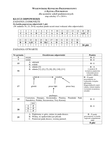 WOJEWÓDZKI KONKURS PRZEDMIOTOWY Z JĘZYKA POLSKIEGO dla uczniów szkół podstawowych etap szkolny 15 x 2014 r. KLUCZ ODPOWIEDZI ZADANIA ZAMKNIĘTE Za każdą poprawną odpowiedź 1 pkt (W zadaniu 18, 23, 26 by uzyskać punkt uczeń musi wskazać obie odpowiedzi) 1 C 1 2 A 1 21 B 1 22 B 1 3 A 1 4 D 1 6 C 1 8 C 1 9 A 1 10 A 1 11 B 1 12 C 1 13 A 1 14 C 1 23 24 A,D C 1 1 25 D 1 26 B,C 1 27 A 1 30 D 1 31 A 1 32 A 1 33 C 1 34 B 1 18 A,B 1 20 C 1 26 pkt ZADANIA OTWARTE Nr pytania 5 7 15 16 Oczekiwane odpowiedzi swym wieść A. B. A. B. odcinek widok zdanie [3] zdania [1], [2], [7], [8], [9], [10], [11] szlak górski 17 19 28 29 Punkty 0-1 0-1 0-1 0–1 w punkcie B wystarczy poprawne wskazanie przez ucznia 1 zdania 0 – 1 punkt wiedzie przez łąki przez lasy pachnące Czorsztyn, Dunajec, Krościenko, Pieniny, Pieniński Park Narodowy, Polska, Szczawnica, Trzy Korony A B C P/F F P F A. Pójdziemy w góry, mimo że pada deszcz. B. Widzę, że spakowałeś już plecak. C. Ponieważ pada deszcz, wezmę parasol. przyznajemy za wskazanie związku głównego, drugorzędnych części zdania, relacji między wyrazami za pomocą strzałek 0-1 0-1 0 – 1 punkt przyznajemy za każde, logiczne uzupełnienie zdań 8 pkt DYKTANDO Za każdy poprawnie zapisany wyraz 1 pkt 35 nie w porę 36 zorientowałem 37 przysporzyli 38 nie brakowało 39 urządzono 40 można by 41 błahostka 42 wytężali 43 44 ceremonii 45 instruktaż 46 czary-mary 47 ciemnoszary 48 zdążył 49 zmrużyć 50 czym prędzej 51 czmychnął 52 półobrót 53 wzwyż 54 zażenowanie 55 Czarny Ląd 56 marzyłem 57 kontynent próżnował 58 chybiłem 60 nadwyrężyłem Uczeń może zdobyć za cały test 60 punktów. 65% punktów możliwych do uzyskania na etapie szkolnym, to jest: 39 punktów. 59 niepohamowanego 26 pkt