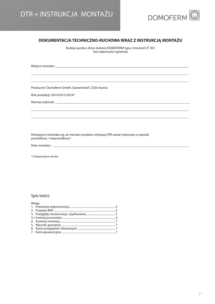 DTR + Instrukcja montażu DOKUMENTACJA TECHNICZNO-RUCHOWA WRAZ Z INSTRUKCJĄ MONTAŻU Rodzaj wyrobu: drzwi stalowe DOMOFERM typu: Universal UT 401 bez odporności ogniowej Miejsce montażu: __________________________________________________________________________________ _________________________________________________________________________________________________ _________________________________________________________________________________________________ Producent: Domoferm GmbH, Gänserndorf, 2230 Austria Rok produkcji: 2014/2015/2016* Montaż wykonał: ___________________________________________________________________________________ _________________________________________________________________________________________________ _________________________________________________________________________________________________ Niniejszym stwierdza się, że montaż wyrobów niniejszą DTR został wykonany w sposób prawidłowy / nieprawidłowy* Data montażu: ____________________________________________________________________________________ *) Niepotrzebne skreślić Spis treści: Wstęp 1. Przedmiot dokumentacji..................................................................... 2 2. Przepisy BHP............................................................................................. 2 3. Przeglądy, konserwacja, użytkowanie............................................ 2 3.1 Instrukcja montażu ...............................................................................3 4. Kontrola montażu.................................................................................. 7 5. Warunki gwarancji................................................................................. 7 6. Karta przeglądów okresowych.......................................................... 7 7. Karta gwarancyjna................................................................................. 7 |1 DTR + Instrukcja montażu Wstęp Zadaniem niniejszej dokumentacji techniczno-ruchowej (DTR) jest zapoznanie użytkownika z przeznaczeniem wyrobu, zasadą działania, warunkami użytkowania, konserwacji oraz gwarancji. Pracownicy zatrudnieni przez użytkownika mający kontakt z wyrobem winni zapoznać się z niniejszą dokumentacją. Nieprzestrzeganie przez użytkownika drzwi zaleceń i wskazówek zawartych w niniejszej DTR zwalnia producenta od wszelkich zobowiązań i gwarancji. 1. Przedmiot dokumentacji Przedmiotem dokumentacji są jednoskrzydłowe drzwi, bez odporności ogniowej i/lub innych właściwościach, wykonane w oparciu o: Aprobatę Techniczną: AT-15-4389/2013, Deklarację Zgodności Stalowe drzwi płaszczowe bez odporności ogniowej przeznaczone są jako wygrodzenia / zamknięcia do pomieszczeń, dla których nie przewidziano specjalnych warunków przeciwpożarowych w projekcie budowlanym. Do obowiązującej użytkownika bieżącej konserwacji należy: sprawdzenie i ewentualne poprawienie mocowania zamków, klamek itp. regulacja funkcji samozamykalności - jeżeli zainstalowano do drzwi opcjonalny samozamykacz czyszczenie i konserwacja powierzchni lakierowanej zewnętrznej i wewnętrznej wyrobu oraz uzupełnianie jej ubytków (nie wolno używać past ścierających oraz rozpuszczalników) czyszczenie i konserwacja powierzchni ze stali nierdzewnej, na wypadek powstawania tzw. powierzchniowego nalotu związanego z utlenianiem się stali (czyszczenie poprzez spłukanie powierzchni czystą, najlepiej ciepłą wodą, w regularnych odstępach / wycieranie miękką chusteczką). Do przeglądu okresowego upoważniony jest serwis producenta lub jego autoryzowany przedstawiciel posiadający jego pisemną autoryzacje. Przeglądy są wykonywane odpłatnie, - istnieje możliwość podpisania umowy serwisowej. W okresie eksploatacji zabrania się zatrzymywania i pozostawiania w polu przemieszczenia się drzwi jakichkolwiek przedmiotów mogących utrudniać ich całkowite zamknięcie.Brak regularnych przeglądów powoduje utratę gwarancji. 2. Przepisy BHP Podczas montażu, użytkowania oraz naprawy drzwi należy bezwzględnie przestrzegać ogólnie obowiązujących przepisów bezpieczeństwa pracy ze szczególnym uwzględnieniem przepisów dotyczących wykonywania robót ślusarskich i budowlanych. 3. Przeglądy, konserwacja, użytkowanie Aby zapewnić prawidłowe funkcjonowanie drzwi oraz zachować prawa wynikające z gwarancji należy okresowo, co 12 miesięcy lub 50 000 cykli, co nastąpi wcześniej poddawać wyrób przeglądom, które obejmują: oględziny zewnętrzne (czy nie ma uszkodzeń) sprawdzenie osadzenia ościeżnicy kontrola przeszklenia: jego osadzenia, uszczerbki szyb, oznaczenia - jeżeli występują kontrola funkcjonowania (otwarte – zamknięte), siły potrzebnej do otwarcia drzwi oraz szczeliny pomiędzy skrzydłem oraz posadzką (wytyczne zawarte w Aprobacie ITB) sprawdzenie i ewentualne poprawienie mocowania zamków, okuć, elektrozaczepów, samozamykaczy itp. - jeżeli występują przesmarowanie smarem maszynowym zawiasów i innych części ruchomych sprawdzenie stanu uszczelek EPDM w ościeżnicy sprawdzenie prawidłowości funkcjonowania zwór magnetycznych i ich połączeń – jeżeli występują sprawdzenie i oczyszczenie centrali sterującej i urządzeń powiązanych np. czujki – jeżeli występują Po przeglądzie należy naprawić lub wymienić części zużyte. |2 DTR + Instrukcja montażu 3.1 Instrukcja montażu: Universal UT401 Montaż ościeżnicy: Przed ustawieniem ościeżnicy należy określić stronę otwierania drzwi, (tzw. kierunek przejścia). Z uwagi na uniwersalne przygotowanie skrzydła i ościeżnicy kierunek otwierania, (prawy lub lewy), możemy wybrać po zakończeniu instalacji ościeżnicy. Przed rozpoczęciem montażu ościeżnicy należy sprawdzić przekątne ramy czy są takiej samej długości. Ustaw ościeżnice przy zachowaniu określonego poziomu, (patrz zdjęcie), nie zapominając o sprawdzeniu przekątnych, czy są takie same. |3 DTR + 