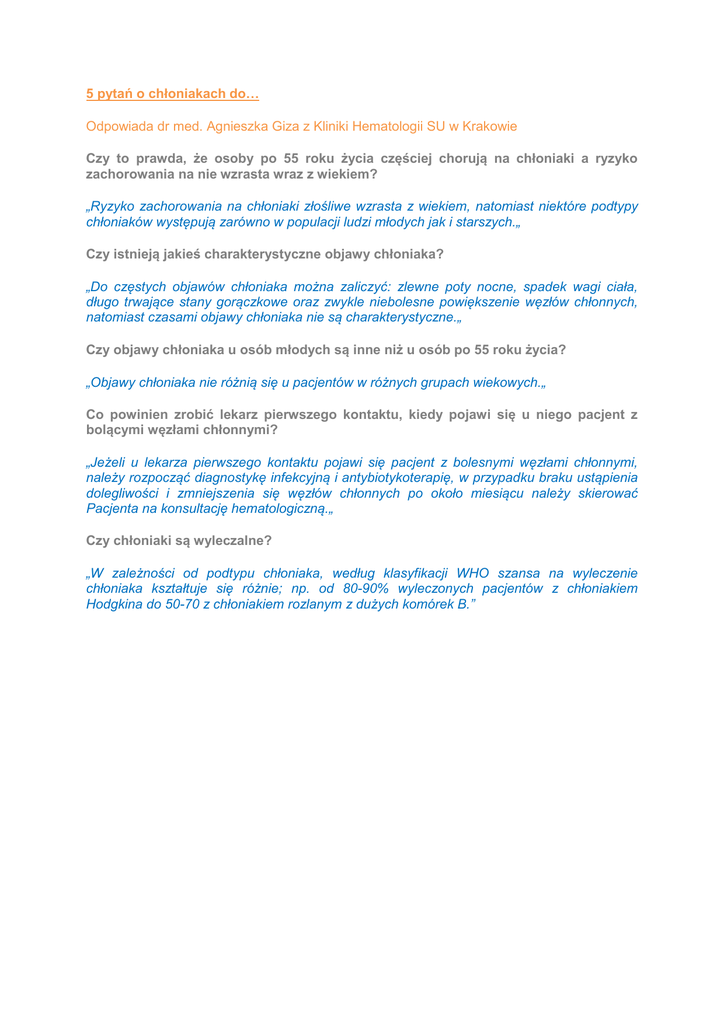 5 pytań o chłoniakach do… Odpowiada dr med. Agnieszka Giza z Kliniki Hematologii SU w Krakowie Czy to prawda, że osoby po 55 roku życia częściej chorują na chłoniaki a ryzyko zachorowania na nie wzrasta wraz z wiekiem? „Ryzyko zachorowania na chłoniaki złośliwe wzrasta z wiekiem, natomiast niektóre podtypy chłoniaków występują zarówno w populacji ludzi młodych jak i starszych.„ Czy istnieją jakieś charakterystyczne objawy chłoniaka? „Do częstych objawów chłoniaka można zaliczyć: zlewne poty nocne, spadek wagi ciała, długo trwające stany gorączkowe oraz zwykle niebolesne powiększenie węzłów chłonnych, natomiast czasami objawy chłoniaka nie są charakterystyczne.„ Czy objawy chłoniaka u osób młodych są inne niż u osób po 55 roku życia? „Objawy chłoniaka nie różnią się u pacjentów w różnych grupach wiekowych.„ Co powinien zrobić lekarz pierwszego kontaktu, kiedy pojawi się u niego pacjent z bolącymi węzłami chłonnymi? „Jeżeli u lekarza pierwszego kontaktu pojawi się pacjent z bolesnymi węzłami chłonnymi, należy rozpocząć diagnostykę infekcyjną i antybiotykoterapię, w przypadku braku ustąpienia dolegliwości i zmniejszenia się węzłów chłonnych po około miesiącu należy skierować Pacjenta na konsultację hematologiczną.„ Czy chłoniaki są wyleczalne? „W zależności od podtypu chłoniaka, według klasyfikacji WHO szansa na wyleczenie chłoniaka kształtuje się różnie; np. od 80-90% wyleczonych pacjentów z chłoniakiem Hodgkina do 50-70 z chłoniakiem rozlanym z dużych komórek B.”