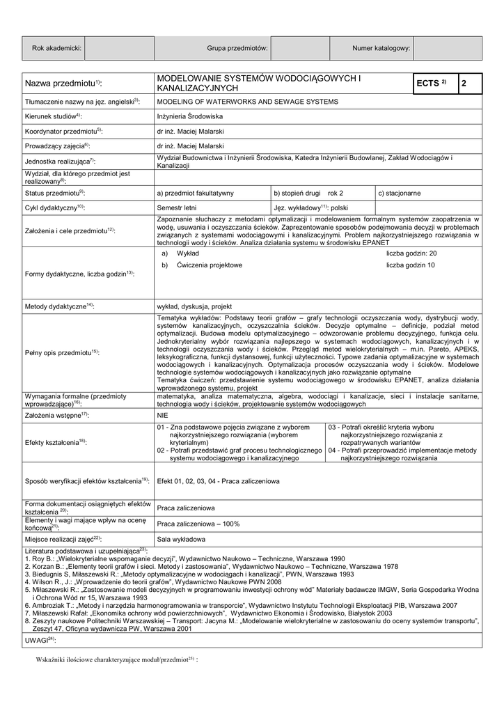 Rok akademicki: Grupa przedmiotów: Numer katalogowy: Nazwa przedmiotu1): MODELOWANIE SYSTEMÓW WODOCIĄGOWYCH I KANALIZACYJNYCH Tłumaczenie nazwy na jęz. angielski3): MODELING OF WATERWORKS AND SEWAGE SYSTEMS Kierunek studiów4) : Inżynieria Środowiska 5) ECTS 2) Koordynator przedmiotu : dr inż. Maciej Malarski Prowadzący zajęcia6): dr inż. Maciej Malarski Jednostka realizująca7): Wydział Budownictwa i Inżynierii Środowiska, Katedra Inżynierii Budowlanej, Zakład Wodociągów i Kanalizacji 2 Wydział, dla którego przedmiot jest realizowany8): Status przedmiotu9): a) przedmiot fakultatywny b) stopień drugi Cykl dydaktyczny10): Semestr letni Jęz. wykładowy11): polski Założenia i cele przedmiotu12): Zapoznanie słuchaczy z metodami optymalizacji i modelowaniem formalnym systemów zaopatrzenia w wodę, usuwania i oczyszczania ścieków. Zaprezentowanie sposobów podejmowania decyzji w problemach związanych z systemami wodociągowymi i kanalizacyjnymi. Problem najkorzystniejszego rozwiązania w technologii wody i ścieków. Analiza działania systemu w środowisku EPANET rok 2 c) stacjonarne a) Wykład liczba godzin: 20 b) Ćwiczenia projektowe liczba godzin 10 Formy dydaktyczne, liczba godzin13): Metody dydaktyczne14): wykład, dyskusja, projekt Wymagania formalne (przedmioty wprowadzające)16): Tematyka wykładów: Podstawy teorii grafów – grafy technologii oczyszczania wody, dystrybucji wody, systemów kanalizacyjnych, oczyszczalnia ścieków. Decyzje optymalne – definicje, podział metod optymalizacji. Budowa modelu optymalizacyjnego – odwzorowanie problemu decyzyjnego, funkcja celu. Jednokryterialny wybór rozwiązania najlepszego w systemach wodociągowych, kanalizacyjnych i w technologii oczyszczania wody i ścieków. Przegląd metod wielokryterialnych – m.in. Pareto, APEKS, leksykograficzna, funkcji dystansowej, funkcji użyteczności. Typowe zadania optymalizacyjne w systemach wodociągowych i kanalizacyjnych. Optymalizacja procesów oczyszczania wody i ścieków. Modelowe technologie systemów wodociągowych i kanalizacyjnych jako rozwiązanie optymalne Tematyka ćwiczeń: przedstawienie systemu wodociągowego w środowisku EPANET, analiza działania wprowadzonego systemu, projekt matematyka, analiza matematyczna, algebra, wodociągi i kanalizacje, sieci i instalacje sanitarne, technologia wody i ścieków, projektowanie systemów wodociągowych Założenia wstępne17): NIE Efekty kształcenia18): 01 - Zna podstawowe pojęcia związane z wyborem 03 - Potrafi określić kryteria wyboru najkorzystniejszego rozwiązania (wyborem najkorzystniejszego rozwiązania z kryterialnym) rozpatrywanych wariantów 02 - Potrafi przedstawić graf procesu technologicznego 04 - Potrafi przeprowadzić implementacje metody systemu wodociągowego i kanalizacyjnego najkorzystniejszego rozwiązania Sposób weryfikacji efektów kształcenia19): Efekt 01, 02, 03, 04 - Praca zaliczeniowa Pełny opis przedmiotu15): Forma dokumentacji osiągniętych efektów Praca zaliczeniowa kształcenia 20): Elementy i wagi mające wpływ na ocenę Praca zaliczeniowa – 100% końcową21): Miejsce realizacji zajęć22): Sala wykładowa Literatura podstawowa i uzupełniająca23): 1. Roy B.: „Wielokryterialne wspomaganie decyzji”, Wydawnictwo Naukowo – Techniczne, Warszawa 1990 2. Korzan B.: „Elementy teorii grafów i sieci. Metody i zastosowania”, Wydawnictwo Naukowo – Techniczne, Warszawa 1978 3. Biedugnis S, Miłaszewski R.: „Metody optymalizacyjne w wodociągach i kanalizacji”, PWN, Warszawa 1993 4. Wilson R., J.: „Wprowadzenie do teorii grafów”, Wydawnictwo Naukowe PWN 2008 5. Miłaszewski R.: „Zastosowanie modeli decyzyjnych w programowaniu inwestycji ochrony wód” Materiały badawcze IMGW, Seria Gospodarka Wodna i Ochrona Wód nr 15, Warszawa 1993 6. Ambroziak T.: „Metody i narzędzia harmonogramowania w transporcie”, Wydawnictwo Instytutu Technologii Eksploatacji PIB, Warszawa 2007 7. Miłaszewski Rafał: „Ekonomika ochrony wód powierzchniowych”, Wydawnictwo Ekonomia i Środowisko, Białystok 2003 8. Zeszyty naukowe Politechniki Warszawskiej – Transport: Jacyna M.: „Modelowanie wielokryterialne w zastosowaniu do oceny systemów transportu”, Zeszyt 47, Oficyna wydawnicza PW, Warszawa 2001 UWAGI24): Wskaźniki ilościowe charakteryzujące moduł/przedmiot25) : Szacunkowa sumaryczna liczba godzin pracy studenta (kontaktowych i pracy własnej) niezbędna dla osiągnięcia zakładanych efektów kształcenia18) - na tej podstawie należy wypełnić pole ECTS2: 60 h Łączna liczba punktów ECTS, którą student uzyskuje na zajęciach wymagających bezpośredniego udziału nauczycieli akademickich: 1,5 ECTS Łączna liczba punktów ECTS, którą student uzyskuje w ramach zajęć o charakterze praktycznym, takich jak zajęcia laboratoryjne, projektowe, itp.: 0,5 ECTS Tabela zgodności kierunkowych efektów kształcenia efektami przedmiotu 26) Nr /symbol efektu Wymienione w wierszu efekty kształcenia: Odniesienie do efektów dla programu kształcenia na kierunku 01 Zna podstawowe pojęcia związane z wyborem najkorzystniejszego rozwiązania (wyborem kryterialnym) K_W01, K_W13 02 Potrafi przedstawić graf procesu technologicznego systemu wodociągowego i kanalizacyjnego K_W01, K_W13 03 Potrafi określić kryteria wyboru najkorzystniejszego rozwiązania z rozpatrywanych wariantów K_W05, K_U05, K_U12 04 Potrafi przeprowadzić implementacje wybranych metod najkorzystniejszego rozwiązania K_W05, K_U05, K_U12, K_K03