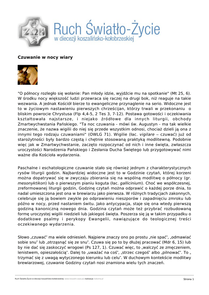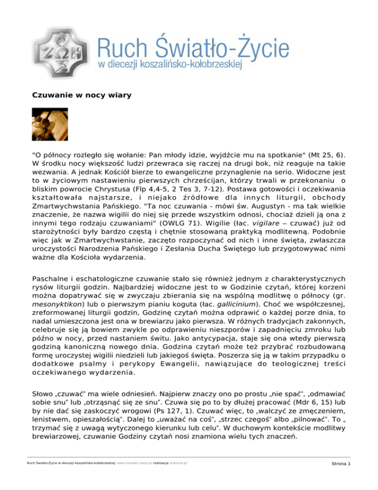 Czuwanie w nocy wiary "O północy rozległo się wołanie: Pan młody idzie, wyjdźcie mu na spotkanie" (Mt 25, 6). W środku nocy większość ludzi przewraca się raczej na drugi bok, niż reaguje na takie wezwania. A jednak Kościół bierze to ewangeliczne przynaglenie na serio. Widoczne jest to w życiowym nastawieniu pierwszych chrześcijan, którzy trwali w przekonaniu o bliskim powrocie Chrystusa (Flp 4,4-5, 2 Tes 3, 7-12). Postawa gotowości i oczekiwania kształtowała najstarsze, i niejako źródłowe dla innych liturgii, obchody Zmartwychwstania Pańskiego. "Ta noc czuwania - mówi św. Augustyn - ma tak wielkie znaczenie, że nazwa wigilii do niej się przede wszystkim odnosi, chociaż dzieli ją ona z innymi tego rodzaju czuwaniami" (OWLG 71). Wigilie (łac. vigilare – czuwać) już od starożytności były bardzo częstą i chętnie stosowaną praktyką modlitewną. Podobnie więc jak w Zmartwychwstanie, zaczęto rozpoczynać od nich i inne święta, zwłaszcza uroczystości Narodzenia Pańskiego i Zesłania Ducha Świętego lub przygotowywać nimi ważne dla Kościoła wydarzenia. Paschalne i eschatologiczne czuwanie stało się również jednym z charakterystycznych rysów liturgii godzin. Najbardziej widoczne jest to w Godzinie czytań, której korzeni można dopatrywać się w zwyczaju zbierania się na wspólną modlitwę o północy (gr. mesonyktikon) lub o pierwszym pianiu koguta (łac. gallicinium). Choć we współczesnej, zreformowanej liturgii godzin, Godzinę czytań można odprawić o każdej porze dnia, to nadal umieszczona jest ona w brewiarzu jako pierwsza. W różnych tradycjach zakonnych, celebruje się ją bowiem zwykle po odprawieniu nieszporów i zapadnięciu zmroku lub późno w nocy, przed nastaniem świtu. Jako antycypacja, staje się ona wtedy pierwszą godziną kanoniczną nowego dnia. Godzina czytań może też przybrać rozbudowaną formę uroczystej wigilii niedzieli lub jakiegoś święta. Poszerza się ją w takim przypadku o dodatkowe psalmy i perykopy Ewangelii, nawiązujące do teologicznej treści oczekiwanego wydarzenia. Słowo „czuwać” ma wiele odniesień. Najpierw znaczy ono po prostu „nie spać”, „odmawiać sobie snu” lub „otrząsnąć się ze snu”. Czuwa się po to by dłużej pracować (Mdr 6, 15) lub by nie dać się zaskoczyć wrogowi (Ps 127, 1). Czuwać więc, to „walczyć ze zmęczeniem, lenistwem, opieszałością”. Dalej to „uważać na coś”, „strzec czegoś” albo „pilnować”. To „ trzymać się z uwagą wytyczonego kierunku lub celu”. W duchowym kontekście modlitwy brewiarzowej, czuwanie Godziny czytań nosi znamiona wielu tych znaczeń. Ruch Światło-Życie w diecezji koszalińsko-kołobrzeskiej: www.koszalin.oaza.pl; realizacja: kokoma.pl Strona 1 Najpierw samo wstawanie na modlitwę w nocy jest gestem przyjacielskiego i wiernego oczekiwania na Oblubieńca oraz miłosnej gotowości do ofiary. Jest to także postawa czujności, wzorowanej na strażnikach, podejmujących nocną służbę dla bezpieczeństwa śpiącego miasta. Czynność nocnej modlitwy jest również znakiem przełamywania ociężałości ciała i zdecydowanej walki z pokusami oraz spodziewania się zbawienia bardziej po Panu, który przyjdzie z potrzebną pomocą, niż po samym sobie. Zasadniczą część Godziny czytań (i oczywisty jej źródłosłów) stanowią czytania: biblijne, patrystyczne albo średniowieczne i nowożytne teksty pisarzy kościelnych. Taka struktura Godziny czytań zgodna jest z zaleceniem Konstytucji o liturgii Soboru Watykańskiego II, która wskazuje, by zawierała ona mniej psalmów, na rzecz bardziej rozbudowanych czytań (SC 89). Sprawowanie jej w ten sposób ma nas podtrzymywać właśnie w postawie czuwania, przez dojrzewanie do rozumienia woli Boga objawionej w jego Słowie i Tradycji Kościoła i poprzez stopniowe przylgnięcie do niej na medytacji. „Tak wielka tkwi w słowie Bożym moc i potęga, że jest ono dla Kościoła podporą i siłą żywotną, a dla synów Kościoła utwierdzeniem wiary, pokarmem duszy oraz źródłem czystym i stałym życia duchowego” – dopowiada soborowa Konstytucja o Objawieniu Bożym (DV 21). Niebagatelna jest tu celebracyjna atmosfera tego czuwania przy słowie Bożym jak przy lampie. Pozwala ona nie tylko na intelektualne, ale przede wszystkim na modlitewne przyswojenie biblijnych treści z pomocą hymnów, psalmów i końcowych kolekt. Klimat modlitewnego dialogu podtrzymują również antyfony, dłuższe responsoria (łac. respondere – odpowiadać) i wersety przed czytaniami. Teksty Pisma Świętego w Godzinie czytań podawane są zwykle według tzw. lectio continua, tzn. w pewnej ciągłości danej księgi. Metoda ta pozwala systematycznie i szerzej ukazać (dzień po dniu i fragment po fragmencie) wybrane zagadnienie historiozbawcze. Pielęgnowana jest też w Godzinie czytań rzymska tradycja wiązania pewnych ksiąg z okresami liturgicznymi. Np. Adwent – Księga Izajasza, Boże Narodzenie – List do Kolosan, okres przygotowania do Paschy – Księga Jeremiasza i Lamentacje, oktawa Paschy – 1 List św. Piotra, okres paschalny – Dzieje Apostolskie. Czytania biblijne dopełniają katechezy Ojców Kościoła i Świętych, reprezentujących na przestrzeni wieków różne duchowości i rozmaite kierunki myśli teologicznej. Czytania zaczerpnięte są również z wielu dokumentów Kościoła. Ta poszerzona perspektywa pozwala modlącym się łatwiej rozpoznawać znaki czasu i zachować czynny zmysł wiary. Jest to niejako ciągłe wydobywanie ze skarbca Kościoła rzeczy nowych i starych (por. Mt 13, 52). Dziś, gdy świat domaga się od nas nowej apologetyki wiary, modlitewna praktyka Godziny czytań wydaje się nadal aktualnym narzędziem „gruntowania” kościelnej tożsamości chrześcijan. Jest to też skuteczna pomoc w znalezieniu odpowiednich słów oraz rzeczowych argumentów w dialogu z poszukującymi zrozumienia tajemnic Ob