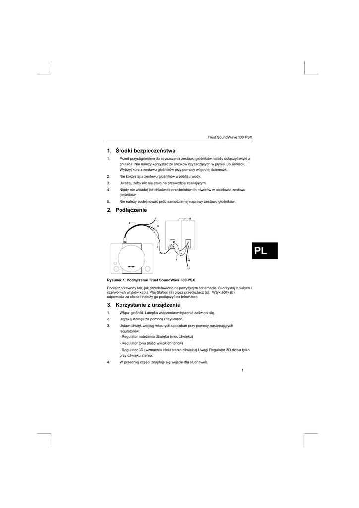 Trust SoundWave 300 PSX 1. Środki bezpieczeństwa 1. Przed przystąpieniem do czyszczenia zestawu głośników należy odłączyć wtyki z gniazda. Nie należy korzystać ze środków czyszczących w płynie lub aerozolu. Wytrzyj kurz z zestawu głośników przy pomocy wilgotnej ściereczki. 2. Nie korzystaj z zestawu głośników w pobliżu wody. 3. Uważaj, żeby nic nie stało na przewodzie zasilającym. 4. Nigdy nie wkładaj jakichkolwiek przedmiotów do otworów w obudowie zestawu głośników. 5. Nie należy podejmować prób samodzielnej naprawy zestawu głośników. 2. Podłączenie PL Rysunek 1. Podłączenie Trust SoundWave 300 PSX Podłącz przewody tak, jak przedstawiono na powyższym schemacie. Skorzystaj z białych i czerwonych wtyków kabla PlayStation (a) przez przedłużacz (c). Wtyk żółty (b) odpowiada za obraz i należy go podłączyć do telewizora. 3. Korzystanie z urządzenia 1. Włącz głośniki. Lampka włączenia/wyłączenia zaświeci się. 2. Uzyskaj dźwięk za pomocą PlayStation. 3. Ustaw dźwięk według własnych upodobań przy pomocy następujących regulatorów: - Regulator natężenia dźwięku (moc dźwięku) - Regulator tonu (ilość wysokich tonów) - Regulator 3D (wzmacnia efekt stereo dźwięku) Uwagi Regulator 3D działa tylko przy dźwięku stereo. 4. W przedniej części znajduje się wejście dla słuchawek. 1