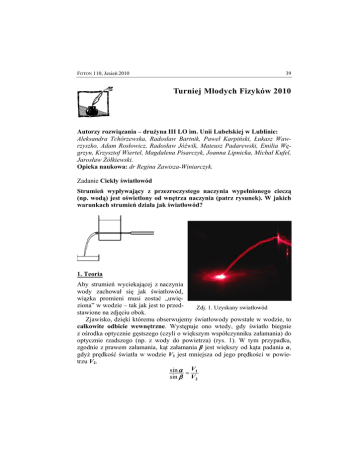 FOTON 110, Jesień 2010 39 Turniej Młodych Fizyków 2010 Autorzy rozwiązania – drużyna III LO im. Unii Lubelskiej w Lublinie: Aleksandra Tchórzewska, Radosław Bartnik, Paweł Karpiński, Łukasz Wawrzyszko, Adam Rosłowicz, Radosław Jóźwik, Mateusz Padarewski, Emilia Węgrzyn, Krzysztof Wiertel, Magdalena Pisarczyk, Joanna Lipnicka, Michał Kufel, Jarosław Żółkiewski. Opieka naukowa: dr Regina Zawisza-Winiarczyk. Zadanie Ciekły światłowód Strumień wypływający z przezroczystego naczynia wypełnionego cieczą (np. wodą) jest oświetlony od wnętrza naczynia (patrz rysunek). W jakich warunkach strumień działa jak światłowód? 1. Teoria Aby strumień wyciekającej z naczynia wody zachował się jak światłowód, wiązka promieni musi zostać „uwięziona” w wodzie – tak jak jest to przedZdj. 1. Uzyskany swiatłowód stawione na zdjęciu obok. Zjawisko, dzięki któremu obserwujemy światłowody powstałe w wodzie, to całkowite odbicie wewnętrzne. Występuje ono wtedy, gdy światło biegnie z ośrodka optycznie gęstszego (czyli o większym współczynniku załamania) do optycznie rzadszego (np. z wody do powietrza) (rys. 1). W tym przypadku, zgodnie z prawem załamania, kąt załamania β jest większy od kąta padania α, gdyż prędkość światła w wodzie V1 jest mniejsza od jego prędkości w powietrzu V2. sin α = V1 sin β V2 FOTON 110, Jesień 2010 40 Oprócz promienia załamanego obserwujemy też promień odbity. Zwiększając kąt padania dochodzimy w pewnym momencie do stanu, gdy kąt załamania staje się kątem prostym: β = 90°. Wówczas promień załamany „ślizga się” po powierzchni granicznej (rys. 1, promień narysowany linią przerywaną). Kąt padania αg, dla którego kąt załamania jest prosty, nazywa się kątem granicznym. Rys. 1 Dalsze zwiększanie kąta padania powoduje pełne odbicie od powierzchni granicznej, zgodnie z prawami odbicia (rys. 1, promień narysowany linią kropkowaną). Mówimy, że promień ulega całkowitemu odbiciu wewnętrznemu. Kąt graniczny można bardzo łatwo obliczyć z prawa załamania: sin α = n2 sin β n1 gdzie n1 > n2 Rys. 2 Wiedząc, że: • n1 to współczynnik załamania wody, wynoszący 1,33, • n2 to współczynnik załamania powietrza, wynoszący 1,0003, • αg to kąt graniczny, • β to kąt, pod jakim promień pada na granicę ośrodków i przyjmując kąt β = 90° otrzymujemy równanie, z którego wyliczamy αg – kąt graniczny: sin α g = n2 n ⇒ α g = arcsin 2 n1 n1 Po podstawieniu wartości do równania otrzymujemy wynik αg = 48,8°. Rys. 3 FOTON 110, Jesień 2010 41 Zatem aby uzyskać światłowód, kąt padania promienia lasera na granicę ośrodków woda–powietrze musi być za każdym razem większy od kąta granicznego. W prostym strumieniu wody (w kształcie walca) wystarczy skierować promień lasera na granicę ośrodków pod kątem większym od kąta 48,8°. Ulegnie on kolejnym odbiciom, pozostając uwięzionym w wodzie (rys. 2). Dzieje się tak, gdyż kąt padania promienia na równoległe płaszczyzny granicy ośrodków jest jednakowy i równy początkowemu kątowi padania. Jednak w przypadku strumienia wypływającego z boku naczynia, sytuacja wygląda nieco inaczej, gdyż strumień wody na kształt paraboli. Udowodnijmy więc, że promień, który raz wszedł w wypływający strumień pod kątem większym od kąta granicznego, już z niego nie wyjdzie na całym obszarze ciągłego strumienia (rys. 3). Strumień wypływającej z naczynia wody można rozpatrzyć przez analogię do rzutu poziomego ciała, którego torem jest parabola. Na rysunku 4 widać, że w trójkącie ABC β > 90° oraz w trójkącie ACD δ > 90° − α zatem, kąt padania promienia na przeciwną granicę ośrodków γ >α co znaczy, że za każdym razem kąt padania promienia lasera na granicę ośrodków jest większy od początkowego, tak więc promień zostanie uwięziony w strumieniu wody. Rys. 4 2. Przebieg doświadczenia i wyniki W celu sprawdzenia warunków, w jakich powstaje omawiany światłowód, przeprowadziliśmy szereg doświadczeń. Do doświadczeń użyliśmy: • butelek o wysokości 32 cm i pojemności 2 litrów, • lasera o maksymalnej mocy 3 mW. Opis doświadczenia: a) Badamy, czy powstanie światłowodu zależy od wysokości, na jakiej znajduje się otwór, przez który wypływa woda FOTON 110, Jesień 2010 42 W tym celu posłużyliśmy się butelką o jednakowych otworach na trzech różnych wysokościach: 8 cm, 16 cm i 24 cm mierzonych od podstawy – tak jak jest to przedstawione na zdjęciu nr 2. Kształt strumienia wody zależał od wysokości otworu, gdyż w każdym z przypadków woda wypływała z otworów z inną prędkością, co wpływało na parametry paraboli. Zdj. 2. Butelka z otworami na różnych wysokościach Okazuje się jednak, że jeżeli poprowadzimy promień lasera całkowicie poziomo w stosunku do butelki, to w każdym przypadku otrzymamy światłowód, niezależnie od kształtu strumienia. Jest to przedstawione na poniższych zdjęciach. Zdj. 3. Poziomo, h = 24cm Zdj. 4. Poziomo, h = 16cm Zdj. 5. Poziomo, h = 8cm FOTON 110, Jesień 2010 43 b) Badamy, czy powstawanie światłowodu zależy od kąta wpadania wiązki światła do otworu w butelce W tym celu zmienialiśmy sposób oświetlenia strumienia w trzech przypadkach, pozostawiając laser na jednakowej wysokości, zmieniając jedynie kąt jego nachylenia. Zdj. 6. Wysokość 24 cm Zdj. 7. Wysokość 16 cm Zdj. 8. Wysokość 8 cm Na zdjęciach nr 6, 7 i 8 przedstawiono kąty, pod jakimi należy oświetlić butelkę, aby powstał światłowód. Na wysokości 24 cm kąt ustawienia lasera wynosi 29°. Gdy otwór znajduje się w odległości 16 cm od podłoża, kąt ten będzie wynosić 16°, a na wysokości 8 cm – 3°. Zdj. 9. Wysokość 24 cm Zdj. 10. Wysokość 16 cm Zdj. 11. Wysokość 8 cm Wysokość, na jakiej umieszczono otwory, wpływa na kształt zakrzywienia strumienia, a co za tym idzie