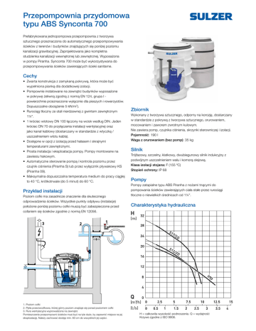 Przepompownia przydomowa typu ABS Synconta 700 Prefabrykowana jednopompowa przepompownia z tworzywa sztucznego przeznaczona do automatycznego przepompowywania ścieków z terenów i budynków znajdujących się poniżej poziomu kanalizacji grawitacyjnej. Zaprojektowana jako kompletna studzienka kanalizacji wewnętrznej lub zewnętrznej. Wyposażona w pompy Piranha. Synconta 700 może być wykorzystywana do przepompowywania ścieków zawierających ścieki sanitarne. Cechy • Zwarta konstrukcja z zamykaną pokrywą, która może być wypełniona pianką dla dodatkowej izolacji. • Pompownie instalowane na zewnątrz budynków wyposażone w pokrywę żeliwną zgodną z normą EN 124, grupa I powierzchnie przeznaczone wyłącznie dla pieszych i rowerzystów. Dopuszczalne obciążenie 5 kN/m2). • Rurociąg tłoczny ze stali nierdzewnej z gwintem zewnętrznym 1¼". • 1 króciec wlotowy DN 100 łączony na wcisk według DIN. Jeden króciec DN 70 do przyłączenia instalacji wentylacyjnej oraz jako kanał kablowy (dostarczany w standardzie z wtyczką / uszczelnieniem wlotu kabla). • Dostępne w opcji z izolacją przed hałasem i skrajnymi temperaturami zewnętrznymi. • Prosta instalacja i eksploatacja pompy. Pompy montowane na zawiesiu hakowym. • Automatyczne sterowanie pompą i kontrola poziomu przez czujnik ciśnienia (Piranha S) lub przez wyłącznik pływakowy KS (Piranha 09). • Maksymalna dopuszczalna temperatura medium do pracy ciągłej to 40 °C, krótkotrwale (do 5 minut) do 60 °C. Przykład instalacji Poziom cofki ma zasadnicze znaczenie dla skutecznego odprowadzenia ścieków. Wszystkie punkty odpływu (instalacje) położone poniżej poziomu cofki muszą być zabezpieczone przed cofaniem się ścieków zgodnie z normą EN 12056. 1. Poziom cofki 2. Pętla przeciwcofkowa, której górny poziom znajduje się ponad poziomem cofki 3. Rura wentylacyjna wyprowadzona na zewnątrz Pomieszczenie przepompowni ścieków musi być na tyle duże, by zapewnić miejsce na jej eksploatację. Należy zachować dostęp min. 60 cm do wszystkich jej części. Zbiornik Wykonany z tworzywa sztucznego, odporny na korozję, dostarczany w standardzie z pokrywą z tworzywa sztucznego, orurowaniem, mocowaniem i zaworem zwrotnym kulowym. Nie zawiera pomp, czujnika ciśnienia, skrzynki sterowniczej i izolacji. Pojemność: 190 l Waga z orurowaniem (bez pomp): 35 kg Silnik Trójfazowy, szczelny, klatkowy, dwubiegunowy silnik indukcyjny z podwójnym uszczelnieniem wału i komorą olejową. Klasa izolacji stojana: F (155 ºC) Stopień ochrony: IP 68 Pompy Pompy zatapialne typu ABS Piranha z nożami tnącymi do pompowania ścieków zawierających ciała stałe przez rurociągi tłoczne o niewielkich średnicach od 1¼". Charakterystyka hydrauliczna H = całkowita wysokość podnoszenia. Q = wydajność Krzywe zgodne z ISO 9906. Dane techniczne Piranha Króciec tłoczny Pompa Rurociąg (kołnierz) (gwint wew.) Natężenie znamionowe (A) Moc silnika * (kW) P2 P1 Napięcie znamionowe ** (V) Prędkość obrotowa (r/min) Kabel *** Waga pompy (H07RN-F) (kg) 09/2D DN 32 R 1¼" 2.56 2.00 4.64 400 3~ 2900 4G1.0 23 S12/2D DN 32 R 1¼" 1.69 1.20 3.29 400 3~ 2900 4G1.5 32 S17/2D DN 32 R 1¼" 2.31 1.70 6.90 230 3~ 2900 4G1.5 32 S17/2D DN 32 R 1¼" 2.31 1.70 3.97 400 3~ 2900 4G1.5 32 * P1 = Moc pobierana z sieci. P2 = Moc na wale. ** Może pracować jako jednofazowa 230 V za pomocą odpowiedniego panelu sterowania (patrz wyposażenie). *** Kable do ścieków niezarobione. Średnice wlotu Wymiary (mm) Ø (mm) DN 70 +0.2 Ø 75 -1.0 DN 100 +0.3 Ø 110 -1.0 Pokrywa przepompowni Ø800 Ø645 1 50 R 1¼” 100 4 50 DN 70 2 3 1. Pokrywa żeliwna 2. Żeliwna rama 3. Pierścień z tworzywa sztucznego wspierający ramę 4. Betonowy pierścień 5. Pierścień wspierający z tworzywa sztucznego (oparty na krawędzi zbiornika) 55 690 DN 100 500 690 865 5 Ø710 Wykonanie materiałowe Pompa Piranha Synconta 700 Opis Materiał Zbiornik i pokrywa Polietylen Izolacja Polistyren ektrudowany Króciec tłoczny Stal nierdzewna 1.4301 (AISI 304) Mocowanie i zawór Żeliwo EN-GJL-250 Pokrywa górna * Stal nierdzewna 1.4301 (AISI 304) Obudowa silnika Żeliwo EN-GJL-250 Wał silnika Stal nierdzewna 1.4021 (AISI 420) Wirnik ** Żeliwo EN-GJL-250 Korpus tłoczny Żeliwo EN-GJL-250 Elementy złączne Stal nierdzewna 1.4401 Wyposażenie Opis Nr kat. Izolacja 62665343 Czujnik ciśnienia (MD 126) 27007024 Zawór próżniowy 62665180 Przerywacz strugi (zawór) 62665297 Pokrywa pompowni Na zapytanie Skrzynka sterownicza - CP114: 230 V jednofazowa, 7.5 A CP112: 230 V trójfazowa CP112: 400 V 62160870 15207147 15207145 * Piranha 09. ** Poliamid dla Piranha 09 www.sulzer.com pl (06.12.2016), Copyright © Sulzer Ltd 2016 Ten dokument nie zapewnia żadnego rodzaju rękojmi lub gwarancji. Wszelkich informacji dotyczących gwarancji i poręczeń możemy udzielić po otrzymaniu zapytania. Dokumentacja techniczno-ruchowa zostanie przekazana oddzielnie. Wszystkie informacje zawarte w niniejszym dokumencie mogą bez uprzedzenia ulec zmianie.
