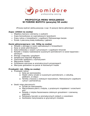 PROPOZYCJA MENU WIGILIJNEGO W FORMIE BUFETU (powyżej 50 osób) (Proszę wybrać jedną pozycję z zup i 6 pozycji dania głównego) Zupa: (250ml na osobę) • Wigilijny barszcz czerwony z uszkami • Zupa borowikowa ze szpinakowymi łazankami • Zupa rybna z krewetkami i cząstkami filetowanego karpia • Żurek z pieczoną białą kiełbaską i jajkiem Danie główne/gorące: (ok. 500g na osobę) Roladki z pstrąga w sosie szpinakowym z krewetkami Karp w sosie piernikowym Sola królewska z sosem cytrynowym i cząstkami limonek Roladki z indyka nadziewane suszonymi pomidorami w sosie kaparowo serowym Pierogi z kapustą i grzybami Świąteczna kapusta Wigilijna Ziemniaki opiekane z rozmarynem Warzywne risotto Grillowane warzywa w aromatycznych przyprawach Warzywa gotowane na parze w klarownym maśle Przekąski: (ok. 200g na osobę) Przekąski rybne: Karp po warszawsku Śledź cztery smaki (z suszonymi pomidorami, z cebulką, jabłkiem, w oleju) Tortilla z łososia z ziołowym twarożkiem, filetowanymi cząstkami cytryn i pomarańczy Deski mięs pieczonych: Schab po warszawsku Marynowana pierś z indyka, z prażonymi migdałami i orzechami pini Rolada z indyka faszerowana zielonym groszkiem i czerwoną papryką Rolowany boczek w aromatycznych ziołach z czosnkiem Karkówka marynowana w gryczanym miodzie Sosy: • Tatarski • Chrzanowy • Cytrynowo - limonkowy • Ziołowy ze świeżą bazylią Sałatki: (ok. 150g na osobę) • Świąteczna sałatka jarzynowa • Sałatka Grecka z tradycyjnym sosem pesto • Sałatka makaronowa z grillowanym tuńczykiem i warzywami • Sałatka z szynką własnego wypieku i marynowanymi pieczarkami Dodatki: (ok. 80g na osobę) • Kosze pieczywa (mix: razowe, białe, bułeczki bankietowe) • Masło smakowe (ziołowe, czosnkowe) Deser: (ok. 150g na osobę) • Wybór ciast świątecznych (mini pączki, sękacz, makowiec, ciasto bakaliowe, rolady) • Wybór owoców w koszu Napoje bezalkoholowe: • Kawa i herbata bez limitu konsumpcji (dodatki: mleko, cytryna, cukier, miód pitny) • Soki owocowe (pomarańczowy, porzeczkowy, jabłkowy, grejpfrutowy) i woda mineralna (gazowana i niegazowana) (500ml na osobę) • Kompot z suszonych owoców z goździkami i cynamonem (250ml na osobę) Koszt za powyższe menu to 100zł netto od osoby Do rachunku doliczymy 25% za obsługę cateringową Dodatkowo w cenie przyjęcia: • Hostessa w przebraniu aniołka podająca opłatek przybyłym Gościom • Pełna zastawa restauracyjna (talerze, sztućce, stoły bufetowe, obrusy) • Obsługa kelnerska i kucharska • Dekoracja świąteczna (stroiki, gałązki jemioły i świerku) Dodatkowo na życzenie: • Zespół grający kolędy polskie jak i zagraniczne, ewentualnie standardy jazzowe • Świąteczne kosze dla pracowników firmy rozdawane na zakończenie przyjęcia • Przygotowanie choinki • Prawdziwy renifer jako atrakcja przyjęcia • Przygotowanie bąbek firmowych • Sztuczny śnieg w przypadku „niepogody” Jak i wiele innych atrakcji które z przyjemnością przygotujemy na Państwa firmową Wigilię W przypadku jakichkolwiek pytań, pozostaję do dyspozycji. Pozdrawiam, Piotr Zdybel Catering & Marketing Manager POMIDORE - PROFESJONALNY CATERING tel. kom. 504-957-020 [email protected] www.pomidore.pl SMAKOŁYK - RESTAURACJA ul. Staniewicka 14 03-310 Warszawa [email protected] www.restauracjasmakolyk.pl NIP: 522-267-57-58