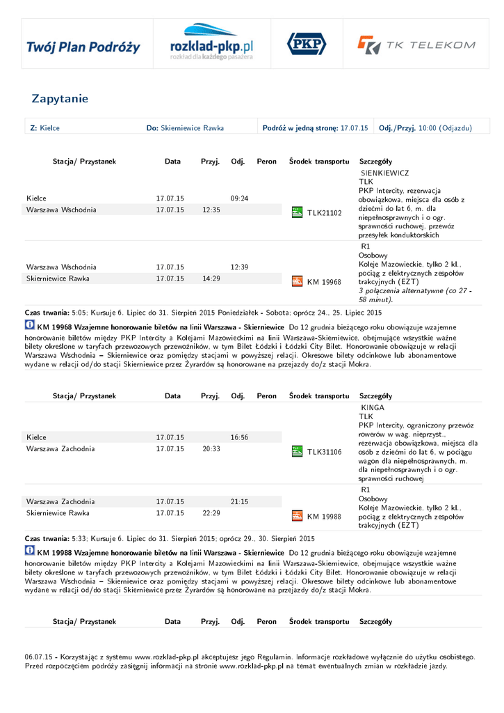 Zapytanie Z: Kielce Do: Stacja/ Przystanek Skierniewice Rawka Data Kielce Warszawa Wschodnia 17.07.15 17.07.15 Warszawa Wschodnia Skierniewice Rawka 17.07.15 17.07.15 Przyj. Podró» w jedn¡ stron¦: Odj. Peron 17.07.15 rodek transportu 09:24 12:35 TLK21102 12:39 14:29 KM 19968 Odj./Przyj. 10:00 (Odjazdu) Szczegóªy SIENKIEWICZ TLK PKP Intercity, rezerwacja obowi¡zkowa, miejsca dla osób z dzie¢mi do lat 6, m. dla niepeªnosprawnych i o ogr. sprawno±ci ruchowej, przewóz przesyªek konduktorskich R1 Osobowy Koleje Mazowieckie, tylko 2 kl., poci¡g z elektrycznych zespoªów trakcyjnych (EZT) 3 poª¡czenia alternatywne (co 27 58 minut). Czas trwania: 5:05; Kursuje 6. Lipiec do 31. Sierpie« 2015 Poniedziaªek - Sobota; oprócz 24., 25. Lipiec 2015 KM 19968 Wzajemne honorowanie biletów na linii Warszawa - Skierniewice Do 12 grudnia bie»¡cego roku obowi¡zuje wzajemne honorowanie biletów mi¦dzy PKP Intercity a Kolejami Mazowieckimi na linii Warszawa-Skierniewice, obejmuj¡ce wszystkie wa»ne bilety okre±lone w taryfach przewozowych przewo¹ników, w tym Bilet ódzki i ódzki City Bilet. Honorowanie obowi¡zuje w relacji Warszawa Wschodnia Skierniewice oraz pomi¦dzy stacjami w powy»szej relacji. Okresowe bilety odcinkowe lub abonamentowe wydane w relacji od/do stacji Skierniewice przez yrardów s¡ honorowane na przejazdy do/z stacji Mokra. Stacja/ Przystanek Data Kielce Warszawa Zachodnia 17.07.15 17.07.15 Warszawa Zachodnia Skierniewice Rawka 17.07.15 17.07.15 Czas trwania: Przyj. Odj. Peron rodek transportu 16:56 20:33 TLK31106 21:15 22:29 KM 19988 Szczegóªy KINGA TLK PKP Intercity, ograniczony przewóz rowerów w wag. nieprzyst., rezerwacja obowi¡zkowa, miejsca dla osób z dzie¢mi do lat 6, w poci¡gu wagon dla niepeªnosprawnych, m. dla niepeªnosprawnych i o ogr. sprawno±ci ruchowej R1 Osobowy Koleje Mazowieckie, tylko 2 kl., poci¡g z elektrycznych zespoªów trakcyjnych (EZT) 5:33; Kursuje 6. Lipiec do 31. Sierpie« 2015; oprócz 29., 30. Sierpie« 2015 Do 12 grudnia bie»¡cego roku obowi¡zuje wzajemne honorowanie biletów mi¦dzy PKP Intercity a Kolejami Mazowieckimi na linii Warszawa-Skierniewice, obejmuj¡ce wszystkie wa»ne bilety okre±lone w taryfach przewozowych przewo¹ników, w tym Bilet ódzki i ódzki City Bilet. Honorowanie obowi¡zuje w relacji Warszawa Wschodnia Skierniewice oraz pomi¦dzy stacjami w powy»szej relacji. Okresowe bilety odcinkowe lub abonamentowe wydane w relacji od/do stacji Skierniewice przez yrardów s¡ honorowane na przejazdy do/z stacji Mokra. KM 19988 Wzajemne honorowanie biletów na linii Warszawa - Skierniewice Stacja/ Przystanek Data Przyj. Odj. Peron rodek transportu Szczegóªy 06.07.15 - Korzystaj¡c z systemu www.rozklad-pkp.pl akceptujesz jego Regulamin. Informacje rozkªadowe wyª¡cznie do u»ytku osobistego. Przed rozpocz¦ciem podró»y zasi¦gnij informacji na stronie www.rozklad-pkp.pl na temat ewentualnych zmian w rozkªadzie jazdy. Stacja/ Przystanek Data Kielce Warszawa Zachodnia 17.07.15 17.07.15 Warszawa Zachodnia Skierniewice Rawka 17.07.15 18.07.15 Czas trwania: Przyj. Odj. Peron rodek transportu 19:05 22:54 TLK38202 23:04 00:03 KM 19992 Szczegóªy USTRONIE TLK PKP Intercity, rezerwacja obowi¡zkowa, Tania Kuszetka, wagon sypialny, miejsca dla osób z dzie¢mi do lat 6, m. dla niepeªnosprawnych i o ogr. sprawno±ci ruchowej, przewóz przesyªek konduktorskich RP1 Osobowy Koleje Mazowieckie, tylko 2 kl., poci¡g z elektrycznych zespoªów trakcyjnych (EZT) 4:58; Kursuje 11. do 20. Lipiec 2015 KM 19992 Wzajemne honorowanie biletów na linii Warszawa - Skierniewice Do 12 grudnia bie»¡cego roku obowi¡zuje wzajemne honorowanie biletów mi¦dzy PKP Intercity a Kolejami Mazowieckimi na linii Warszawa-Skierniewice, obejmuj¡ce wszystkie wa»ne bilety okre±lone w taryfach przewozowych przewo¹ników, w tym Bilet ódzki i ódzki City Bilet. Honorowanie obowi¡zuje w relacji Warszawa Wschodnia Skierniewice oraz pomi¦dzy stacjami w powy»szej relacji. Okresowe bilety odcinkowe lub abonamentowe wydane w relacji od/do stacji Skierniewice przez yrardów s¡ honorowane na przejazdy do/z stacji Mokra. 06.07.15 - Korzystaj¡c z systemu www.rozklad-pkp.pl akceptujesz jego Regulamin. Informacje rozkªadowe wyª¡cznie do u»ytku osobistego. Przed rozpocz¦ciem podró»y zasi¦gnij informacji na stronie www.rozklad-pkp.pl na temat ewentualnych zmian w rozkªadzie jazdy.