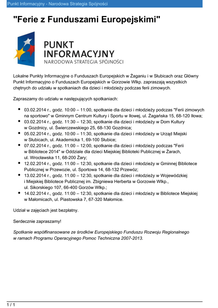 Punkt Informacyjny - Narodowa Strategia Spójności "Ferie z Funduszami Europejskimi" Lokalne Punkty Informacyjne o Funduszach Europejskich w Żaganiu i w Słubicach oraz Główny Punkt Informacyjno o Funduszach Europejskich w Gorzowie Wlkp. zapraszają wszystkich chętnych do udziału w spotkaniach dla dzieci i młodzieży podczas ferii zimowych. Zapraszamy do udziału w następujących spotkaniach: 03.02.2014 r., godz. 10:00 – 11:00, spotkanie dla dzieci i młodzieży podczas "Ferii zimowych na sportowo" w Gminnym Centrum Kultury i Sportu w Iłowej, ul. Żagańska 15, 68-120 Iłowa; 03.02.2014 r., godz. 11:30 – 12:30, spotkanie dla dzieci i młodzieży w Dom Kultury w Gozdnicy, ul. Świerczewskiego 25, 68-130 Gozdnica; 05.02.2014 r., godz. 10:00 – 11:30, spotkanie dla dzieci i młodzieży w Urząd Miejski w Słubicach, ul. Akademicka 1, 69-100 Słubice; 07.02.2014 r., godz. 11:00 – 12:00, spotkanie dla dzieci i młodzieży podczas "Ferii w Bibliotece 2014" w Oddziale dla dzieci Miejskiej Biblioteki Publicznej w Żarach, ul. Wrocławska 11, 68-200 Żary; 12.02.2014 r., godz. 11:00 – 12:30, spotkanie dla dzieci i młodzieży w Gminnej Bibliotece Publicznej w Przewozie, ul. Sportowa 14, 68-132 Przewóz; 13.02.2014 r., godz. 11:00 – 12:30, spotkanie dla dzieci i młodzieży w Wojewódzkiej i Miejskiej Bibliotece Publicznej im. Zbigniewa Herberta w Gorzowie Wlkp., ul. Sikorskiego 107, 66-400 Gorzów Wlkp.; 14.02.2014 r., godz. 11:00 – 12:30, spotkanie dla dzieci i młodzieży w Bibliotece Miejskiej w Małomicach, ul. Piastowska 7, 67-320 Małomice. Udział w zajęciach jest bezpłatny. Serdecznie zapraszamy! Spotkanie współfinansowane ze środków Europejskiego Funduszu Rozwoju Regionalnego w ramach Programu Operacyjnego Pomoc Techniczna 2007-2013. 1/1
