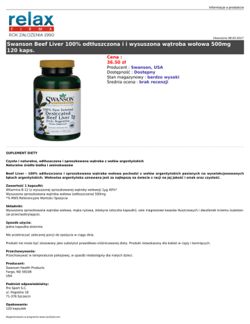 Informacje o produkcie Utworzono 08-03-2017 Swanson Beef Liver 100% odtłuszczona i i wysuszona wątroba wołowa 500mg 120 kaps. Cena : 36.50 zł Producent : Swanson, USA Dostępność : Dostępny Stan magazynowy : bardzo wysoki Średnia ocena : brak recenzji SUPLEMENT DIETY Czysta i naturalna, odtłuszczona i sproszkowana wątroba z wołów argentyńskich Naturalne źródło białka i aminokwasów Beef Liver - 100% odtłuszczona i sproszkowana wątroba wołowa pochodzi z wołów argentyńskich pasionych na wyselekcjonowanych łąkach argentyńskich. Wołowina argentyńska uznawana jest za najlepszą na świecie z racji na jej jakość i smak oraz czystość. Zawartość 1 kapsułki: Witamina B-12 (z wysuszonej sproszkowanej wątroby wołowej) 1µg 40%* Wysuszona sproszkowana wątroba wołowa (odtłuszczona) 500mg *% RWS Referencyjne Wartości Spożycia Składniki: Wysuszona sproszkowana wątroba wołowa, mąka ryżowa, żelatyna (otoczka kapsułki), sole magnezowe kwasów tłuszczowych i dwutlenek krzemu (substancje przeciwzbrylające). Sposób użycia: Jedna kapsułka dziennie. Nie przekraczać zalecanej porcji do spożycia w ciągu dnia. Produkt nie może być stosowany jako substytut prawidłowo zróżnicowanej diety. Produkt niewskazany dla kobiet w ciąży i karmiących. Przechowywanie: Przechowywać w temperaturze pokojowej, w sposób niedostępny dla małych dzieci. Producent: Swanson Health Products Fargo, ND 58108 USA Podmiot odpowiedzialny: Pro Sport S.C. ul. Pogodna 18 71-376 Szczecin Opakowanie: 120 kapsułek Wygenerowano w programie www.oscGold.com Informacje o producencie: Firma Swanson Health Products została założona w 1969 roku, jako wynik marzenia jednego człowieka o obdarowaniu całego świata dobrym zdrowiem. Do dzisiaj Firma kontynuując to marzenie, dociera do milionów ludzi świadomych swojego zdrowia w Stanach Zjednoczonych oraz na całym świecie. Swanson Health Products jest dumne ze swoich produktów i robi wszystko aby klienci byli w pełni zadowoleni. Te działania są czynione od początku istnienia firmy i przyniosły jej wiele splendoru oraz rzesze stałych, powracających klientów. Firma Swanson Health Products stara się aby: Cena produktu była możliwie najniższa. Czystość i Skuteczność była na jak najwyższym poziomie. Od kiedy firma szczyci się certyfikatem Dobrej Praktyki Wytwarzania (GMP) składniki są testowane na różnych etapach całego procesu produkcji w celu sprawdzenia czystości i mocy a gotowe produkty są badane przez niezależne laboratoria w celu potwierdzenia że, to co na etykiecie to jest w produkcie.