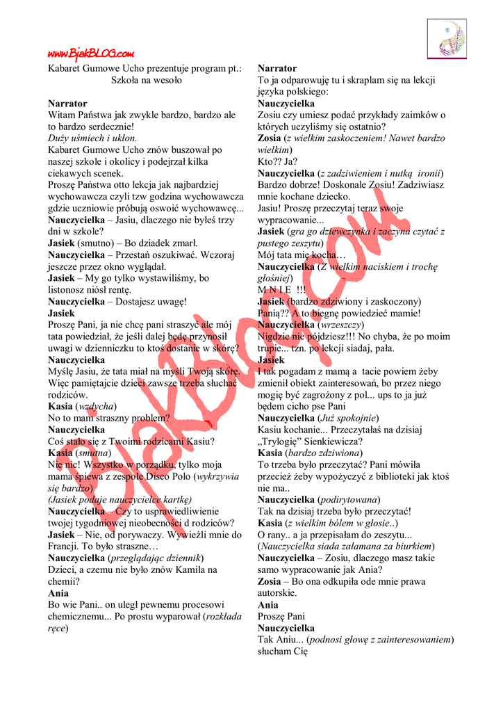 www.BjakBLOG.com Kabaret Gumowe Ucho prezentuje program pt.: Szkoła na wesoło Narrator Witam Państwa jak zwykle bardzo, bardzo ale to bardzo serdecznie! Duży uśmiech i ukłon. Kabaret Gumowe Ucho znów buszował po naszej szkole i okolicy i podejrzał kilka ciekawych scenek. Proszę Państwa otto lekcja jak najbardziej wychowawcza czyli tzw godzina wychowawcza gdzie uczniowie próbują oswoić wychowawcę... Nauczycielka – Jasiu, dlaczego nie byłeś trzy dni w szkole? Jasiek (smutno) – Bo dziadek zmarł. Nauczycielka – Przestań oszukiwać. Wczoraj jeszcze przez okno wyglądał. Jasiek – My go tylko wystawiliśmy, bo listonosz niósł rentę. Nauczycielka – Dostajesz uwagę! Jasiek Proszę Pani, ja nie chcę pani straszyć ale mój tata powiedział, że jeśli dalej będę przynosił uwagi w dzienniczku to ktoś dostanie w skórę? Nauczycielka Myślę Jasiu, że tata miał na myśli Twoją skórę. Więc pamiętajcie dzieci zawsze trzeba słuchać rodziców. Kasia (wzdycha) No to mam straszny problem? Nauczycielka Coś stało się z Twoimi rodzicami Kasiu? Kasia (smutna) Nie nic! Wszystko w porządku, tylko moja mama śpiewa z zespole Disco Polo (wykrzywia się bardzo) (Jasiek podaje nauczycielce kartkę) Nauczycielka – Czy to usprawiedliwienie twojej tygodniowej nieobecności d rodziców? Jasiek – Nie, od porywaczy. Wywieźli mnie do Francji. To było straszne… Nauczycielka (przeglądając dziennik) Dzieci, a czemu nie było znów Kamila na chemii? Ania Bo wie Pani.. on uległ pewnemu procesowi chemicznemu... Po prostu wyparował (rozkłada ręce) Narrator To ja odparowuję tu i skraplam się na lekcji języka polskiego: Nauczycielka Zosiu czy umiesz podać przykłady zaimków o których uczyliśmy się ostatnio? Zosia (z wielkim zaskoczeniem! Nawet bardzo wielkim) Kto?? Ja? Nauczycielka (z zadziwieniem i nutką ironii) Bardzo dobrze! Doskonale Zosiu! Zadziwiasz mnie kochane dziecko. Jasiu! Proszę przeczytaj teraz swoje wypracowanie... Jasiek (gra go dziewczynka i zaczyna czytać z pustego zeszytu) Mój tata mię kocha… Nauczycielka (Z wielkim naciskiem i trochę głośniej) M N I E !!! Jasiek (bardzo zdziwiony i zaskoczony) Panią?? A to biegnę powiedzieć mamie! Nauczycielka (wrzeszczy) Nigdzie nie pójdziesz!!! No chyba, że po moim trupie... tzn. po lekcji siadaj, pała. Jasiek I tak pogadam z mamą a tacie powiem żeby zmienił obiekt zainteresowań, bo przez niego mogię być zagrożony z pol... ups to ja już będem cicho pse Pani Nauczycielka (Już spokojnie) Kasiu kochanie... Przeczytałaś na dzisiaj „Trylogię” Sienkiewicza? Kasia (bardzo zdziwiona) To trzeba było przeczytać? Pani mówiła przecież żeby wypożyczyć z biblioteki jak ktoś nie ma.. Nauczycielka (podirytowana) Tak na dzisiaj trzeba było przeczytać! Kasia (z wielkim bólem w głosie..) O rany.. a ja przepisałam do zeszytu... (Nauczycielka siada załamana za biurkiem) Nauczycielka – Zosiu, dlaczego masz takie samo wypracowanie jak Ania? Zosia – Bo ona odkupiła ode mnie prawa autorskie. Ania Proszę Pani Nauczycielka Tak Aniu... (podnosi głowę z zainteresowaniem) słucham Cię www.BjakBLOG.com Ania A czy Pani wie kiedy używamy wielkich liter? Nauczycielka Tyle razy wam przecież tłumaczyłam, powtarzamy to od pierwszej klasy co roku... A więc jeszcze raz powtórzymy to dzisiaj. Wielkich liter używamy wtedy i tylko wtedy gdy.. Ania (wtrąca zrywając się z ławki) ktoś ma słaby wzrok... tak jak Pani Narrator podnosi tabliczkę (Śmiech) Nauczycielka (bardzo zrezygnowana) Skoro już wiemy kiedy należy stosować wielkie litery to powtórzmy jeszcze odmianę czasownika. Jasiu powiedz koleżankom jak byś powiedział o sobie używając czasownika śpiewać Jasiek (z zadowoleniem nuci...) To oczywiste! Ja śpiewam... Nauczycielka (przerywając mu) Rewelacja pierwsza klasa.. a gdyby Twoja siostra śpiewała to co byś powiedział? Jasiek Zamknij się... Nauczycielka – Aniu wymień zwierzątko na literę s. Ania – Scypawecka. Nauczycielka – A na literę d. Ania – Dwie scypawecki. Nauczycielka – A na literę c. Ania – Czyżby jeszcze jedna scypawecka. Narrator A teraz zajrzyjmy na lekcję matematyki Nauczycielka Zosiu, powiedz nam co to jest kąt. Zosia (po namyśle) Kąt to.. (chwilę milczy..) to.. (chwilę milczy) Jasiek (podpowiada Zosi) Najbrudniejsza część mojego pokoju Zosia Najbrudniejsza część pokoju Jaśka Nauczycielka Skoro to jest takie trudne to może teraz zadanie o stopniu trudności dla szympansa (czyta z karki takiej żółtej) Mama na urodziny upiekła tort i podzieliła go na 4 części dla taty, dla mamy, dla siostry i dla brata. A tu niespodziewanie przychodzi sąsiadka. Jak mama teraz podzieli tort? (dzwoni telefon Jasia i wybiega on na korytarz) Kasia (nieśmiało) Mama... schowa go do lodówki (uśmiecha się) Nauczycielka (bardzo ale to bardzo zdenerwowana) Skoro robicie sobie żarty to napiszemy klasówkę.. Jasiek (wbiegając do sali) Psze prze prze Pani.. babcia moja jest w szpitalu i niestety opuszczę tą interesującą lekcję (chwyta tornister, z którego wysypują się książki i dwie paczki fajek) Nauczycielka ( podchodzi do zbierającego Jaśka) Jasiu czemu zawsze jak mamy klasówkę Ciebie nie ma z powodu choroby babci? (podnosi paczki papierosów) Jasiek (wstaje zmartwiony) My też podejrzewamy, że babcia symuluje... Nauczycielka (podirytowana) Jasiu puszczę Cię jak odpowiesz prawidłowo na jedno pytanie... Jasiek Tak? Słucham? Nauczycielka Ile liści jest na tym dębię pod którym palicie papierosy? Jaisek (bardzo rezolutnie) Ani jednego bo my palimy pod kasztanem. Nauczycielka Jasiu jesteś w trzeciej klasie i już palisz papierosy? A Lepper nie palił w Twoim wieku.. Jasiek Po pierwsze miało być jedno pytanie...a po drugie jak Andrew był w 3 klasie to miał 18 lat... (pokazuje język i zmyka) Narrator Jak tam chcecie ja w politykę się nie mieszam, bo od tego się tyje i siwieje... zajrzyjmy na biologię