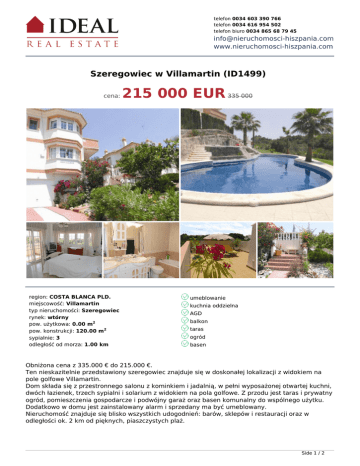 telefon 0034 603 390 766 telefon 0034 616 954 502 telefon biuro 0034 865 68 79 45 [email protected] www.nieruchomosci-hiszpania.com Szeregowiec w Villamartin (ID1499) cena: region: COSTA BLANCA PLD. miejscowość: Villamartin typ nieruchomości: Szeregowiec rynek: wtórny pow. użytkowa: 0.00 m2 pow. konstrukcji: 120.00 m2 sypialnie: 3 odległość od morza: 1.00 km 215 000 EUR 335 000 umeblowanie kuchnia oddzielna AGD balkon taras ogród basen Obniżona cena z 335.000 € do 215.000 €. Ten nieskazitelnie przedstawiony szeregowiec znajduje się w doskonałej lokalizacji z widokiem na pole golfowe Villamartin. Dom składa się z przestronnego salonu z kominkiem i jadalnią, w pełni wyposażonej otwartej kuchni, dwóch łazienek, trzech sypialni i solarium z widokiem na pola golfowe. Z przodu jest taras i prywatny ogród, pomieszczenia gospodarcze i podwójny garaż oraz basen komunalny do wspólnego użytku. Dodatkowo w domu jest zainstalowany alarm i sprzedany ma być umeblowany. Nieruchomość znajduje się blisko wszystkich udogodnień: barów, sklepów i restauracji oraz w odległości ok. 2 km od pięknych, piaszczystych plaż. Side 1 / 2 www.nieruchomosci-hiszpania.com Side 2 / 2 Powered by TCPDF (www.tcpdf.org)