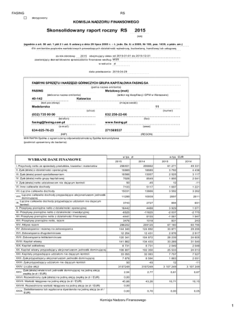 FASING RS skorygowany KOMISJA NADZORU FINANSOWEGO Skonsolidowany raport roczny RS 2015 (rok) (zgodnie z art. 56 ust. 1 pkt 2 i ust. 6 ustaw y z dnia 29 lipca 2005 r. – t. j edn. Dz. U. z 2009, Nr 185, poz. 1439, z późn. zm.) dla emitentów papierów wartościowyc h prowadząc ych działalność wytwórczą, budowlaną, handlową lub usługową za rok obrotowy 2015 obejmując y okres od 2015-01-01 do 2015-12-31 zawierający skonsolidowane sprawozdanie finansowe według MSR w walucie zł data przekazania: 2016-04-29 FABRYKI SPRZĘTU I NARZĘDZI GÓRNICZYCH GRUPA KAPITAŁOWA FASING SA FASING 40-142 (pełna nazwa emitenta) Metalowy (met) (skróc ona nazwa emitenta) (kod poc ztowy) Modelarska (032) 735 00 00 (sektor wg klasyfikacji GPW w Warszawie) Katowice (miejscowość) (ulic a) 032 258-22-66 (telefon) [email protected] www.fasing.pl 634-025-76-23 271569537 (e-mail) (NIP) 11 (numer) (fax) (www) (REGON) MW RAFIN Spółka z ograniczoną odpowiedzialnośc ią Spółka komandytowa (podmiot uprawniony do badania) WYBRANE DANE FINANSOWE 2015 I. Przyc hody netto ze sprzedaży produktów, towarów i materiałów w tys. zł 256401 II. Zysk (strata) z działalności operacyjnej 15869 III. Zysk (strata) przed opodatkowaniem 10566 IV. Zysk (strata) netto grupy kapitalowej 7928 V. Zysk (strata) netto udziałowc om nie dając ym kontroli 2014 206662 18585 13057 8549 50 VI. Inne c ałkowite doc hody 7103 VII. Łąc zne c ałkowite doc hody Łąc zne c ałkowite doc hody przypadając e akcjonariuszom jednostki VIII. dominującej Łąc zne c ałkowite doc hody przypadając e udziałom nie dajacym IX. kontroli X. Przepływy pieniężne netto z działalnośc i operacyjnej XI. Przepływy pieniężne netto z działalnośc i inwestyc yjnej XII. Przepływy pieniężne netto z działalnośc i finansowej XIV. Aktywa razem w tys. EUR 61 271 3 792 2 525 1 895 12 -11625 -2 037 3476 1018 831 4488 8155 894 3 929 -1 061 259125 67 160 12 431 2 876 144 340 124 692 XVII. Zobowiązania krótkoterminowe 120 341 104 872 28 239 8 731 8 731 2 049 XVIII. Kapitał własny 141 862 XIX. Kapitał zakładowy XX. Kapitał własny przypadając y akc jonariuszom jednostki dominującej XXI. Kapitały przypadając e udziałom nie dając ym kontroli XXII. Zysk przypadajac y akcjonariuszom jednostki dominując ej XXIII. Zysk przypadając y udziałom nie dającym kontroli Zysk (strata) właścic ieli jednostki dominującej na jedną akcję zwykłą (w zł / EUR) XXVI. Rozwodniony zysk (strata) na jedną akc ję zwykłą (w zł / EUR) XXVIII. Rozwodniona wartość księgowa na jedną akc ję (w zł / EUR) XXIX. 1 947 243 60 795 29 255 2 917 24 605 31 540 2 048 24 013 7 878 8 594 1 883 2 051 33 055 32 083 -45 7 757 12 7 527 -11 3107249 3 107 249 3 107 249 45,66 43,26 10,71 10,15 0,00 0,70 0,00 0,05 0,00 Zadeklarowana lub wypłacona dywidenda na jedną akc ję (w zł / EUR) 1 071 -2 775 25 533 2,54 XXVII. Wartość księgowa na jedną akc ję (w zł / EUR) 33 289 651 102 350 3107249 XXV. 134 433 33 871 3 262 108 807 50 XXIV. Liczba akcji -11 2611 -8525 12 254 2 041 2697 3 592 XV. Zobowiązania i rezerwy na zobowiązania XVI. Zobowiązania długoterminowe 3 117 10939 2727 286202 4 436 1 221 3743 16442 49 331 1 697 13666 11288 2014 5117 15031 -4441 XIII. Przepływy pieniężne netto, razem -45 2015 0,00 2,77 Komisja Nadzoru Finansowego 0,61 0,67 1 FASING RS ZAWARTOŚĆ RAPORTU Plik Opis RS2015.pdf PODPISY WSZYSTKICH CZŁONKÓW ZARZĄDU Data Imię i Nazwisko Stanowisko/Funkc ja 2016-04-29 Zofia Guzy Wic eprezes Zarządu 2016-04-29 Maksymilian Klank Wic eprezes Zarządu Podpis PODPIS OSOBY, KTÓREJ POWIERZONO PROWADZENIE KSIĄG RACHUNKOWYCH Data 2016-04-29 Imię i Nazwisko Grażyna Dudek Stanowisko/Funkc ja Prokurent, Główny Księgowy Podpis Komisja Nadzoru Finansowego 2