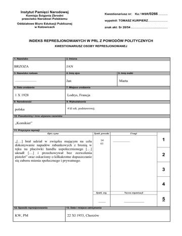 Instytut Pamięci Narodowej Kwestionariusz nr: Ka / WSR/0266 ......... Komisja Ścigania Zbrodni przeciwko Narodowi Polskiemu wypełnił: TOMASZ KURPIERZ ................... Oddziałowe Biuro Edukacji Publicznej w Katowicach znak akt: Sr 20/54 .................................... INDEKS REPRESJONOWANYCH W PRL Z POWODÓW POLITYCZNYCH KWESTIONARIUSZ OSOBY REPRESJONOWANEJ 1. Nazwisko 2. Imiona BRZOZA JAN 3. Nazwisko rodowe 4. Imię ojca ______________ 5. Imię matki Jan 6. Data urodzenia Marta 7. Miejsce urodzenia 1 X 1928 Lodrys, Francja 8. Narodowość 9. Wykształcenie 4 kl szk. podstawowej. polska 10. Pseudonimy i inne używane nazwiska „Komikier” 11. Przyczyna represji Opis czynu Symb. powodu „[…] brał udział w związku mającym na celu dokonywanie napadów rabunkowych z bronią w ręku na placówki handlu uspołecznionego […] ukradł […] i przechowywał bez zezwolenia pistolet” oraz oskarżony o kilkakrotne dopuszczanie się zaboru mienia społecznego i prywatnego. 14 61 Uwagi ___________ 1 2 3 4 12. Sposób represjonowania KW, PM Symb. org. Nazwa organizacji ____ ___________ 13. Data i miejsce zatrzymania 22 XI 1953, Chorzów 5 14. Osoby represjonujące rew.: Sawin Kazimierz, MO Chorzów post. o tymcz. areszt.: Krzykawski Stanisław, KW MO Stalinogród post. o wszczęciu śledztwa: Krzykawski Stanisław, KW MO Stalinogród post. o pociągn. do odp.: Krzykawski Stanisław, KW MO Stalinogród przesł.: Sawin Kazimierz, MO Chorzów Krzykawski Stanisław, KW MO Stalinogród sporz. akt osk.: Krzykawski Stanisław, KW MO Stalinogród zatw. akt osk.: Obuchowicz Zdzisław, WPR Stalinogród 15. Data represji 29 I 1954 16. Miejsce represji Chorzów 17. Instytucja represjonująca 18. Znak akt Sr 20/54 WSR KATOWICE (Stalinogród) 19. Przewodniczący składu sędziowskiego Kluza Kazimierz 20. Pozostali sędziowie / asesorzy / ławnicy Urban Tadeusz (as) Zimniak Henryk (ł) 21. Oskarżyciel 22. Obrońca Wróblewski Bronisław Szmidt Otton 23. Wyrok w pierwszej instancji KARA ŚMIERCI, UTRATA PRAW NA ZAWSZE, PRZEPADEK MIENIA 24. Późniejsze zmiany kary i podstawa zwolnienia Postanowieniem N.S.W. z 8 III 1954 zamieniona na 15 lat więzienia z utratą praw na 5 lat. 25. Data zwolnienia 22 X 1968 (Postanowieniem Sądu Wojewódzkiego w Stalinogrodzie z 17 V 1956, na 26. Data śmierci podstawie amnestii z 27 IV 1956, częściowo zamieniono na 10 lat z utratą praw na 2,5 roku, utrzymano jednak łączną karę 15 lat więzienia). ___________ Postanowieniem Sądu Wojewódzkiego w Koszalinie z 14 X 1968 zarządzono warunkowe zwolnienie. 27. Miejsce śmierci _____________ 28. Przyczyna śmierci 29. Miejsce pochówku _______________ _______________ 31. Źródło informacji Archiwum Państwowe w Katowicach, Sąd Wojewódzki Katowice, WSR Katowice, sygn. Sr 20/54. 32. Uwagi _______________ 30. Data rehabilitacji lub unieważn. wyroku ___________