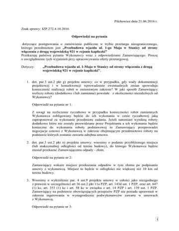 Pilchowice dnia 21.06.2016 r. Znak sprawy: IZP.272.4.10.2016 Odpowiedzi na pytania dotyczące postępowania o zamówienie publiczne w trybie przetargu nieograniczonego, którego przedmiotem jest „Przebudowa wjazdu ul. 1-go Maja w Stanicy od strony włączenia z drogą wojewódzką 921 w rejonie kapliczki” Przekazuję państwu pytania Wykonawcy wraz z odpowiedziami Zamawiającego. Proszę o uwzględnienie tych wyjaśnień przy opracowywaniu oferty przetargowej. Dotyczy: „Przebudowa wjazdu ul. 1-Maja w Stanicy od strony włączenia z drogą wojewódzką 921 w rejonie kapliczki”. 1. dot. par.3 ust.2 pkt g) projektu umowy: co w przypadku, gdy wady dokumentacji projektowej i w konsekwencji wprowadzenie ewentualnych zmian spowoduje konieczność realizacji robót w zmienionym zakresie? W jaki sposób Zamawiający rozliczy roboty (dodatkowe i/lub zamienne) powstałe z okoliczności niezależnych od Wykonawcy? Odpowiedź na pytanie nr 1: Z uwagi na rozliczenie ryczałtowe w przypadku konieczności robót zamiennych Wykonawca zobligowany będzie do ich wykonania w cenie ryczałtowej jaką zaproponował za wykonanie przedmiotu zadania. Jeżeli natomiast wynikną roboty dodatkowe które nie zostały przewidziane przez Projektanta a ich wykonanie będzie konieczne do wykonania roboty podstawowej to Zamawiający przeprowadzi negocjacje cenowe z Wykonawcą w zakresie obejmującym przedmiotowe roboty na podstawie których zostanie zawarta odrębna umowa. 2. dot. par.3 ust.2 pkt n) projektu umowy: wnosimy o podanie przybliżonego miejsca (lub maksymalnej odległości od terenu budowy), do którego Wykonawca będzie musiał przekazać Zamawiającemu odpady - złom. Odpowiedź na pytanie nr 2: Zamawiający wskaże miejsce przekazania odpadów w tym złomu po podpisaniu umowy z wykonawcą. Miejsce to będzie w odległości nie większej niż 10 km od terenu budowy. 3. Wnosimy o wykreślenie par. 4 ust.9 projektu umowy w całości jako niezgodnego z prawem w szczególności art 36 ust.2 pkt 11a PZP, art. 143d ust. 1 PZP, oraz art. 647 (1) kc, art. 353 (1) kc i art. 58 kc w związku z art. 14 PZP i art. 139 ust. 1 PZP. Zamawiający na podstawie obowiązujących przepisów PZP nie posiada uprawnień w zakresie ingerowania w wynagrodzenie podwykonawców zawarte w umowach z Wykonawcą. Odpowiedź na pytanie nr 3: 1 Zamawiający wykreśla zapis par.4 ust 9 z projektu umowy. 4. dot. par. 6 ust.1 pkt b) projektu umowy: wnosimy o korektę zapisu - doprowadzenie do zgodności w odniesieniu do art. 83 prawa upadłościowego. Odpowiedź na pytanie nr 4: Zamawiający wykreśla z projektu umowy par. 6 ust.1 pkt b) 5. dot. par. 10 ust.1 pkt a), b) projektu umowy: - Wnosimy o zmianę z "opóźnienia" na zwłokę. Wykonawca nie może odpowiadać za opóźnienia w dotrzymaniu terminów umownych zależne np. od Zamawiającego. Na poparcie niniejszego stanowiska można wskazać wyrok SN z dnia z 17.06.2003 r.. III CKN 122/01: “Kara umowna ma na celu naprawienie szkody poniesionej przez wierzyciela na skutek niewykonania lub nienależytego wykonania zobowiązania. W art. 483 § 1 k.c. wyraźnie mowa jest o naprawieniu szkody, które następuje przez zapłatę kary umownej, a w art. 484 § 1 k.c. ustawodawca wskazuje, że kara umowna należy się bez względu na wysokość poniesionej szkody. Ustawowe określenie "bez względu na wysokość poniesionej szkody" nie może być utożsamiane z określeniem "niezależnie od poniesienia szkody" Ponadto zgodnie z wyrokiem Sądu Najwyższego z dnia 16 stycznia 2013 roku, sygnatura akt II CSK 331/2012 za opóźnienia, które są wynikiem złych warunków atmosferycznych w trakcie realizacji kontraktów na roboty budowlane nie powinna być naliczona kara umowna za ten okres. Z sentencji tego wyroku wynika, że zła pogoda wyłącza odpowiedzialność wykonawcy, skoro nie ma on z tego powodu możliwości ukończenia robót w terminie. Jednostronny w tym zakresie jest także pogląd Prezesa Urzędu Zamówień Publicznych, który we wzorze umów na roboty budowlane umieścił kary za zwłokę, nie opóźnienie, jako element dobrych praktyk w przedmiocie przygotowania umów w sprawie zamówień publicznych. Odpowiedź na pytanie nr 5 Zamawiający zmienia w par. 10 ust.1 pkt a), b) projektu umowy poprzez zmianę zapisu z "opóźnienia" na zwłokę. Powyższą informacja należy traktować jako integralną część specyfikacji istotnych warunków zamówienia. Z uwagi na to, że odpowiedź nie maja znaczenia w szacowaniu wartości zamówienia przez Wykonawców termin składania ofert nie podlega przedłużeniu. Kierownik Referatu Inwestycji i Zamówień Publicznych Joanna Kruczyńska 2