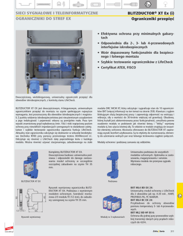 1 2 3 4 5 6 7 8 9 0 BlitzDUctOr® xt Ex (i) Ograniczniki przepięć SiEci SygNałOwE i tElEiNfOrMatyczNE OgraNiczNiki DO StrEf Ex • Efektywna ochrona przy minimalnych gabarytach • Odpowiednia dla 2-, 3- lub 4-przewodowych interfejsów iskrobezpiecznych • Wzór dopasowany funkcjonalnie dla bezpiecznego i łatwego montażu • Szybkie testowanie ograniczników z LifeCheck • Certyfikat ATEX, FISCO Dwuczęściowy, wielobiegunowy, uniwersalny ogranicznik przepięć dla obwodów iskrobezpiecznych, z kontrolą stanu LifeCheck. BLITZDUCTOR XT EX jest dwuczęściowym, 4-biegunowym, uniwersalnym ogranicznikiem przepięć do montażu na szynie spełniającym najwyższe wymagania. Jest przeznaczony dla obwodów iskrobezpiecznych i magistrali. Z punktu widzenia iskrobezpieczeństwa jest nieuziemionym urządzeniem a jego indukcyjność i pojemność własna są pomijalnie małe. Poza tym wysoki znamionowy prąd wyładowczy (min. 10x) i niski napięciowy poziom ochrony przy niewielkich impedancjach szeregowych to dodatkowe zalety. Łatwe i szybkie testowanie ogranicznika zapewnia funkcja LifeCheck. Aktualny stan ogranicznika odczytuje się dosłownie w sekundę bezdotykowo (technika RFID) przy pomocy przenośnego testera DEHNrecord LC. Odczytuje się również z LifeCheck datę poprzedniego testu z każdego modułu. Można również używać stacjonarnego, zabudowanego na stałe modułu DRC MCM XT, który odczytuje i sygnalizuje stan do 10 ograniczników BXT (więcej informacji na ten temat na stronie 59). Klawisze z ryglem blokującym służą bezpiecznej pracy i zapewniają odporność na wstrząsy i wibracje, siły o wartości do 0-krotnie większej od grawitacji. Obudowa, której kształt jest zdeterminowany przez funkcjonalność, umożliwia pewne osadzenie modułu w podstawie jak również łatwą i “lekką” wymianę modułu tj. bez użycia istotnej siły. To właśnie w module znajdują sie wszystkie elementy ochronne. Akcesoria oferowane do BLITZDUCTOR XT zapewniają wysoki komfort użytkowania. Są to etykiety do numerowania, elementy do uziemiania wolnych par oraz łatwego testowania ciągłości połączeń. Kompletny BLITZDUCTOR XT EX. Dwuczęściowa budowa: uniwersalna podstawa i odpowiedni do danego zastosowania moduł ochronny w szczególnie oszczędnej zabudowie na szynie TH 5 mm. Uniwersalna podstawa do wszystkich modułów ochronnych. Optimalna w zastosowaniu, magazynowaniu i serwisie. Wymiana modułu nie przerywa sygnału roboczego. Moduły ochronne i podstawę zamawia się oddzielnie. Podstawa BLITZDUCTOR XT EX Rysunek wymiarowy ogranicznika BLITZDUCTOR XT EX. Podstawa z wymiennym modułem ochronnym. Szerokość montażowa 2/ modułu TE (12 mm), do zabudowy szeregowej na szynie TH 5 mm. Rysunek wymiarowy www.dehn.pl Moduły w wykonaniach BXT ML4 BD EX 24: Uniwersalny moduł ochronny z LifeCheck dla 2 obwodów jak np. 4-20 mA , HART, PROFIBUS-PA, FF, NAMUR. BXT ML4 BC EX 24: Przykładowo do ochrony obwodów pomiaru temperatury - lub 4-przewodowych. BXT ML2 BD HF EX 6: Ochrona dla jednej pary przewodów szybkiej transmisji danych przy prądach roboczych do 4,8 A. 11 1 2 3 4 5 6 7 8 9 0 BlitzDUctOr® xt Ex (i) z lifecheck® SiEci SygNałOwE i tElEiNfOrMatyczNE OgraNiczNiki DO StrEf Ex Moduł Bxt Ml2 BD Hf Ex 6 OŚĆ NOW 1 1´ 2 2´ strona protected chroniona • Uniwersalnego stosowania, z kontrolą stanu LifeCheck • Niska pojemność i indukcyjność własna • Do stosowania zgodnie ze Strefową Koncepcją Ochrony Odgromowej jako przejście pomiędzy strefami 0B – 2 i wyżej 3 3´ 4 4´ Bezdotykowa (RFID) kontrola stanu ogranicznika z LifeCheck przy pomocy przenośnego testera DEHNrecord LC. Wytrzymałość izolacji > 500 V względem ziemi. Rysunek wymiarowy BXT ML2 BD HF EX 6 Moduł ochronny z LifeCheck dla ochrony 1 obwodu iskrobezpiecznego lub 1 pary przewodów magistrali RS485. BXT ML2 BD HF EX 6 Klasa ogranicznika T Kontrola stanu ogranicznika LifeCheck Napięcie znamionowe UN 6V Największe napięcie trwałej pracy DC Uc 6V Największe napięcie trwałej pracy AC Uc 4,2 V Maks. napięcie wejściowe wg EN 60079-11 Ui 4,2 V Maks. prąd wejściowy wg EN 60079-11 Ii 4,8 A Maks. prąd wejściowy wg EN 60079-11 (bez modułu tylko do 60°C) Ii 4,8 A D1 Prąd udarowy (10/350) na 1 linię Iimp 1 kA C2 Znamionowy prąd wyładowczy (8/20) razem In 10 kA C2 Znamionowy prąd wyładowczy (8/20) na 1 linię In 5 kA Napięciowy poziom ochrony linia-linia przy Iimp D1 Up ≤ 5 V Napięciowy poziom ochrony linia-PG przy Iimp D1 Up ≤ 1600 V Napięciowy poziom ochrony linia-linia przy In C2 Up ≤ 5 V Napięciowy poziom ochrony linia-PG przy In C2 Up ≤ 1800 V Napięciowy poziom ochrony linia-linia przy 1 kV/µs C3 Up ≤ 20 V Napięciowy poziom ochrony linia-PG przy 1 kV/µs C3 Up ≤ 1400 V Częstotliwość graniczna linia-linia fG 100 MHz Pojemność własna linia-linia C ≤ 25 pF Pojemność własna linia-PG C ≤ 20 pF Zakres temperatur pracy -40°C...+80°C Stopień ochrony (moduł w podstawie) IP 20 Montaż w podstawie BXT BAS Uziemienie przez podstawę BXT BAS Materiał obudowy Polyamid PA 6.6 Kolor niebieski Spełnia wymagania normy PN-EN 6164-21 Klasyfikacja SIL SIL2, szczegóły na: www.dehn.pl/de/sil/ Certyfikaty Ex ATEX: KEMA 06ATEX0274 X: II 2 G Ex ib IIC T4 ... T6 Dane potrzebne do zamówienia Typ Numer katalogowy Opakowanie jednostkowe BXT ML2 BD HF EX 6 920 538 1 szt. Akcesoria do BLITZDUCTOR® XT Ex(i) z LifeCheck® 920 01 EX BXT BAS EX 920 01 BXT BAS Akcesoria do BLITZDUCTOR® XT Ex(i) z LifeCheck® BXT BAS EX DRC MCM XT Podstawa, 4-biegunowa, do obowdów iskrobezpiecznych, z zaciskami umożliwiająca wymianę modułów bez przerywania sygnału. Z czytnikiem LifeCheck do kontroli stanu do 10 modułów BXT z LifeCheck (bezprzewodowo). Typ BXT BAS EX Opak. jedn. Numer szt. katalogowy 1 920 301 Typ DRC MCM XT Akcesoria do BLITZDUCTOR® XT Ex(i) z LifeCheck® 910 65 M Opak. jedn. Numer szt. katalogowy 1 910 695 DRC LC M Ableiterprüfgerät LifeCheck DRC LC 910 65