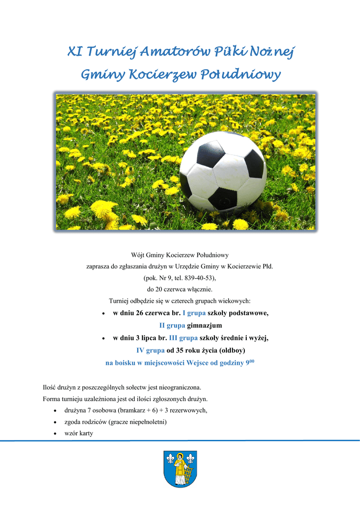 XI Turniej Amatorów Piłki Nożnej Gminy Kocierzew Południowy Wójt Gminy Kocierzew Południowy zaprasza do zgłaszania drużyn w Urzędzie Gminy w Kocierzewie Płd. (pok. Nr 9, tel. 839-40-53), do 20 czerwca włącznie. Turniej odbędzie się w czterech grupach wiekowych: w dniu 26 czerwca br. I grupa szkoły podstawowe, II grupa gimnazjum w dniu 3 lipca br. III grupa szkoły średnie i wyżej, IV grupa od 35 roku życia (oldboy) na boisku w miejscowości Wejsce od godziny 900 Ilość drużyn z poszczególnych sołectw jest nieograniczona. Forma turnieju uzależniona jest od ilości zgłoszonych drużyn. drużyna 7 osobowa (bramkarz + 6) + 3 rezerwowych, zgoda rodziców (gracze niepełnoletni) wzór karty