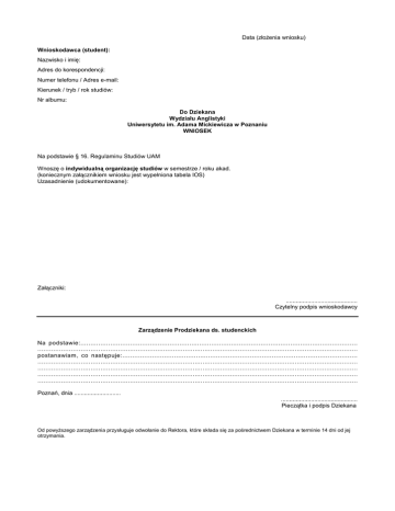 Data (złożenia wniosku) Wnioskodawca (student): Nazwisko i imię: Adres do korespondencji: Numer telefonu / Adres e-mail: Kierunek / tryb / rok studiów: Nr albumu: Do Dziekana Wydziału Anglistyki Uniwersytetu im. Adama Mickiewicza w Poznaniu WNIOSEK Na podstawie § 16. Regulaminu Studiów UAM Wnoszę o indywidualną organizację studiów w semestrze / roku akad. (koniecznym załącznikiem wniosku jest wypełniona tabela IOS) Uzasadnienie (udokumentowane): Załączniki: ........................................... Czytelny podpis wnioskodawcy Zarządzenie Prodziekana ds. studenckich Na podstawie:............................................................................................................................................ ................................................................................................................................................................... postanawiam, co następuje:...................................................................................................................... ................................................................................................................................................................... ................................................................................................................................................................... ................................................................................................................................................................... ................................................................................................................................................................... Poznań, dnia ............................ .............................................. Pieczątka i podpis Dziekana Od powyższego zarządzenia przysługuje odwołanie do Rektora, które składa się za pośrednictwem Dziekana w terminie 14 dni od jej otrzymania. Indywidualna organizacja studiów Lista przedmiotów, na które student nie może uczęszczać regularnie Przedmiot Nazwisko prowadzącego Sposób zaliczenia (forma, częstotliwość, etc.) Podpis prowadzącego