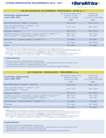 CENNIK PRZEWOZÓW PASAŻERSKICH 2016 / 2017 M/F JAN ŚNIADECKI, M/F KOPERNIK - ŚWINOUJŚCIE - YSTAD & v.v. 01.02-30.03; 08.05-13.06 04.09-14.12.2017 15.01-31.01.2018 O/W 31.03-07.05; 14.06-03.09; 15.12.2017-14.01.2018 O/W Samochód osobowy*, minibus* + kierowca 930 / 427,8 1035 / 476,1 Duży samochód osobowy**, minibus**, van**, pojazd holujący*** + kierowca 1135 / 522,1 1265 / 581,9 Motocykl + kierowca 590 / 271,4 660 / 303,6 Dodatkowy pasażer w samochodzie - przejazd, posiłek****, kabina***** Rower+pasażer******przejazd, jedzenie****, kabina***** 290 / 133,4 425 / 195,5 310 / 142,6 450 / 207 bez opłat bez opłat 570 / 262,2 630 / 289,8 bez opłat bez opłat Pasażerowie zmotoryzowani (ceny w SEK / PLN) Dziecko do lat 7 - przejazd, posiłek****, kabina***** Przyczepa Rower Ważne! Dodatek bunkrowy i ekologiczny w wysokości 15 / 6,90 za osobę nie jest wliczony do powyższych cen. * Samochód osobowy - przewóz obejmuje pojazd, którego wysokość wynosi do 2,4 m, długość do 6 m oraz waga całkowita wynosi do 3,5 tony. ** Duże samochody osobowe, minibusy, vany, techniczne pojazdy holujące - przewóz obejmuje pojazdy, których wysokość wynosi do 3,6 m, długość do 10 m oraz waga całkowita nie przekracza 3,5 tony. UWAGA! Łączna długość zestawów samochodowych (np. samochód osob.+przeczepa czy samochód osob.+kemping) nie może przekroczyć 12 m. *** bez samochodu na pojezdzie holującym **** 2 posiłki ***** Kabina; miejsce w kabinie 2 lub 4 osobowej ****** dwa oddzielnie liczone miejsca dla pasażera i roweru ZASADY PRZEJAZDU 1. Powyższe ceny dotyczą przejazdu tylko w jedną stronę 2. Sprzedaż biletów na przejazd odbywa się bezpośrendnio na teminalach promowych w Świnoujściu, Ystad i Trelleborgu bez możliwości wcześniejszej rezerwacji miejsc. 3. Bilety pasażerskie sprzedane na podróż promami "Polonią" czy "Skanią" nie będą akceptowane. M/F GALILEUSZ - ŚWINOUJŚCIE - TRELLEBORG & v.v. 01.02-30.03; 08.05-13.06 04.09-14.12.2017 15.01-31.01.2018 O/W 31.03-07.05; 14.06-03.09; 15.12.2017-14.01.2018 O/W Samochód osobowy*, minibus* + kierowca 930 / 427,8 1035 / 476,1 Duży samochód osobowy**, minibus**, van**, pojazd holujący*** + kierowca 1135 / 522,1 1265 / 581,9 Motocykl + kierowca 590 / 271,4 660 / 303,6 Dodatkowy pasażer w samochodzie - przejazd, posiłek****, kabina***** Rower+pasażer******przejazd, jedzenie****, kabina***** 290 / 133,4 425 / 195,5 310 / 142,6 450 / 207 bez opłat bez opłat 570 / 262,2 630 / 289,8 bez opłat bez opłat Pasażerowie zmotoryzowani (ceny w SEK / PLN) Dziecko do lat 7 - przejazd, posiłek****, kabina***** Przyczepa Rower Ważne! Dodatek bunkrowy i ekologiczny w wysokości 15 / 6,90 za osobę nie jest wliczony do powyższych cen. * Samochód osobowy - przewóz obejmuje pojazd, którego wysokość wynosi do 2,4 m, długość do 6 m oraz waga całkowita wynosi do 3,5 tony. ** Duże samochody osobowe, minibusy, vany, techniczne pojazdy holujące - przewóz obejmuje pojazdy, których wysokość wynosi do 3,6 m, długość do 10 m oraz waga całkowita nie przekracza 3,5 tony. UWAGA! Łączna długość zestawów samochodowych (np. samochód osob.+przeczepa czy samochód osob.+kemping) nie może przekroczyć 12 m. *** bez samochodu na pojezdzie holującym **** 2 posiłki ***** Kabina; miejsce w kabinie 2 lub 4 osobowej ****** dwa oddzielnie liczone miejsca dla pasażera i roweru ZASADY PRZEJAZDU 1. Powyższe ceny dotyczą przejazdu tylko w jedną stronę 2. Sprzedaż biletów na przejazd odbywa się bezpośrendnio na teminalach promowych w Świnoujściu, Ystad i Trelleborgu bez możliwości wcześniejszej rezerwacji miejsc. 3. Bilety pasażerskie sprzedane na podróż promami "Polonią" czy "Skanią" nie będą akceptowane.