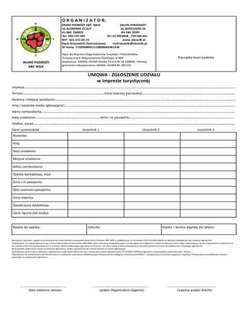 O R G A N I Z A T O R: BIURO PODRÓŻY ABC WILK SALON SPRZEDAŻY: UL.KLONOWA 15 D/3 UL.KOŚCIUSZKI 24 41-800 ZABRZE 44-240 ŻORY Tel: 603 570 301 Tel: 32 4450498 , 730 044 441 NIP: 641-212-05-15 www..abcwilk.pl Bank Gospodarki Żywnościowej mail:[email protected] Nr konta 77203000451110000002481240 BIURO PODRÓŻY ABC WILK Wpis do Rejestru Organizatorów Turystyki i Pośredników Turystycznych Województwa Ślaskiego nr 960 Gwarancja SIGNAL IDUNA Polska TU.S.A Nr M 228836 Umowa generalna Ubezpieczenia SIGNAL IDUNA Nr 201155 Pieczątka biura podróży UMOWA - ZGŁOSZENIE UDZIAŁU w imprezie turystycznej Impreza:.......................................................................................................................................................... Termin:........................................................... Cena imprezy (od osoby).................................................................... Godzina i miejsce wsiadania:.................................................................................................................................... Imię i nazwisko osoby zgłaszającej:............................................................................................................................. Adres zamieszkania.............................................................................................................................................. Data urodzenia:............................................... Seria i nr paszportu:............................................................................ Telefon, email.................................................................................................................................................... Dane uczestników Uczestnik 1 Uczestnik 2 Uczestnik 3 Nazwisko Imię Data urodzenia Miejsce urodzenia Adres zamieszkania Telefon kontaktowy, mail Seria i nr paszportu Data ważności paszportu Cena imprezy Świadczenia dodatkowe Cena łączna (od osoby) Razem do zapłaty: Zaliczka: Kwota i termin dopłaty do całości: Niniejszym wyrażam zgodę na przetwarzanie moich danych osobowych przez Biuro Podróży ABC Wilk z siedzibą przy ul. Klonowej 15d/3 41-800 Zabrze w zakresie niezbędnym do realizacji zgłoszenia.. Oświadczam ,że zapoznałem/am się z treścią Warunków Uczestnictwa ABC Wilk ,które stanowią integralną część umowy zgłoszenia..Zgłaszam udział w imprezie w/w osoby i zobowiązuje się do uregulowania należności za ich udział,w terminie przewidzianym w umowie. Osoba dokonująca zgłoszenia w imieniu i na rzecz osoby trzeciej oświadcza,że posiada pełnomocnictwo do dokonania niniejszego zgłoszenia. W przypadku dokonania zmian na umowie zgłoszeniu, osoba uprawniona do zmiany danych to osoba zgłaszająca. Oświadczam,że w imieniu własnym i zgłoszonych osób zapoznałem/am się z treścią warunków ubezpieczenia TU SIGNAL IDUNA,programem imprezy,które stanowią część umowy . Oświadczam,że zostałem/am poinformowana o możliwości wykupienia dodatkowego ubezpieczenia następstw chorób przewlekłych i ubezpieczenia kosztów rezygnacji z podróży. Potwierdzam prawidłowość danych zawartych w powyższym zgłoszeniu. ................................................. data zawarcia umowy ............................................................. podpis Organizatora (Agenta) ................................................... Czytelny podpis Klienta