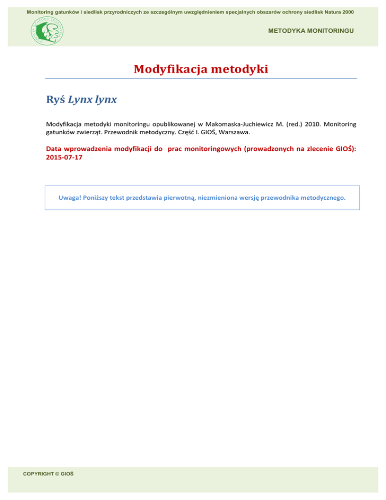 Monitoring gatunków i siedlisk przyrodniczych ze szczególnym uwzględnieniem specjalnych obszarów ochrony siedlisk Natura 2000 METODYKA MONITORINGU Modyfikacja metodyki Ryś Lynx lynx Modyfikacja metodyki monitoringu opublikowanej w Makomaska-Juchiewicz M. (red.) 2010. Monitoring gatunków zwierząt. Przewodnik metodyczny. Część I. GIOŚ, Warszawa. Data wprowadzenia modyfikacji do prac monitoringowych (prowadzonych na zlecenie GIOŚ): 2015-07-17 Uwaga! Poniższy tekst przedstawia pierwotną, niezmieniona wersję przewodnika metodycznego. COPYRIGHT © GIOŚ