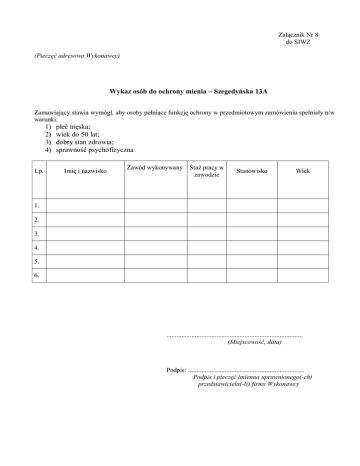 Załącznik Nr 8 do SIWZ (Pieczęć adresowa Wykonawcy) Wykaz osób do ochrony mienia – Szegedyńska 13A Zamawiający stawia wymógł, aby osoby pełniące funkcję ochrony w przedmiotowym zamówieniu spełniały n/w warunki: 1) 2) 3) 4) Lp. płeć męska; wiek do 50 lat; dobry stan zdrowia; sprawność psychofizyczna Imię i nazwisko Zawód wykonywany Staż pracy w zawodzie Stanowisko Wiek 1. 2. 3. 4. 5. 6. .................................................................................. (Miejscowość, data) Podpis: ...................................................................... Podpis i pieczęć imienna uprawnionego(-ch) przedstawiciela(-li) firmy Wykonawcy