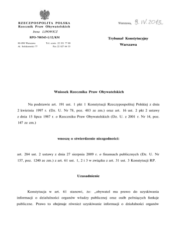 R Z E C Z P O S P O L I T A POLSKA Rzecznik Praw O b y w a t e l s k i c h Irena LIPOWICZ RPO-700343-I/12/KM 00-090 Warszawa Al. Solidarności 77 Trybunał Konstytucyjny Tel. centr. 22 551 77 00 Warszawa Fax 22 827 64 53 Wniosek Rzecznika Praw Obywatelskich Na podstawie art. 191 ust. 1 pkt 1 Konstytucji Rzeczypospolitej Polskiej z dnia 2 kwietnia 1997 r. (Dz. U. Nr 78, poz. 483 ze zm.) oraz art. 16 ust. 2 pkt 2 ustawy z dnia 15 lipca 1987 r. o Rzeczniku Praw Obywatelskich (Dz. U. z 2001 r. Nr 14, poz. 147 ze zm.) wnoszę o stwierdzenie niezgodności: art. 284 ust. 2 ustawy z dnia 27 sierpnia 2009 r. o finansach publicznych (Dz. U. Nr 157, poz. 1240 ze zm.) z art. 61 ust. 1, 2 i 3 w związku z art. 31 ust. 3 Konstytucji RP. Uzasadnienie Konstytucja w art. 61 stanowi, że: „obywatel ma prawo do uzyskiwania informacji o działalności organów władzy publicznej oraz osób pełniących funkcje publiczne. Prawo to obejmuje również uzyskiwanie informacji o działalności organów 2 samorządu gospodarczego organizacyjnych w i zawodowego a także innych osób oraz jednostek zakresie, w jakim wykonują one zadania władzy publicznej i gospodarują mieniem komunalnym lub majątkiem Skarbu Państwa." Zgodnie z art. 61 ust. 2 Konstytucji, prawo to obejmuje dostęp do dokumentów oraz wstęp na posiedzenia kolegialnych organów władzy publicznej pochodzących z powszechnych wyborów, z możliwością rejestracji dźwięku lub obrazu. Prawo do uzyskiwania informacji o organach publicznych jest jedną z gwarancji funkcjonowania demokratycznego państwa. Jak zauważył Trybunał Konstytucyjny w wyroku z dnia 15 października 2009 r. o sygn. K 26/08, powszechny i szeroki dostęp do informacji publicznej stanowi niezbędną przesłankę istnienia społeczeństwa obywatelskiego, a co za tym idzie - urzeczywistnienia demokratycznych zasad funkcjonowania władzy publicznej w polskim państwie prawnym. Konstytucja w art. 61 ust. 4 przewiduje, że tryb udzielania informacji określają ustawy. Najważniejszym aktem prawnym, będącym uszczegółowieniem przewidzianej w Konstytucji gwarancji prawa do informacji, jest ustawa z dnia 6 września 2001 r. o dostępie do informacji publicznej (Dz. U. Nr 112, poz. 1198 ze zm.). Ustawa rozwija konstytucyjną definicję informacji publicznej, stanowiąc, że jest to „każda informacja o sprawach publicznych". Przepis art. 6 ustawy zawiera przykładowy katalog informacji publicznej. Należy zauważyć, że pojęcie informacji publicznej nie może być rozpatrywane wyłącznie na tle art. 1 tej ustawy bez uwzględnienia treści art. 61 Konstytucji. Zastosowana wykładnia językowa mogłaby bowiem wówczas prowadzić do zbyt wąskiego rozumienia tego terminu (wyrok NSA z dnia 25 marca 2003 r. o sygn. II SA 4059/02, por. także M. Jaśkowska, Dostęp do informacji publicznych w świetle orzecznictwa Naczelnego Sądu Administracyjnego, Toruń 2002, s. 16-17). Naczelny Sąd Administracyjny opowiada się za szerokim rozumieniem pojęcia informacji publicznej, stwierdzając, że informację publiczną stanowi każda wiadomość wytworzona przez szeroko rozumiane władze publiczne oraz osoby pełniące funkcje publiczne, a także inne podmioty, które tę władzę bądź realizują bądź gospodarują mieniem komunalnym lub majątkiem Skarbu Państwa w zakresie swoich kompetencji (por. wyrok z dnia 30 października 2002 r. o sygn. II SA 1956/02, wyrok z dnia 12 grudnia 2006 r. o sygn. I OSK 123/06, wyrok z dnia 8 czerwca 2011 r. o sygn. I OSK 391/11). 3 Art. 1 ust. 2 ustawy o dostępie do informacji publicznej stanowi, że „przepisy ustawy nie naruszają przepisów innych ustaw określających odmienne zasady i tryb dostępu do informacji będących informacjami publicznymi". Takie odrębne zasady zostały np. ustanowione w ustawie z dnia 27 kwietnia 2001 r. - Prawo ochrony środowiska (D. U. z 2008 r. Nr 25, poz. 150 ze zm.). Jeszcze inaczej została przez ustawodawcę potraktowana kwestia dostępu do dokumentów wytworzonych przez audytora wewnętrznego w trakcie prowadzenia audytu. Ustawa o finansach publicznych nie ustanawia bowiem odmiennego trybu lub zasad dostępu do tych dokumentów, ale stanowi w art. 284 ust. 2, że dokumenty wytworzone przez audytora (inne niż plan audytu i sprawozdanie z wykonania planu audytu) w trakcie prowadzenia audytu nie stanowią informacji publicznej. Zgodnie z ustawą o finansach publicznych, audyt wewnętrzny jest działalnością niezależną i obiektywną której celem jest wspieranie ministra kierującego działem lub kierownika jednostki w realizacji celów i zadań przez systematyczną ocenę kontroli zarządczej oraz czynności doradcze. Instytucja audytu wewnętrznego została wprowadzona do polskiego porządku prawnego nowelizacją ustawy o finansach publicznych z dnia 27 lipca 2001 r. (Dz. U. Nr 102, poz. 1116). Zgodnie ze stanowiskiem Unii Europejskiej, nie było w Polsce jednolitej struktury, która gwarantowałaby właściwą kontrolę wykorzystania środków wspólnotowych, a wprowadzenie audytu pozwoliło zamknąć rozdział „Kontrola finansowa" w ramach negocjacji akcesyjnych (por. M. Anczakowski, Charakter prawny audytu wewnętrznego, „Państwo i Prawo" nr 8/2008, s. 103). Polska zobowiązała się do uregulowania prawnego problematyki wewnętrznej kontroli finansowej i audytu wewnętrznego w celu poprawy skuteczności oraz przejrzystości funkcjonowania administracji publicznej, lepszego wykorzystania publicznych środków finansowych, w tym funduszy pochodzących z budżetu Unii Europejskiej (E. Chojna-Duch, Kontrola finansowa i audyt - ustawowe implikacje, w: „Kontrola i audyt w administracji publicznej. Stan i perspektywy", pod red. B. Kuca i L. Smolaka, Kraków 2003, s. 18). Jak stanowi art. 274 ustawy o finansach publicznych, audyt prowadzi się w Kancelarii Prezesa Rady Ministrów, ministerstwach, urzędach wojewódzkich, izbach celnych, izbach skarbowych, Zakładzie Ubezpieczeń Społecznych, Kasie 