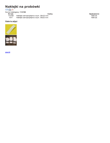 Naklejki na probówki Numer katalogowy: 112190 Nr kat. Cechy 112190 Naklejki samoprzylepne o wym. 38x23 mm 1017 Naklejki samoprzylepne o wym. 35x22 mm Galeria zdjęć powrót Opakowanie 1000 szt. 1000 szt.