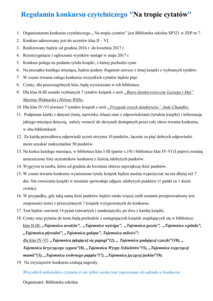 Regulamin konkursu czytelniczego "Na tropie cytatów" 1. Organizatorem konkursu czytelniczego „ Na tropie cytatów” jest Biblioteka szkolna SP321 w ZSP nr 7. 2. Konkurs adresowany jest do uczniów klas II – VI. 3. Realizowany będzie od grudnia 2016 r. do kwietnia 2017 r. 4. Rozstrzygnięcie i ogłoszenie wyników nastąpi w maju 2017 r. 5. Konkurs polega na podaniu tytułu książki, z której pochodzi cytat. 6. Na początku każdego miesiąca, będzie podany fragment zawsze z innej książki z wybranych tytułów. 7. W czasie trwania całego konkursu wszystkich cytatów będzie pięć. 8. Cytaty, dla poszczególnych klas, będą wywieszane w ich bibliotece. 9. Dla klas II-III zostało wybranych 7 tytułów książek z serii „Biuro detektywistyczne Lassego i Mai” Martina Widmarka i Heleny Willis. 10. Dla klas IV-VI również 7 tytułów książek z serii „Przygody trzech detektywów” Andy Chandler. 11. Podpisane kartki z danymi (imię, nazwisko, klasa) oraz z odpowiedziami (tytułem książki) i informacją jakiego miesiąca dotyczą, należy wrzucić do skrzynek dostępnych przez cały okres trwania konkursu, w obu bibliotekach. 12. Za każdą prawidłową odpowiedź uczeń otrzyma 10 punktów, łącznie za pięć dobrych odpowiedzi może uzyskać maksymalnie 50 punktów. 13. Na końcu każdego miesiąca, w bibliotece klas I-III (parter s.19) i bibliotece klas IV-VI (I piętro) zostaną umieszczone listy uczestników konkursu z ilością zdobytych punktów. 14. Wygrywa ta osoba, która od grudnia do kwietnia zbierze największą ilość punktów. 15. W czasie trwania konkursu wymienione tytuły książek będzie można wypożyczać na nie dłużej niż 7 dni. Nie zwrócenie książki w terminie spowoduje odjęcie zdobytych punktów (1 punkt za 1 dzień zwłoki). 16. W przypadku, gdy taką samą ilość punktów będzie miało więcej osób zostanie przeprowadzony test znajomości treści z przeczytanych 7 książek wytypowanych do konkursu. 17. Test będzie zawierał 14 pytań (otwartych i zamkniętych), po dwa z każdej książki. 18. Cytaty oraz pytania do testu będą pochodzić z następujących książek znajdujących się w bibliotece: klas II-III: „Tajemnica urodzin”, „Tajemnica wyścigu”, „Tajemnica gazety”, „Tajemnica szpitala”, „Tajemnica pływalni”, „Tajemnica galopu”, Tajemnica miłości”; dla klas IV-VI: „Tajemnica jąkającej się papugi”(2), „ Tajemnica gadającej czaszki”(10), „ Tajemnica krzyczącego zegara”(8), „Tajemnica Wyspy Szkieletów”(5), „Tajemnica szepczącej mumii”(3), „Tajemnica srebrnego pająka”(7), „Tajemnica jęczącej jaskini”(9). 19. Na zwycięzców konkursu czekają nagrody. Wszystkich miłośników czytania (i nie tylko) serdecznie zapraszamy do udziału w konkursie. Organizator: Biblioteka szkolna