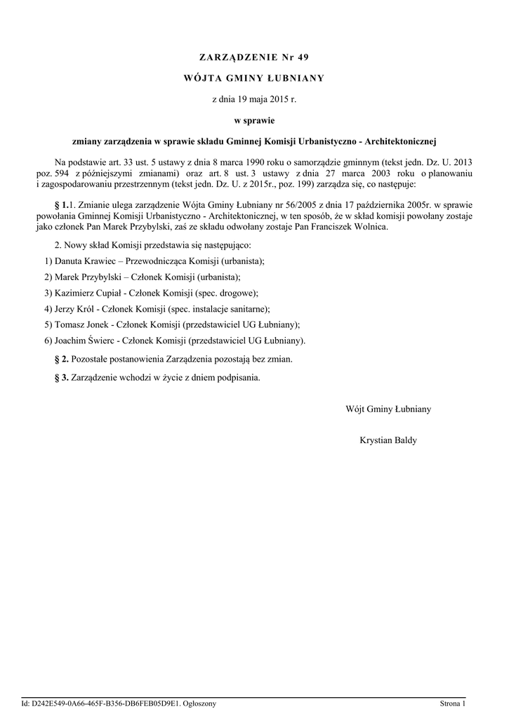 ZAR ZĄD ZENIE Nr 4 9 WÓ JTA GMINY ŁU B NIANY z dnia 19 maja 2015 r. w sprawie zmiany zarządzenia w sprawie składu Gminnej Komisji Urbanistyczno - Architektonicznej Na podstawie art. 33 ust. 5 ustawy z dnia 8 marca 1990 roku o samorządzie gminnym (tekst jedn. Dz. U. 2013 poz. 594 z późniejszymi zmianami) oraz art. 8 ust. 3 ustawy z dnia 27 marca 2003 roku o planowaniu i zagospodarowaniu przestrzennym (tekst jedn. Dz. U. z 2015r., poz. 199) zarządza się, co następuje: § 1.1. Zmianie ulega zarządzenie Wójta Gminy Łubniany nr 56/2005 z dnia 17 października 2005r. w sprawie powołania Gminnej Komisji Urbanistyczno - Architektonicznej, w ten sposób, że w skład komisji powołany zostaje jako członek Pan Marek Przybylski, zaś ze składu odwołany zostaje Pan Franciszek Wolnica. 2. Nowy skład Komisji przedstawia się następująco: 1) Danuta Krawiec – Przewodnicząca Komisji (urbanista); 2) Marek Przybylski – Członek Komisji (urbanista); 3) Kazimierz Cupiał - Członek Komisji (spec. drogowe); 4) Jerzy Król - Członek Komisji (spec. instalacje sanitarne); 5) Tomasz Jonek - Członek Komisji (przedstawiciel UG Łubniany); 6) Joachim Świerc - Członek Komisji (przedstawiciel UG Łubniany). § 2. Pozostałe postanowienia Zarządzenia pozostają bez zmian. § 3. Zarządzenie wchodzi w życie z dniem podpisania. Wójt Gminy Łubniany Krystian Baldy Id: D242E549-0A66-465F-B356-DB6FEB05D9E1. Ogłoszony Strona 1
