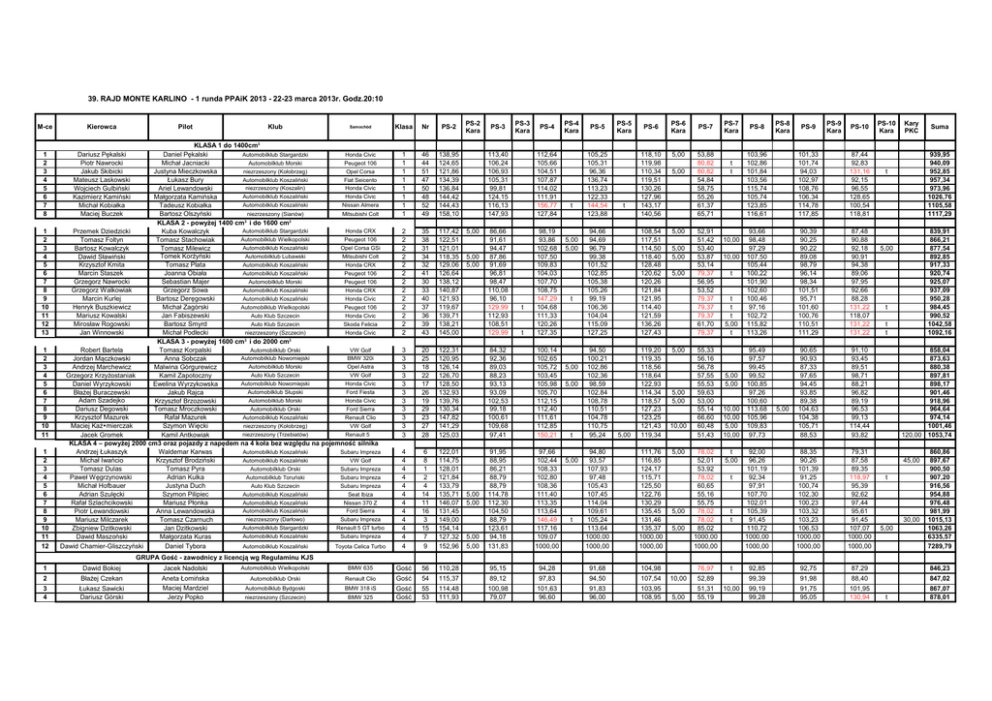 39. RAJD MONTE KARLINO - 1 runda PPAiK 2013 - 22-23 marca 2013r. Godz.20:10 M-ce Kierowca Pilot Klub Samochód KLASA 1 do 1400cm Automobilklub Stargardzki Honda Civic Daniel Pękalski Automobilklub Morski Peugeot 106 Michał Jacniacki niezrzeszony (Kołobrzeg) Opel Corsa Justyna Mieczkowska Automobilklub Koszaliński Fiat Seicento Łukasz Bury niezrzeszony (Koszalin) Honda Civic Ariel Lewandowski Automobilklub Koszaliński Honda Civic Małgorzata Kamińska Automobilklub Koszaliński Nissan Almera Tadeusz Kobiałka niezrzeszony (Sianów) Mitsubishi Colt Bartosz Olszyński KLASA 2 - powyżej 1400 cm3 i do 1600 cm3 Automobilklub Stargardzki Honda CRX Przemek Dziedzicki Kuba Kowalczyk Automobilklub Wielkopolski Peugeot 106 Tomasz Foltyn Tomasz Stachowiak Opel Corsa GSi Automobilklub Koszaliński Bartosz Kowalczyk Tomasz Milewicz Automobilklub Lubawski Mitsubishi Colt Tomek Korżyński Dawid Sławiński Automobilklub Koszaliński Honda CRX Krzysztof Kmita Tomasz Plata Automobilklub Koszaliński Peugeot 106 Marcin Staszek Joanna Obiała Automobilklub Morski Peugeot 106 Grzegorz Nawrocki Sebastian Majer Automobilklub Koszaliński Honda CRX Grzegorz Walkowiak Grzegorz Sowa Automobilklub Koszaliński Honda Civic Marcin Kurlej Bartosz Deręgowski Automobilklub Wielkopolski Peugeot 106 Henryk Buszkiewicz Michał Zagórski Auto Klub Szczecin Honda Civic Mariusz Kowalski Jan Fabiszewski Auto Klub Szczecin Skoda Felicia Bartosz Smyrd Mirosław Rogowski niezrzeszony (Szczecin) Honda Civic Jan Winnowski Michał Podlecki KLASA 3 - powyżej 1600 cm3 i do 2000 cm3 Automobilklub Orski VW Golf Robert Bartela Tomasz Korpalski Automobilklub Nowomiejski BMW 320i Jordan Mączkowski Anna Sobczak Automobilklub Morski Opel Astra Andrzej Marchewicz Malwina Górgurewicz Auto Klub Szczecin VW Golf Kamil Zapotoczny Grzegorz Krzyżostaniak Automobilklub Nowomiejski Honda Civic Daniel Wyrzykowski Ewelina Wyrzykowska Automobilklub Słupski Ford Fiesta Błażej Buraczewski Jakub Rajca Automobilklub Morski Honda Civic Adam Szadejko Krzysztof Brzozowski Automobilklub Orski Ford Sierra Dariusz Degowski Tomasz Mroczkowski Automobilklub Koszaliński Renault Clio Krzysztof Mazurek Rafał Mazurek niezrzeszony (Kołobrzeg) VW Golf Maciej Kaź mierczak Szymon Więcki niezrzeszony (Trzebiatów) Renault 5 Jacek Gromek Kamil Antkowiak KLASA 4 – powyżej 2000 cm3 oraz pojazdy z napędem na 4 koła bez względu na pojemność silnika Automobilklub Koszaliński Subaru Impreza Waldemar Karwas Andrzej Łukaszyk Automobilklub Koszaliński VW Golf Michał Iwańcio Krzysztof Brodziński Automobilklub Orski Subaru Impreza Tomasz Dulas Tomasz Pyra Automobilklub Toruński Subaru Impreza Paweł Węgrzynowski Adrian Kulka Auto Klub Szczecin Subaru Impreza Michał Hofbauer Justyna Duch Automobilklub Koszaliński Seat Ibiza Adrian Szulęcki Szymon Pilipiec Automobilklub Koszaliński Nissan 370 Z Rafał Szlachcikowski Mariusz Płonka Automobilklub Koszaliński Ford Sierra Piotr Lewandowski Anna Lewandowska niezrzeszony (Darłowo) Subaru Impreza Mariusz Milczarek Tomasz Czarnuch Automobilklub Stargardzki Renault 5 GT turbo Zbigniew Dzitkowski Jan Dzitkowski Automobilklub Koszaliński Subaru Impreza Dawid Maszoński Małgorzata Kuras Automobilklub Koszaliński Toyota Celica Turbo Dawid Chamier-Gliszczyński Daniel Tybora PS-2 Kara PS-3 PS-3 Kara PS-4 PS-4 Kara Klasa Nr PS-2 1 1 1 1 1 1 1 1 46 44 51 47 50 48 52 49 138,95 124,65 121,86 134,39 136,84 144,42 144,43 158,10 2 2 2 2 2 2 2 2 2 2 2 2 2 35 38 31 34 32 41 30 33 40 37 36 39 43 117,42 122,51 121,01 118,35 129,06 126,64 138,12 140,87 121,93 119,67 139,71 138,21 145,00 3 3 3 3 3 3 3 3 3 3 3 20 25 18 22 17 26 19 29 23 27 28 122,31 120,95 126,14 126,70 128,50 132,93 139,76 130,34 147,82 141,29 125,03 84,32 92,36 89,03 88,23 93,13 93,09 102,53 99,18 100,61 109,68 97,41 100,14 102,65 105,72 103,45 105,98 105,70 112,15 112,40 111,61 112,85 150,21 4 4 4 4 4 4 4 4 4 4 4 4 6 8 1 2 4 14 11 16 3 15 7 9 122,01 114,75 128,01 121,84 133,79 135,71 146,07 131,45 149,00 154,14 127,32 152,96 91,95 88,95 86,21 88,79 88,79 114,78 112,30 104,50 88,79 123,61 94,18 131,83 97,66 102,44 5,00 108,33 102,80 108,36 111,40 113,35 113,64 146,49 t 117,16 109,07 1000,00 PS-5 PS-5 Kara PS-6 PS-6 Kara PS-7 PS-7 Kara PS-8 PS-8 Kara PS-9 PS-9 Kara PS-10 PS-10 Kara Kary PKC Suma 3 1 2 3 4 5 6 7 8 1 2 3 4 5 6 7 8 9 10 11 12 13 1 2 3 4 5 6 7 8 9 10 11 1 2 3 4 5 6 7 8 9 10 11 12 Dariusz Pękalski Piotr Nawrocki Jakub Skibicki Mateusz Laskowski Wojciech Gulbiński Kazimierz Kamiński Michał Kobiałka Maciej Buczek 5,00 5,00 5,00 5,00 5,00 5,00 5,00 113,40 106,24 106,93 105,31 99,81 124,15 116,13 147,93 112,64 105,66 104,51 107,87 114,02 111,91 156,77 127,84 86,66 91,61 94,47 87,86 91,69 96,81 98,47 110,08 96,10 129,99 112,93 108,51 129,99 98,19 93,86 102,68 107,50 109,83 104,03 107,70 108,75 147,29 104,68 111,33 120,26 127,35 t t t 5,00 5,00 t 5,00 5,00 t 105,25 105,31 96,36 136,74 113,23 122,33 144,54 123,88 118,10 119,98 110,34 119,51 130,26 127,96 143,17 140,56 5,00 94,66 94,69 96,79 99,38 101,52 102,85 105,38 105,26 99,19 106,36 104,04 115,09 127,25 108,54 117,51 114,50 118,40 128,48 120,62 120,26 121,84 121,95 114,40 121,59 136,26 127,43 5,00 94,50 100,21 102,86 102,36 98,59 102,84 108,78 110,51 104,78 110,75 95,24 119,20 119,35 118,56 118,64 122,93 114,34 118,57 127,23 123,25 121,43 119,34 5,00 t 5,00 94,80 93,57 107,93 97,48 105,43 107,45 114,04 109,61 105,24 113,64 1000,00 1000,00 111,76 116,85 124,17 115,71 125,50 122,76 130,29 135,45 131,46 135,37 1000,00 1000,00 5,00 5,00 5,00 5,00 5,00 5,00 10,00 5,00 5,00 5,00 53,88 80,82 80,82 54,84 58,75 55,26 61,37 65,71 52,91 51,42 53,40 53,87 53,14 79,37 56,95 53,52 79,37 79,37 79,37 61,70 79,37 55,33 56,16 56,78 57,55 55,53 59,63 53,00 55,14 66,60 60,48 51,43 t t 10,00 10,00 t t t t 5,00 t 5,00 5,00 10,00 10,00 5,00 10,00 78,02 52,01 53,92 78,02 60,65 55,16 55,75 78,02 78,02 85,02 1000,00 1000,00 t 5,00 76,97 t t t t 103,96 102,86 101,84 103,56 115,74 105,74 123,85 116,61 101,33 101,7
