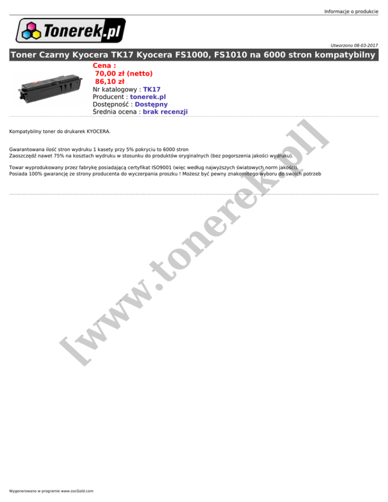 Informacje o produkcie Utworzono 08-03-2017 Toner Czarny Kyocera TK17 Kyocera FS1000, FS1010 na 6000 stron kompatybilny Cena : 70,00 zł (netto) 86,10 zł Nr katalogowy : TK17 Producent : tonerek.pl Dostępność : Dostępny Średnia ocena : brak recenzji l] Kompatybilny toner do drukarek KYOCERA. .p Gwarantowana ilość stron wydruku 1 kasety przy 5% pokryciu to 6000 stron Zaoszczędź nawet 75% na kosztach wydruku w stosunku do produktów oryginalnych (bez pogorszenia jakości wydruku). [w w w .t on er ek Towar wyprodukowany przez fabrykę posiadającą certyfikat ISO9001 (więc według najwyższych światowych norm jakości). Posiada 100% gwarancję ze strony producenta do wyczerpania proszku ! Możesz być pewny znakomitego wyboru do swoich potrzeb Wygenerowano w programie www.oscGold.com