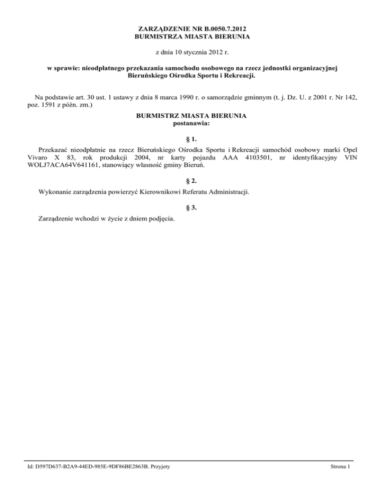 ZARZĄDZENIE NR B.0050.7.2012 BURMISTRZA MIASTA BIERUNIA z dnia 10 stycznia 2012 r. w sprawie: nieodpłatnego przekazania samochodu osobowego na rzecz jednostki organizacyjnej Bieruńskiego Ośrodka Sportu i Rekreacji. Na podstawie art. 30 ust. 1 ustawy z dnia 8 marca 1990 r. o samorządzie gminnym (t. j. Dz. U. z 2001 r. Nr 142, poz. 1591 z późn. zm.) BURMISTRZ MIASTA BIERUNIA postanawia: § 1. Przekazać nieodpłatnie na rzecz Bieruńskiego Ośrodka Sportu i Rekreacji samochód osobowy marki Opel Vivaro X 83, rok produkcji 2004, nr karty pojazdu AAA 4103501, nr identyfikacyjny VIN WOLJ7ACA64V641161, stanowiący własność gminy Bieruń. § 2. Wykonanie zarządzenia powierzyć Kierownikowi Referatu Administracji. § 3. Zarządzenie wchodzi w życie z dniem podjęcia. Id: D597D637-B2A9-44ED-985E-9DF86BE2863B. Przyjety Strona 1