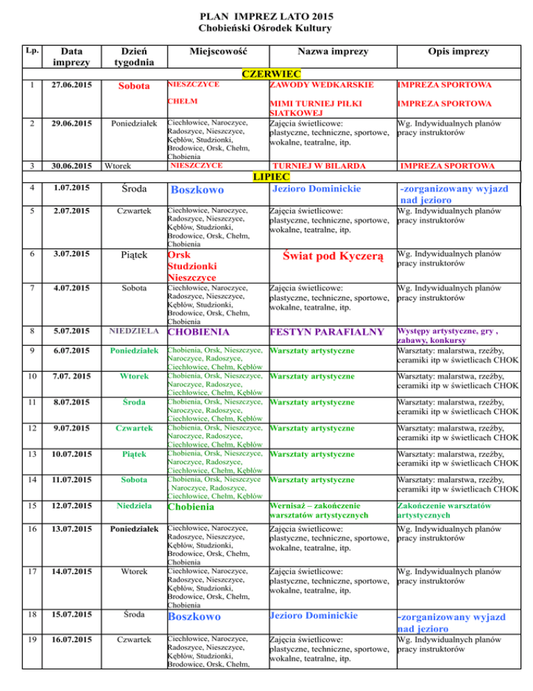 PLAN IMPREZ LATO 2015 Chobieński Ośrodek Kultury Lp. Data imprezy 1 27.06.2015 Dzień tygodnia Miejscowość Nazwa imprezy Opis imprezy CZERWIEC 2 29.06.2015 3 30.06.2015 Sobota Poniedziałek Wtorek NIESZCZYCE ZAWODY WEDKARSKIE CHEŁM MIMI TURNIEJ PIŁKI IMPREZA SPORTOWA SIATKOWEJ Zajęcia świetlicowe: Wg. Indywidualnych planów plastyczne, techniczne, sportowe, pracy instruktorów wokalne, teatralne, itp. Ciechłowice, Naroczyce, Radoszyce, Nieszczyce, Kębłów, Studzionki, Brodowice, Orsk, Chełm, Chobienia NIESZCZYCE TURNIEJ W BILARDA LIPIEC Jezioro Dominickie IMPREZA SPORTOWA IMPREZA SPORTOWA 4 1.07.2015 Środa 5 2.07.2015 Czwartek 6 3.07.2015 Piątek Orsk Studzionki Nieszczyce 7 4.07.2015 Sobota Ciechłowice, Naroczyce, Radoszyce, Nieszczyce, Kębłów, Studzionki, Brodowice, Orsk, Chełm, Chobienia Zajęcia świetlicowe: Wg. Indywidualnych planów plastyczne, techniczne, sportowe, pracy instruktorów wokalne, teatralne, itp. 8 5.07.2015 NIEDZIELA CHOBIENIA FESTYN PARAFIALNY 9 6.07.2015 Poniedziałek Chobienia, Orsk, Nieszczyce, Warsztaty artystyczne 10 7.07. 2015 Wtorek 11 8.07.2015 Środa 12 9.07.2015 Czwartek 13 10.07.2015 Piątek 14 11.07.2015 Sobota 15 12.07.2015 Niedziela 16 13.07.2015 17 14.07.2015 Wtorek 18 15.07.2015 Środa 19 16.07.2015 Czwartek Boszkowo Ciechłowice, Naroczyce, Radoszyce, Nieszczyce, Kębłów, Studzionki, Brodowice, Orsk, Chełm, Chobienia Naroczyce, Radoszyce, Ciechłowice, Chełm, Kębłów Chobienia, Orsk, Nieszczyce, Naroczyce, Radoszyce, Ciechłowice, Chełm, Kębłów Chobienia, Orsk, Nieszczyce, Naroczyce, Radoszyce, Ciechłowice, Chełm, Kębłów Chobienia, Orsk, Nieszczyce, Naroczyce, Radoszyce, Ciechłowice, Chełm, Kębłów Chobienia, Orsk, Nieszczyce, Naroczyce, Radoszyce, Ciechłowice, Chełm, Kębłów Chobienia, Orsk, Nieszczyce , Naroczyce, Radoszyce, Ciechłowice, Chełm, Kębłów Chobienia Poniedziałek Ciechłowice, Naroczyce, Radoszyce, Nieszczyce, Kębłów, Studzionki, Brodowice, Orsk, Chełm, Chobienia Ciechłowice, Naroczyce, Radoszyce, Nieszczyce, Kębłów, Studzionki, Brodowice, Orsk, Chełm, Chobienia -zorganizowany wyjazd nad jezioro Zajęcia świetlicowe: Wg. Indywidualnych planów plastyczne, techniczne, sportowe, pracy instruktorów wokalne, teatralne, itp. Świat pod Kyczerą Wg. Indywidualnych planów pracy instruktorów Występy artystyczne, gry , zabawy, konkursy Warsztaty: malarstwa, rzeźby, ceramiki itp w świetlicach CHOK Warsztaty artystyczne Warsztaty: malarstwa, rzeźby, ceramiki itp w świetlicach CHOK Warsztaty artystyczne Warsztaty: malarstwa, rzeźby, ceramiki itp w świetlicach CHOK Warsztaty artystyczne Warsztaty: malarstwa, rzeźby, ceramiki itp w świetlicach CHOK Warsztaty artystyczne Warsztaty: malarstwa, rzeźby, ceramiki itp w świetlicach CHOK Warsztaty artystyczne Warsztaty: malarstwa, rzeźby, ceramiki itp w świetlicach CHOK Wernisaż – zakończenie warsztatów artystycznych Zakończenie warsztatów artystycznych Zajęcia świetlicowe: Wg. Indywidualnych planów plastyczne, techniczne, sportowe, pracy instruktorów wokalne, teatralne, itp. Zajęcia świetlicowe: Wg. Indywidualnych planów plastyczne, techniczne, sportowe, pracy instruktorów wokalne, teatralne, itp. Boszkowo Jezioro Dominickie Ciechłowice, Naroczyce, Radoszyce, Nieszczyce, Kębłów, Studzionki, Brodowice, Orsk, Chełm, Zajęcia świetlicowe: Wg. Indywidualnych planów plastyczne, techniczne, sportowe, pracy instruktorów wokalne, teatralne, itp. -zorganizowany wyjazd nad jezioro 20 17.07.2015 Piątek 21 18.07.2015 Sobota 22 23 19.07.2015 20.07.2015 Niedziela Poniedziałek 24 25 21.07.2015 22.07.2015 Wtorek Środa 26 23.07.2015 Czwartek 27 24.07.2015 Piątek 28 25.07.2015 Sobota 29 30 26.07.2015 27.07.2015 Niedziela Poniedziałek 31 28.07.2015 Wtorek 32 29.07.2015 Środa 33 30.07.2015 Czwartek 34 31.07.2015 35 Chobienia Ciechłowice, Naroczyce, Radoszyce, Nieszczyce, Kębłów, Studzionki, Brodowice, Orsk, Chełm, Chobienia Zajęcia świetlicowe: Wg. Indywidualnych planów plastyczne, techniczne, sportowe, pracy instruktorów wokalne, teatralne, itp. PRAGA Wycieczka Orsk Festyn letni xxxxxxx Ciechłowice, Naroczyce, Radoszyce, Nieszczyce, Kębłów, Studzionki, Brodowice, Orsk, Chełm, Chobienia Góra Ślęża Ciechłowice, Naroczyce, Radoszyce, Nieszczyce, Kębłów, Studzionki, Brodowice, Orsk, Chełm, Chobienia Ciechłowice, Naroczyce, Radoszyce, Nieszczyce, Kębłów, Studzionki, Brodowice, Orsk, Chełm, Chobienia -występy artystyczne, -gry i zabawy -zabawa taneczna -turniej piłki nożnej /siatkowej xxxxxxx xxxxxxx Zajęcia świetlicowe: Wg. Indywidualnych planów plastyczne, techniczne, sportowe, pracy instruktorów wokalne, teatralne, itp. Wycieczka -wycieczka krajoznawcza Zajęcia świetlicowe: Wg. Indywidualnych planów plastyczne, techniczne, sportowe, pracy instruktorów wokalne, teatralne, itp. Zajęcia świetlicowe: Wg. Indywidualnych planów plastyczne, techniczne, sportowe, pracy instruktorów wokalne, teatralne, itp. Jezioro Dominickie Boszkowo Ciechłowice, Naroczyce, Radoszyce, Nieszczyce, Kębłów, Studzionki, Brodowice, Orsk, Chełm, Chobienia xxxxxx Ciechłowice, Naroczyce, Radoszyce, Nieszczyce, Kębłów, Studzionki, Brodowice, Orsk, Chełm, Chobienia -wycieczka krajoznawcza -zorganizowany wyjazd nad jezioro Zajęcia świetlicowe: Wg. Indywidualnych planów plastyczne, techniczne, sportowe, pracy instruktorów wokalne, teatralne, itp. xxxxx xxxxx Zajęcia świetlicowe: Wg. Indywidualnych planów plastyczne, techniczne, sportowe, pracy instruktorów wokalne, teatralne, itp. Radoszyce Turniej w warcaby, układanie puzzli na czas -impreza sportowa Ciechłowice, Naroczyce, Radoszyce, Nieszczyce, Kębłów, Studzionki, Brodowice, Orsk, Chełm, Chobienia Ciechłowice, Naroczyce, Radoszyce, Nieszczyce, Kębłów, Studzionki, Brodowice, Orsk, Chełm, Chobienia Zajęcia świetlicowe: Wg. Indywidualnych planów plastyczne, techniczne, sportowe, pracy instruktorów wokalne, teatralne, itp. Piątek Boszkowo