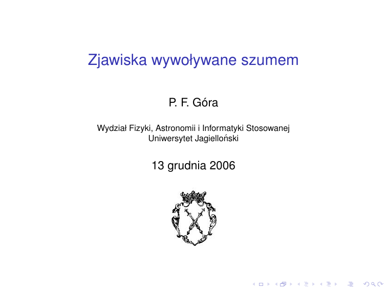 Zjawiska wywoływane szumem P. F. Góra Wydział Fizyki, Astronomii i Informatyki Stosowanej Uniwersytet Jagielloński 13 grudnia 2006 Szum przeszkadza / Ale czy zawsze?! Szum przeszkadza / Ale czy zawsze?! Zagadnienie Kramersa H. A. Kramers, Physica 7, 284 (1940). Teoria reakcji chemicznych aktywowanych termicznie. kf = Mωb ωw −βEa γ 2π e kf — stała szybkości reakcji “do przodu” −→ Teoria szybkości reakcji P. Hänggi, P. Talkner, and M. Borkovec, Rev. Mod. Phys. 62, 251 (1990) E. Pollak and P. Talkner, Chaos 15, 026116 (2005) Rezonans stochastyczny — szum może wzmacniać sygnał! Odkrycie rezonansu stochastycznego: • zwiazane ˛ jest z badaniami nad periodycznościa˛ pojawiania sie˛ epok lodowcowych (1981) • hipoteza: ziemski klimat reprezentowany jest przez dwudołkowy potencjał. Jedna ze studni reprezentuje stan o niskiej temperaturze (zlodowacenie), druga stan, w którym znajdujemy sie˛ obecnie. • zlodowacenia nastepuj ˛ a˛ średnio co 10000 lat – jedynym znanym zjawiskiem astronomicznym w tej skali czasowej sa˛ zmiany promienia orbity Ziemi w zwiazku ˛ z pewnymi zaburzeniami grawitacyjnymi • wynikajace ˛ z tego oscylacje w nateżeniu ˛ promieniowania Słońca dochodzacego ˛ do Ziemi sa˛ rz˛edu 0.1% (słaba periodyczna “siła” zewnetrzna) ˛ i sa˛ za słabe aby przerzucić klimat Ziemi z jednego stanu do drugiego • w układzie wystepuje ˛ także szum — przypadkowe, wynikajace ˛ z innych czynników zmiany nasłonecznienia; modelujemy poprzez biały szum gaussowski. • hipoteza: szum jest dostrojony tak, że poprawia odpowiedź klimatu na słabe zaburzenie zwiazane ˛ ze zmianami orbity −→ periodyczność zlodowaceń. Przykład kanoniczny Rezonans stochastyczny — wzrost stosunku wyjściowego sygnału do szumu przy zwiekszeniu ˛ poziomu szumu. Energia (swobodna) ẋ = −U 0 (x) + A sin(ωt + φ) + ξ(t) parametr Pierwsze pełne opracowanie teoretyczne: B. McNamara and K. Wiesenfeld, Phys. Rev. A 39, 4854 (1989). (1) Przykład kanoniczny Rezonans stochastyczny — wzrost stosunku wyjściowego sygnału do szumu przy zwiekszeniu ˛ poziomu szumu. Energia (swobodna) ẋ = −U 0 (x) + A sin(ωt + φ) + ξ(t) parametr Pierwsze pełne opracowanie teoretyczne: B. McNamara and K. Wiesenfeld, Phys. Rev. A 39, 4854 (1989). (1) Przykład kanoniczny Rezonans stochastyczny — wzrost stosunku wyjściowego sygnału do szumu przy zwiekszeniu ˛ poziomu szumu. Energia (swobodna) ẋ = −U 0 (x) + A sin(ωt + φ) + ξ(t) parametr Pierwsze pełne opracowanie teoretyczne: B. McNamara and K. Wiesenfeld, Phys. Rev. A 39, 4854 (1989). (1) Przykład kanoniczny Rezonans stochastyczny — wzrost stosunku wyjściowego sygnału do szumu przy zwiekszeniu ˛ poziomu szumu. Energia (swobodna) ẋ = −U 0 (x) + A sin(ωt + φ) + ξ(t) parametr Pierwsze pełne opracowanie teoretyczne: B. McNamara and K. Wiesenfeld, Phys. Rev. A 39, 4854 (1989). (1) Przykład kanoniczny Rezonans stochastyczny — wzrost stosunku wyjściowego sygnału do szumu przy zwiekszeniu ˛ poziomu szumu. Energia (swobodna) ẋ = −U 0 (x) + A sin(ωt + φ) + ξ(t) parametr Pierwsze pełne opracowanie teoretyczne: B. McNamara and K. Wiesenfeld, Phys. Rev. A 39, 4854 (1989). (1) Widmo mocy i SNR P(ω) = Pback (ω) + PΩ δ(ω − Ω) D/2 = 0.5 D/2 = 1.0 D/2 = 4.0 SNR = 10log10 PΩ Pback (ω = Ω) (2) Niedynamiczny rezonans stochastyczny x(t) = A sin(ωt) + σ ξ(t) , ( 1 x > 1, y (t) = 0 x < 1. |A| < 1 Rezonans stochastyczny dzisiaj • Reakcje biochemiczne (np. ATP–aza) • Modele klimatu (epoki lodowcowe, El Niño,. . . ) • Detektory — naturalne i sztuczne • Zastosowania biomedyczne (korektory postawy, otoskleroza,. . . ) • Modele populacyjne i społeczne • itd Aktywacja rezonansowa Na kulk˛e działa szum termiczny. Nie ma kołysania potencjałem, natomiast — okresowo lub losowo — zmienia sie˛ wysokość bariery. Dla pewnych wartości parametrów szumu transport przez bariere˛ potencjału staje sie˛ znacznie bardziej prawdopodobny. • • • wyjaśnienie zachowania pewnych typów laserów dynamika reakcji chemicznych selektywne pompy jonowe w błonach biologicznych Zależność średniego czasu potrzebnego na pokonanie bariery od cz˛estotliwości przełaczania ˛ Zebatka ˛ brownowska (Brownian ratchet) • Wariant demona Maxwella, wymyślony przez Smoluchowskiego i spopularyzowany przez Feynmanna: • Przypadkowy ruch cieplny zostaje zamieniony na ukierunkowany ruch z˛ebatki • Spreżyna ˛ także fluktuuje, zwalniajac ˛ z˛ebatk˛e! • Urzadzenie ˛ takie może wykonać dowolnie wielka˛ prace, ˛ ale. . . • . . . ponieważ czas oczekiwania na odpowiednio wielka˛ fluktuacje˛ gwałtownie rośnie, moc takiego urzadzenia ˛ daży ˛ do zera. Zebatka ˛ brownowska (Brownian ratchet) • Wariant demona Maxwella, wymyślony przez Smoluchowskiego i spopularyzowany przez Feynmanna: • Przypadkowy ruch cieplny zostaje zamieniony na ukierunkowany ruch z˛ebatki • Spreżyna ˛ także fluktuuje, zwalniajac ˛ z˛ebatk˛e! • Urzadzenie ˛ takie może wykonać dowolnie wielka˛ prace, ˛ ale. . . • . . . ponieważ czas oczekiwania na odpowiednio wielka˛ fluktuacje˛ gwałtownie rośnie, moc takiego urzadzenia ˛ daży ˛ do zera. Zebatka ˛ brownowska — wydanie współczesne Jeśli “rozprostujemy” z˛ebatk˛e, dostaniemy potencjał okresowy, ale o złamanej symetrii zwierciadlanej. Dodajmy zewnetrzn ˛ a˛ siłe˛ okresowa, ˛ kołyszac ˛ a˛ zebatka: ˛ Dodajmy biały szum gaussowski i otrzymamy transport, mimo iż średnia siła działajaca ˛ na czastk˛ ˛ e znika! M. O. Magnasco, Phys. Rev. Lett. 71, 1477 (1993). Zebatka ˛ brownowska — wydanie współczesne Jeśli “rozprostujemy” z˛ebatk˛e, dostaniemy potencjał okresowy, ale o złamanej symetrii zwierciadlanej. Dodajmy zewnetrzn ˛ a˛ siłe˛ okresowa, ˛ kołyszac ˛ a˛ zebatka: ˛ Dodajmy biały szum gaussowski i otrzymamy transport, mimo iż średnia siła działajaca ˛ na c