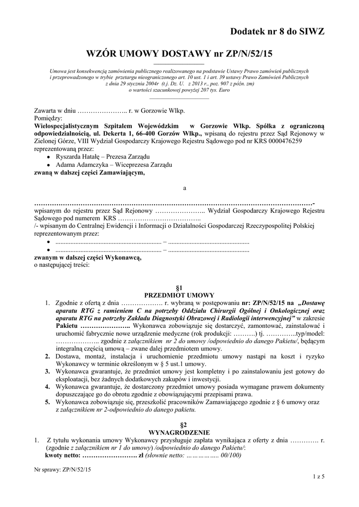 Dodatek nr 8 do SIWZ WZÓR UMOWY DOSTAWY nr ZP/N/52/15 _____________________ Umowa jest konsekwencją zamówienia publicznego realizowanego na podstawie Ustawy Prawo zamówień publicznych i przeprowadzonego w trybie przetargu nieograniczonego art. 10 ust. 1 i art. 39 ustawy Prawo Zamówień Publicznych z dnia 29 stycznia 2004r (t.j. Dz. U. z 2013 r., poz. 907 z późn. zm) o wartości szacunkowej powyżej 207 tys. Euro ______________________ Zawarta w dniu ………………….. r. w Gorzowie Wlkp. Pomiędzy: Wielospecjalistycznym Szpitalem Wojewódzkim w Gorzowie Wlkp. Spółka z ograniczoną odpowiedzialnością, ul. Dekerta 1, 66-400 Gorzów Wlkp., wpisaną do rejestru przez Sąd Rejonowy w Zielonej Górze, VIII Wydział Gospodarczy Krajowego Rejestru Sądowego pod nr KRS 0000476259 reprezentowaną przez: Ryszarda Hatałę – Prezesa Zarządu Adama Adamczyka – Wiceprezesa Zarządu zwaną w dalszej części Zamawiającym, a ………………………………………………………………………………………………………………wpisanym do rejestru przez Sąd Rejonowy ………………….. Wydział Gospodarczy Krajowego Rejestru Sądowego pod numerem KRS ……………………………….. /- wpisanym do Centralnej Ewidencji i Informacji o Działalności Gospodarczej Rzeczypospolitej Polskiej reprezentowanym przez: ................................................................ – ................................................. ................................................................ – ................................................. zwanym w dalszej części Wykonawcą, o następującej treści: 1. 2. 3. 4. 5. §1 PRZEDMIOT UMOWY Zgodnie z ofertą z dnia ………………. r. wybraną w postępowaniu nr: ZP/N/52/15 na „Dostawę aparatu RTG z ramieniem C na potrzeby Oddziału Chirurgii Ogólnej i Onkologicznej oraz aparatu RTG na potrzeby Zakładu Diagnostyki Obrazowej i Radiologii interwencyjnej” w zakresie Pakietu ………………….. Wykonawca zobowiązuje się dostarczyć, zamontować, zainstalować i uruchomić fabrycznie nowe urządzenie medyczne (rok produkcji: ……….) tj. …………..typ/model: ……………….. zgodnie z załącznikiem nr 2 do umowy /odpowiednio do danego Pakietu/, będącym integralną częścią umową – zwane dalej przedmiotem umowy. Dostawa, montaż, instalacja i uruchomienie przedmiotu umowy nastąpi na koszt i ryzyko Wykonawcy w terminie określonym w § 5 ust.1 umowy. Wykonawca gwarantuje, że przedmiot umowy jest kompletny i po zainstalowaniu jest gotowy do eksploatacji, bez żadnych dodatkowych zakupów i inwestycji. Wykonawca gwarantuje, że dostarczony przedmiot umowy posiada wymagane prawem dokumenty dopuszczające go do obrotu zgodnie z obowiązującymi przepisami prawa. Wykonawca zobowiązuje się, przeszkolić pracowników Zamawiającego zgodnie z § 6 umowy oraz z załącznikiem nr 2-odpowiednio do danego pakietu. §2 WYNAGRODZENIE 1. Z tytułu wykonania umowy Wykonawcy przysługuje zapłata wynikająca z oferty z dnia …………. r. (zgodnie z załącznikiem nr 1 do umowy) /odpowiednio do danego Pakietu/: kwoty netto: ……………………. zł (słownie netto: …………….. 00/100) Nr sprawy: ZP/N/52/15 1z5 kwoty brutto: …………………… zł (słownie brutto: …………………. 00100) 2. Cena określona w ust. 1 obliczona jest na podstawie przedstawionej przez Wykonawcę kalkulacji i pokrywa wszystkie koszty związane z realizacją całej umowy, w tym m.in.: podatek VAT, koszty transportu, wniesienia, rozpakowania, koszty montażu, instalacji i uruchomienia, przeszkolenia pracowników Zamawiającego w zakresie obsługi aparatu, koszty gwarancji, serwisów oraz przeglądów serwisowych w okresie obowiązywania gwarancji. 1. 2. 3. 4. 5. 6. 7. 1. 2. 3. 4. 5. 6. 7. 8. 9. 10. 11. §3 PŁATNOŚCI Podstawą wystawienia faktury za wykonanie umowy jest protokół końcowy, o którym mowa w §5 ust. 5. Zamawiający zobowiązuje się zapłacić kwotę brutto określoną w §2 ust. 1 jednorazowo przelewem na konto Wykonawcy wskazane na fakturze VAT Termin płatności – 30 dni od daty otrzymania prawidłowo wystawionej faktury VAT. Za dzień realizacji płatności uznaje się dzień obciążenia rachunku bankowego Zamawiającego. Zamawiający upoważnia Wykonawcę do wystawienia faktury bez podpisu Zamawiającego. Zamawiający oświadcza, że jest płatnikiem VAT i posiada NIP ………………………… Wykonawca oświadcza, że jest płatnikiem VAT i posiada NIP …………………………. §4 WARUNKI GWARANCJI I SERWISU Wykonawca udziela gwarancji obejmującej cały przedmiot umowy wraz z serwisem gwarancyjnym na okres.……………. (min. 24 miesiące dla Pakietu 1 i min. 12 miesięcy dla Pakietu 2) od dostawy i uruchomienia przedmiotu umowy, potwierdzonego protokołem, o którym mowa w §5 ust. 5 umowy. Termin gwarancji ulega przedłużeniu o czas liczony od daty zgłoszenia uszkodzenia do daty zakończenia naprawy uszkodzenia. W okresie obowiązywania gwarancji Wykonawca gwarantuje wykonanie na koszt Wykonawcy: a) min. 1 przeglądu serwisowego rocznie z uwzględnieniem warunków producenta sprzętu. Pierwszy przegląd winien nastąpić w 12 miesiącu licząc od dnia podpisania protokołu, o którym mowa w §5 ust. 5. Termin, ostatniego przeglądu winien nastąpić w ostatnim miesiącu przed upływem terminu gwarancji; b) 1 x na 12 m-cy testów specjalistycznych Zgodnie z Rozporządzeniem Ministra Zdrowia z dnia 18 lutego 2011 roku w sprawie warunków bezpiecznego stosowania promieniowania jonizującego dla wszystkich rodzajów ekspozycji medycznej. Wykonawca gwarantuje, że wszelkie urządzenia składające się na przedmiot umowy są kompatybilne ze sobą, a ich wspólne funkcjonowanie nie spowoduje utraty gwarancji producentów elementów składowych. Wykonawca wraz z dostawą przedmiotu umowy dostarczy Zamawiającemu wykaz podmiotów, upoważnionych pr