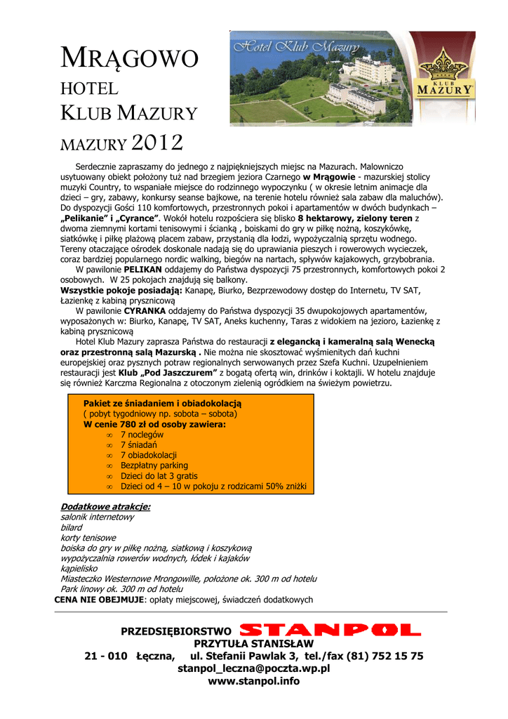 MRĄGOWO HOTEL KLUB MAZURY MAZURY 2012 Serdecznie zapraszamy do jednego z najpiękniejszych miejsc na Mazurach. Malowniczo usytuowany obiekt położony tuż nad brzegiem jeziora Czarnego w Mrągowie - mazurskiej stolicy muzyki Country, to wspaniałe miejsce do rodzinnego wypoczynku ( w okresie letnim animacje dla dzieci – gry, zabawy, konkursy seanse bajkowe, na terenie hotelu również sala zabaw dla maluchów). Do dyspozycji Gości 110 komfortowych, przestronnych pokoi i apartamentów w dwóch budynkach – „Pelikanie” i „Cyrance”. Wokół hotelu rozpościera się blisko 8 hektarowy, zielony teren z dwoma ziemnymi kortami tenisowymi i ścianką , boiskami do gry w piłkę nożną, koszykówkę, siatkówkę i piłkę plażową placem zabaw, przystanią dla łodzi, wypożyczalnią sprzętu wodnego. Tereny otaczające ośrodek doskonale nadają się do uprawiania pieszych i rowerowych wycieczek, coraz bardziej popularnego nordic walking, biegów na nartach, spływów kajakowych, grzybobrania. W pawilonie PELIKAN oddajemy do Państwa dyspozycji 75 przestronnych, komfortowych pokoi 2 osobowych. W 25 pokojach znajdują się balkony. Wszystkie pokoje posiadają: Kanapę, Biurko, Bezprzewodowy dostęp do Internetu, TV SAT, Łazienkę z kabiną prysznicową W pawilonie CYRANKA oddajemy do Państwa dyspozycji 35 dwupokojowych apartamentów, wyposażonych w: Biurko, Kanapę, TV SAT, Aneks kuchenny, Taras z widokiem na jezioro, Łazienkę z kabiną prysznicową Hotel Klub Mazury zaprasza Państwa do restauracji z elegancką i kameralną salą Wenecką oraz przestronną salą Mazurską . Nie można nie skosztować wyśmienitych dań kuchni europejskiej oraz pysznych potraw regionalnych serwowanych przez Szefa Kuchni. Uzupełnieniem restauracji jest Klub „Pod Jaszczurem” z bogatą ofertą win, drinków i koktajli. W hotelu znajduje się również Karczma Regionalna z otoczonym zielenią ogródkiem na świeżym powietrzu. Pakiet ze śniadaniem i obiadokolacją ( pobyt tygodniowy np. sobota – sobota) W cenie 780 zł od osoby zawiera: • 7 noclegów • 7 śniadań • 7 obiadokolacji • Bezpłatny parking • Dzieci do lat 3 gratis • Dzieci od 4 – 10 w pokoju z rodzicami 50% zniżki Dodatkowe atrakcje: salonik internetowy bilard korty tenisowe boiska do gry w piłkę nożną, siatkową i koszykową wypożyczalnia rowerów wodnych, łódek i kajaków kąpielisko Miasteczko Westernowe Mrongowille, położone ok. 300 m od hotelu Park linowy ok. 300 m od hotelu CENA NIE OBEJMUJE: opłaty miejscowej, świadczeń dodatkowych PRZEDSIĘBIORSTWO PRZYTUŁA STANISŁAW 21 - 010 Łęczna, ul. Stefanii Pawlak 3, tel./fax (81) 752 15 75 [email protected] www.stanpol.info
