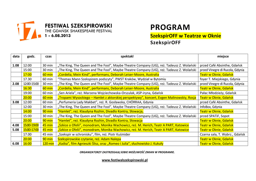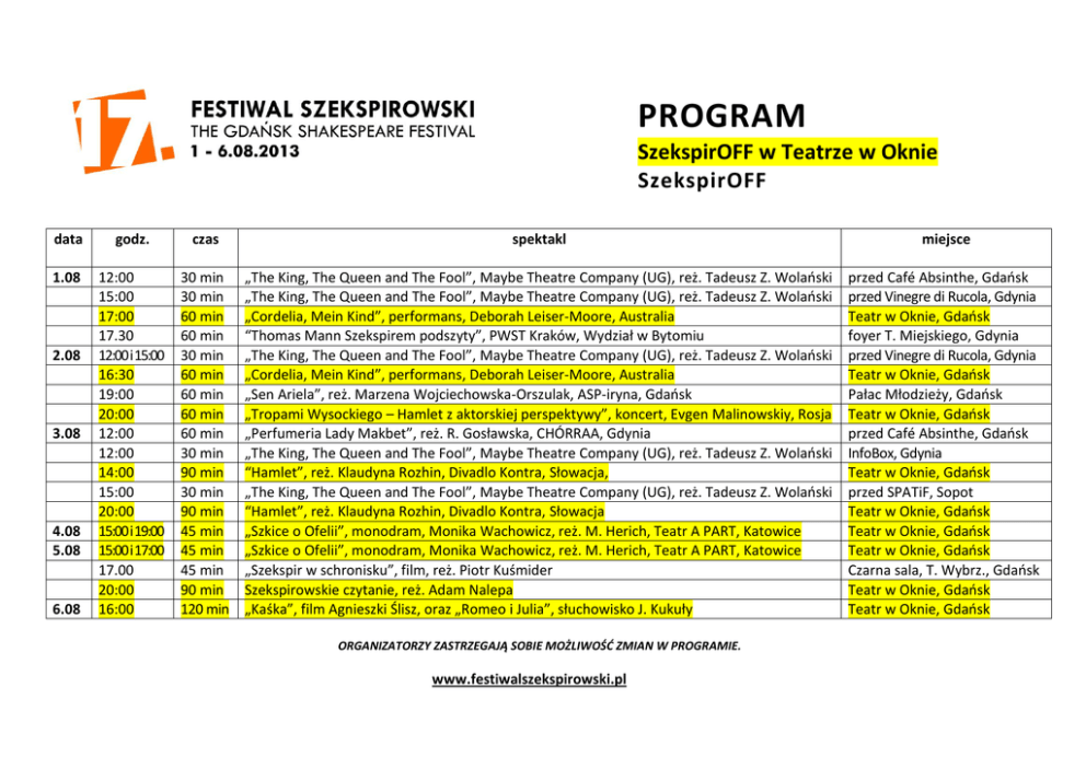 PROGRAM SzekspirOFF w Teatrze w Oknie SzekspirOFF data godz. czas spektakl miejsce 1.08 12:00 15:00 17:00 17.30 12:00 i 15:00 16:30 19:00 20:00 12:00 12:00 14:00 15:00 20:00 15:00 i 19:00 15:00 i 17:00 17.00 20:00 16:00 30 min 30 min 60 min 60 min 30 min 60 min 60 min 60 min 60 min 30 min 90 min 30 min 90 min 45 min 45 min 45 min 90 min 120 min „The King, The Queen and The Fool”, Maybe Theatre Company (UG), reż. Tadeusz Z. Wolański „The King, The Queen and The Fool”, Maybe Theatre Company (UG), reż. Tadeusz Z. Wolański „Cordelia, Mein Kind”, performans, Deborah Leiser-Moore, Australia “Thomas Mann Szekspirem podszyty”, PWST Kraków, Wydział w Bytomiu „The King, The Queen and The Fool”, Maybe Theatre Company (UG), reż. Tadeusz Z. Wolański „Cordelia, Mein Kind”, performans, Deborah Leiser-Moore, Australia „Sen Ariela”, reż. Marzena Wojciechowska-Orszulak, ASP-iryna, Gdańsk „Tropami Wysockiego – Hamlet z aktorskiej perspektywy”, koncert, Evgen Malinowskiy, Rosja „Perfumeria Lady Makbet”, reż. R. Gosławska, CHÓRRAA, Gdynia „The King, The Queen and The Fool”, Maybe Theatre Company (UG), reż. Tadeusz Z. Wolański “Hamlet”, reż. Klaudyna Rozhin, Divadlo Kontra, Słowacja, „The King, The Queen and The Fool”, Maybe Theatre Company (UG), reż. Tadeusz Z. Wolański “Hamlet”, reż. Klaudyna Rozhin, Divadlo Kontra, Słowacja „Szkice o Ofelii”, monodram, Monika Wachowicz, reż. M. Herich, Teatr A PART, Katowice „Szkice o Ofelii”, monodram, Monika Wachowicz, reż. M. Herich, Teatr A PART, Katowice „Szekspir w schronisku”, film, reż. Piotr Kuśmider Szekspirowskie czytanie, reż. Adam Nalepa „Kaśka”, film Agnieszki Ślisz, oraz „Romeo i Julia”, słuchowisko J. Kukuły przed Café Absinthe, Gdańsk przed Vinegre di Rucola, Gdynia Teatr w Oknie, Gdańsk foyer T. Miejskiego, Gdynia przed Vinegre di Rucola, Gdynia Teatr w Oknie, Gdańsk Pałac Młodzieży, Gdańsk Teatr w Oknie, Gdańsk przed Café Absinthe, Gdańsk InfoBox, Gdynia Teatr w Oknie, Gdańsk przed SPATiF, Sopot Teatr w Oknie, Gdańsk Teatr w Oknie, Gdańsk Teatr w Oknie, Gdańsk Czarna sala, T. Wybrz., Gdańsk Teatr w Oknie, Gdańsk Teatr w Oknie, Gdańsk 2.08 3.08 4.08 5.08 6.08 ORGANIZATORZY ZASTRZEGAJĄ SOBIE MOŻLIWOŚĆ ZMIAN W PROGRAMIE. www.festiwalszekspirowski.pl
