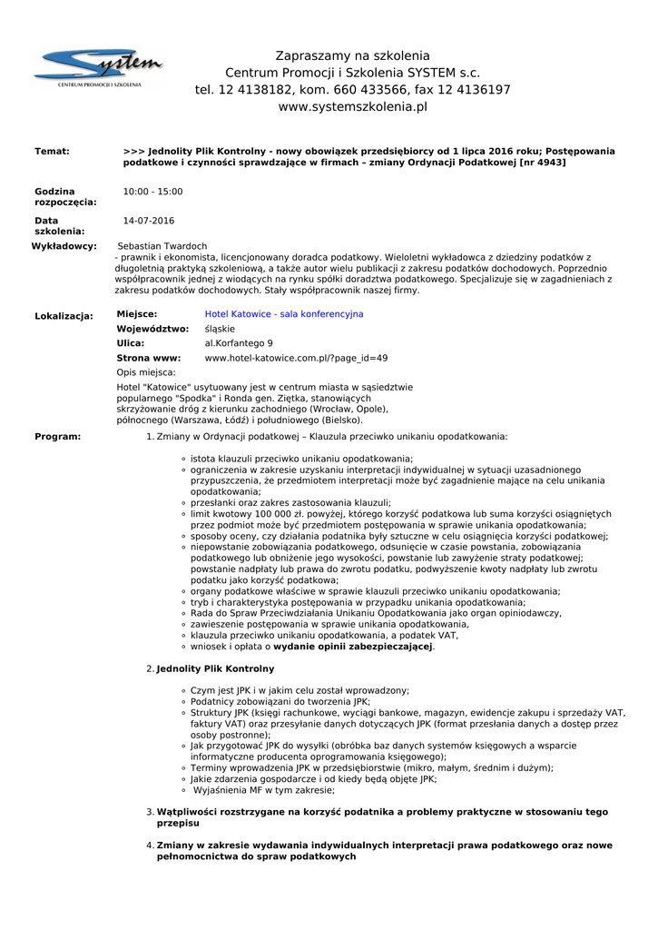 Zapraszamy na szkolenia Centrum Promocji i Szkolenia SYSTEM s.c. tel. 12 4138182, kom. 660 433566, fax 12 4136197 www.systemszkolenia.pl Temat: >>> Jednolity Plik Kontrolny - nowy obowiązek przedsiębiorcy od 1 lipca 2016 roku; Postępowania podatkowe i czynności sprawdzające w firmach – zmiany Ordynacji Podatkowej [nr 4943] Godzina rozpoczęcia: 10:00 - 15:00 Data szkolenia: 14-07-2016 Wykładowcy: Lokalizacja: Sebastian SebastianTwardoch Twardoch - -prawnik prawniki iekonomista, ekonomista,licencjonowany licencjonowanydoradca doradcapodatkowy. podatkowy.Wieloletni Wieloletniwykładowca wykładowcazzdziedziny dziedzinypodatków podatkówzz długoletnią długoletniąpraktyką praktykąszkoleniową, szkoleniową,aatakże takżeautor autorwielu wielupublikacji publikacjizzzakresu zakresupodatków podatkówdochodowych. dochodowych.Poprzednio Poprzednio współpracownik współpracownikjednej jednejzzwiodących wiodącychna narynku rynkuspółki spółkidoradztwa doradztwapodatkowego. podatkowego.Specjalizuje Specjalizujesię sięwwzagadnieniach zagadnieniachzz zakresu zakresupodatków podatkówdochodowych. dochodowych.Stały Staływspółpracownik współpracowniknaszej naszejfirmy. firmy. Miejsce: Hotel Katowice - sala konferencyjna Miejsce: Hotel Katowice - sala konferencyjna Województwo: Województwo: śląskie śląskie Ulica: al.Korfantego 99 Ulica: al.Korfantego Strona www: Strona www: Opis miejsca: Opis miejsca: www.hotel-katowice.com.pl/?page_id=49 www.hotel-katowice.com.pl/?page_id=49 Hotel "Katowice" usytuowany jest ww centrum miasta ww sąsiedztwie Hotel "Katowice" usytuowany jest centrum miasta sąsiedztwie popularnego "Spodka" i Ronda gen. Ziętka, stanowiących popularnego "Spodka" i Ronda gen. Ziętka, stanowiących skrzyżowanie dróg z kierunku zachodniego (Wrocław, Opole), skrzyżowanie dróg z kierunku zachodniego (Wrocław, Opole), północnego (Warszawa, Łódź) i południowego (Bielsko). północnego (Warszawa, Łódź) i południowego (Bielsko). Program: 1. Zmiany w Ordynacji podatkowej – Klauzula przeciwko unikaniu opodatkowania: istota klauzuli przeciwko unikaniu opodatkowania; ograniczenia w zakresie uzyskaniu interpretacji indywidualnej w sytuacji uzasadnionego przypuszczenia, że przedmiotem interpretacji może być zagadnienie mające na celu unikania opodatkowania; przesłanki oraz zakres zastosowania klauzuli; limit kwotowy 100 000 zł. powyżej, którego korzyść podatkowa lub suma korzyści osiągniętych przez podmiot może być przedmiotem postępowania w sprawie unikania opodatkowania; sposoby oceny, czy działania podatnika były sztuczne w celu osiągnięcia korzyści podatkowej; niepowstanie zobowiązania podatkowego, odsunięcie w czasie powstania, zobowiązania podatkowego lub obniżenie jego wysokości, powstanie lub zawyżenie straty podatkowej; powstanie nadpłaty lub prawa do zwrotu podatku, podwyższenie kwoty nadpłaty lub zwrotu podatku jako korzyść podatkowa; organy podatkowe właściwe w sprawie klauzuli przeciwko unikaniu opodatkowania; tryb i charakterystyka postępowania w przypadku unikania opodatkowania; Rada do Spraw Przeciwdziałania Unikaniu Opodatkowania jako organ opiniodawczy, zawieszenie postępowania w sprawie unikania opodatkowania, klauzula przeciwko unikaniu opodatkowania, a podatek VAT, wniosek i opłata o wydanie opinii zabezpieczającej. 2. Jednolity Plik Kontrolny Czym jest JPK i w jakim celu został wprowadzony; Podatnicy zobowiązani do tworzenia JPK; Struktury JPK (księgi rachunkowe, wyciągi bankowe, magazyn, ewidencje zakupu i sprzedaży VAT, faktury VAT) oraz przesyłanie danych dotyczących JPK (format przesłania danych a dostęp przez osoby postronne); Jak przygotować JPK do wysyłki (obróbka baz danych systemów księgowych a wsparcie informatyczne producenta oprogramowania księgowego); Terminy wprowadzenia JPK w przedsiębiorstwie (mikro, małym, średnim i dużym); Jakie zdarzenia gospodarcze i od kiedy będą objęte JPK; Wyjaśnienia MF w tym zakresie; 3. Wątpliwości rozstrzygane na korzyść podatnika a problemy praktyczne w stosowaniu tego przepisu 4. Zmiany w zakresie wydawania indywidualnych interpretacji prawa podatkowego oraz nowe pełnomocnictwa do spraw podatkowych 5. Nadpłata, zwrot podatku oraz korygowanie deklaracji 6. Podmioty narażone na kontrole w 2016 r. w ramach Krajowego Planu Działań Ministerstwa Finansów 7. Wszczęcie i prowadzenie kontroli podatkowej w świetle przepisów ustawy o Swobodzie działalności gospodarczej i ustawy Ordynacji podatkowej 8. Kontrola podatkowa a czynności sprawdzające – uprawnienia organów podatkowych 9. Dowody w toku postępowania podatkowego i kontroli skarbowej 10. Pytania indywidualne i odpowiedzi. Konsultacje i dyskusja. Forma szkolenia: Szkolenie o powyższej tematyce możemy zrealizować na Państwa potrzeby w formie szkolenia zamkniętego. Zainteresowane osoby prosimy o kontakt z naszym biurem tel. 12 413-81-82 Certyfikaty: Uczestnik otrzymuje certyfikat ukończenia szkolenia Cena: Liczba osób z jednej firmy Cena jedna osoba z firmy 390.00 netto zł./osobę (479.70 zł. brutto) dwie i więcej 360.00 netto zł./osobę (442.80 zł. brutto) UWAGA: opłata za szkolenie zwolniona z VAT dla jednostek finansujących udział w szkoleniu w co najmniej 70% lub w całości ze środków publicznych. Uczestników, których dotyczy zwolnienie z VAT prosimy o wypełnienie i przesłanie podpisanego oświadczenia. POBIERZ OŚWIADCZENIE < Cena zawiera: Warunki uczestnictwa: udział w zajęciach, konsultacje autorskie materiały szkoleniowe, poczęstunek w przerwie kawowej, lunch, imienne zaświadczenie uczestnictwa Zgłoszenia uczestnictwa można dokonać przez: - formularz elektroniczny na dole tej strony (zalecane) - lub telefonicznie 12 413-81-82 - lub pisemnie, faksem 12 413-61-97 - lub przez e-mail: [email protected] • Ogólna „Karta zgłoszenia na szkolenie” jest także dostępna na naszej stronie [>>> Dokumenty do pobrania] • Z