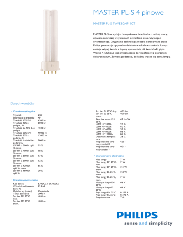 MASTER PL-S 4 pinowe MASTER PL-S 7W/830/4P 1CT MASTER PL-S to wydajna kompaktowa świetlówka o niskiej mocy, używana zazwyczaj w systemach oświetlenia dekoracyjnego i orientacyjnego. Oryginalna technologia mostka opracowana przez Philips gwarantuje optymalne działanie w takich warunkach. Lampa emituje więcej światła z lepszą sprawnością niż świetlówki gięte. Wersja 4-wtykowa jest przeznaczona do współpracy z osprzętem elektronicznym. Zawiera podstawę, do której wciska się samą lampę. Danych wyrobów • Charakterstyki ogólne Trzonek Informacje o trzonku Trwałość 10% EM Trwałość 10% z podgrz., 3h Trwałość do 10% bez podgrz Trwałość 50% EM Trwałość 50% z podgrz., 3h Trwałość średnia bez podgrz EL LSF HF c. 2000h cykl 3h znam. LSF HF c. 4000h cykl 3h znam. LSF HF c. 6000h cykl 3h znam. LSF HF c. 8000h cykl 3h znam. LSF HF c. 12000h cykl 3h znam. LSF HF z. 16000h cykl 3h 2G7 4P 6500 hr 8000 hr 4500 hr 10000 hr 13000 hr 7000 hr 99 % 98 % 97 % 92 % 66 % 30 % • Charakterystyki świetlne Kod barwy Wskaźnik oddawania barw Ra Opis barwy (tekst) Temp. barwowa Str. św. EM 25°C dop. Str. św. EM 25°C znam. 830 [CCT of 3000K] 82 Ra8 Ciepłobiała 3000 K 405 Lm 400 Lm Str. św. EL 25°C dop. Str. św. EL 25°C znam. Skut. św. znam. EM 25°C LLMF HF 2000h LLMF HF 4000h LLMF HF 6000h LLMF HF 8000h LLMF HF 12000h Optymalna temperatura Współrzędna chromatyczności X Współrzędna chromatyczności Y 405 Lm 400 Lm 62 Lm/W 95 % 92 % 90 % 88 % 86 % 28 C 435 401 - • Charakterystyki elektryczne Moc lampy Moc lampy EM 25°C, nom. Moc lampy EM 25°C, znam. Moc lampy EL 25°C, znam. Moc lampy EL 25°C, nom. Napięcie lampy EM 25°C Napięcie lampy EL 25°C Prąd lampy EM 25°C Prąd lampy EL 25°C Przyciemnianie 7W 7W 7.1 W 7.0 W 7W 46 V 46 V 0.175 A 0.175 A Tak MASTER PL-S 4 pinowe • Ochrona środowiska Klasa wydajności energetycznej Zawartość rtęci (Hg) B 1.4 mg • Wymiary produktu Długość międzytrzonkowa A Długość B Długość całkowita C Średnica D Średnica D1 96 (max) mm 113 (max) mm 119.1 (max) mm 28 (max) mm 13 (max) mm • Dane produktu Kod zamówienia Kod produktu Nazwa produktu 260734 70 871150026073470 MASTER PL-S 7W/830/4P 1CT Nazwa produktu na zamówieniu Liczba sztuk w opakowaniu Opakowanie zbiorcze Liczba opakowan w kartonie zbiorczym Kod kreskowy na produkcie Kod kreskowy na opakowaniu posrednim - EAN2 Kod kreskowy na opakowaniu zbiorczym Kod logistyczny 12NC Kod ILCOS Waga netto 1 szt. MASTER PL-S 7W/830/4P 1CT/ 5X10BOX 1 5X10CC 50 8711500260734 8711500260741 8711500260758 927935883011 FSD-7/30/1B-E-2G7 24.000 gr • Częste włączanie oraz niewystarczające wstępne nagrzanie elektrod skracają żywotność lampy Warnings and safety • Własności techniczne i elektryczne lampy zależą od warunków eksploatacji, tzn. temperatury otoczenia i pozycji roboczej, a także od użytego osprzętu sterującego HF Rysunki techniczne D D1 MASTER PL-S 7W/830/4P 1CT Product A (Max) B (Max) C (Max) D (Max) D1 (Max) 113 119.1 28 13 C B A PL-S 7W/830/4P LM 96 77 7 2G7 2013, Kwiecień 30 Dane wkrótce ulegną zmianie MASTER PL-S 4 pinowe 500 W per 5 nm per lm µW per 5 nm per Dane fotometryczne 400 300 500 400 300 200 200 100 100 300 400 500 600 700 l nm 300 400 Barwa Światła /830 500 600 700 λ nm Barwa Światła /830 © 2013 Koninklijke Philips Electronics N.V. Wszelkie prawa zastrzeżone Dane mogą ulec zmianie bez uprzedniego powiadomienia. Znak towarowy jest własnością Koninklijke Philips Electronics N.V. lub odpowiednich podmiotów . www.philips.com/lighting 2013, Kwiecień 30 Dane wkrótce ulegną zmianie